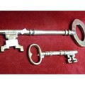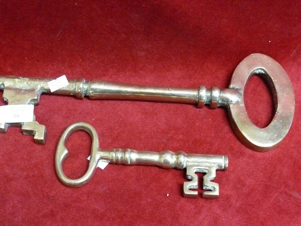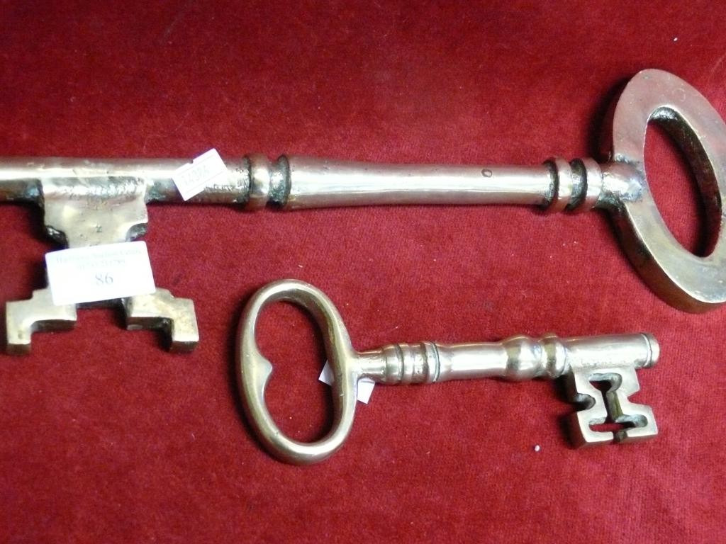 LARGE HEAVY BRASS KEY 14" LONG AND A SMALLER BRASS KEY 7" LONG