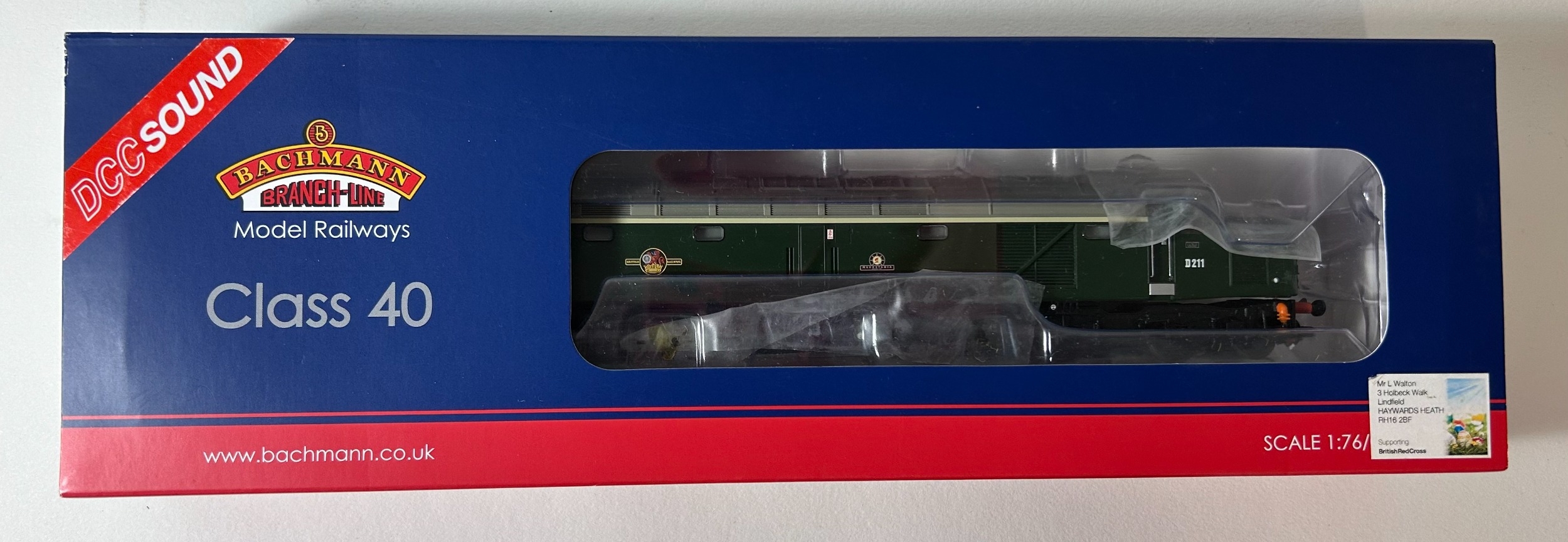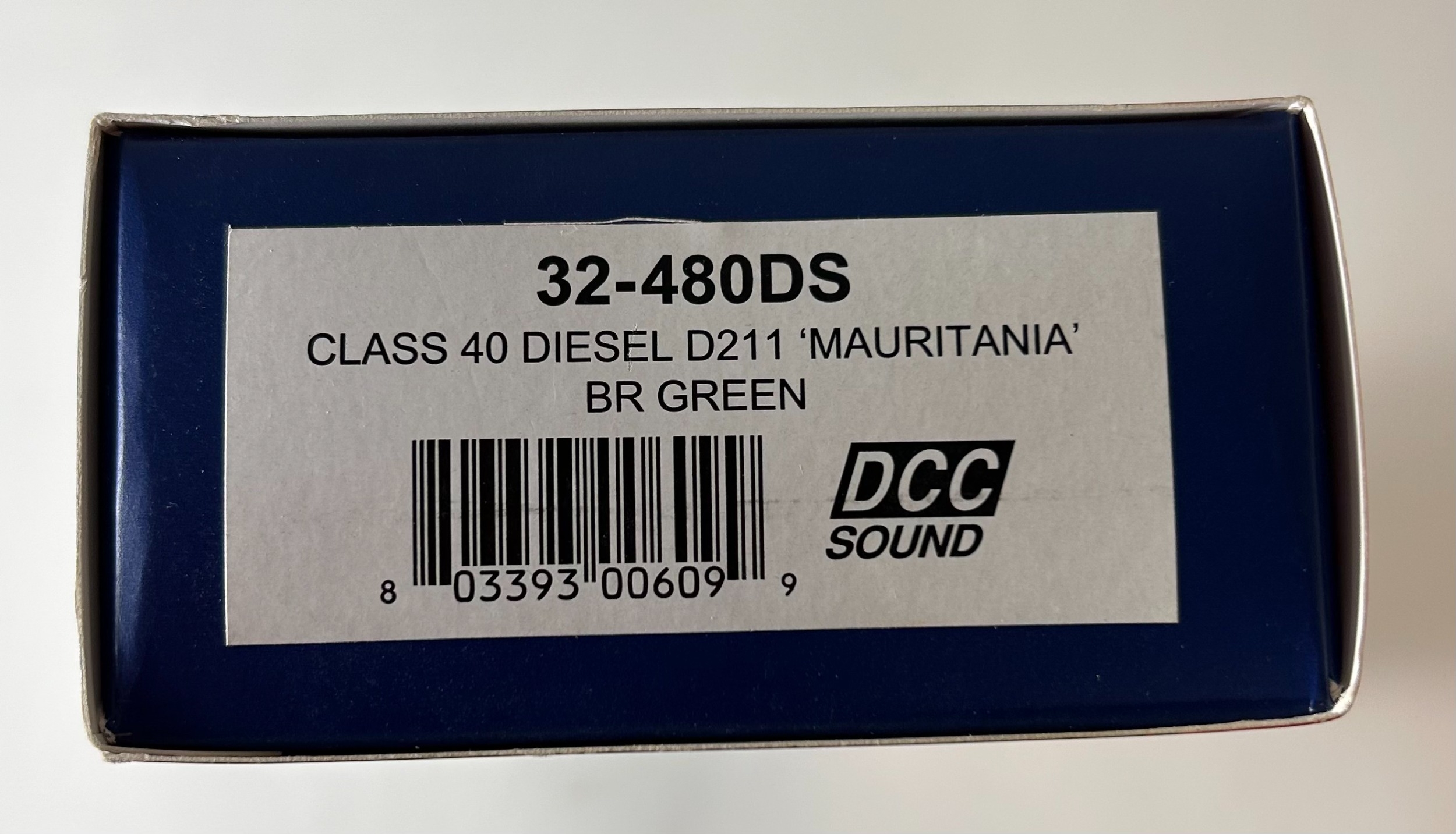Bachmann Branch-Line OO Diesel-Electric Locomotive. Class 40 D211 'Mauritania' (32-480DS). With DCC sound. In BR Green livery. Boxed, minor wear/previous owners sticker. Contents looks to be as new.
