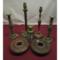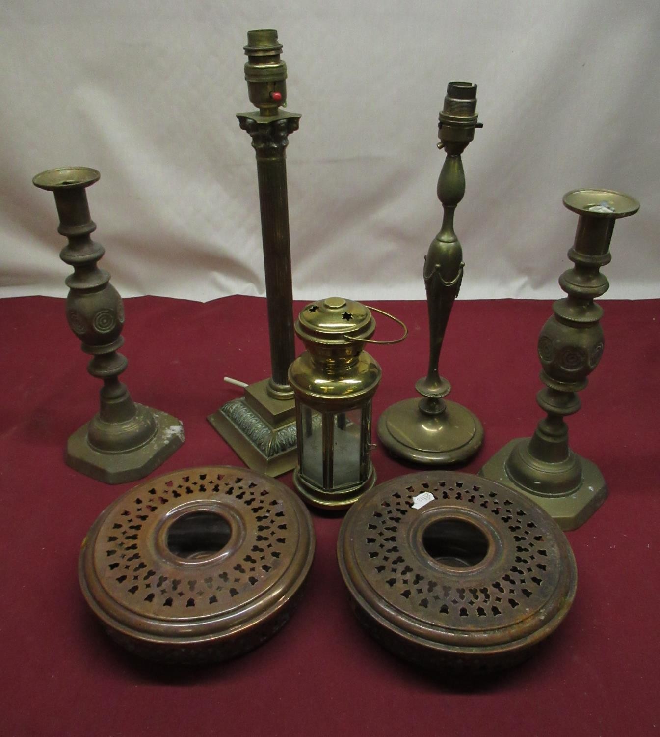 C20th brass neoclassical electric table lamp, C20th brass corinthian column table lamp, pair of C19th brass candlesticks with ejectors (4)