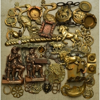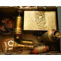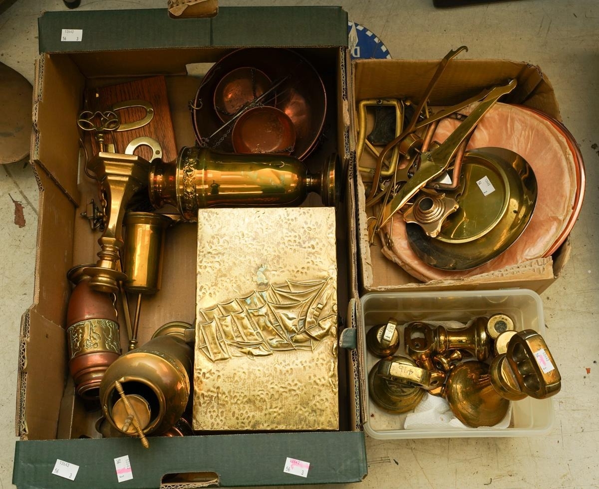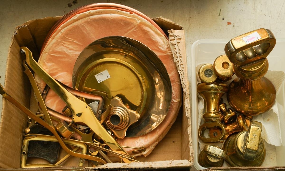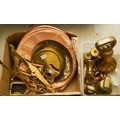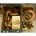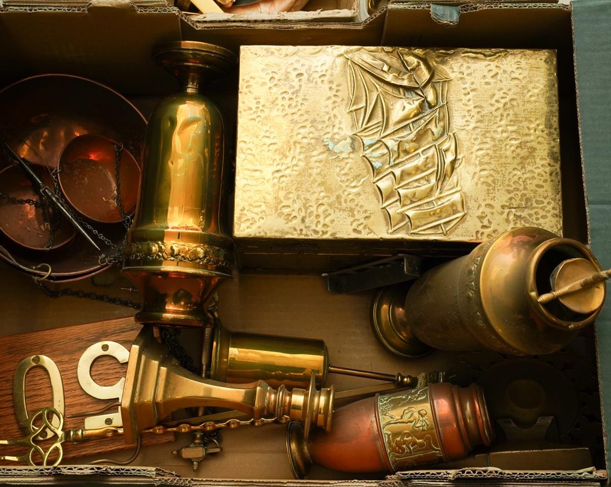 Assorted brass and copper including set of bell shaped weights, various scales, planished box, various urns, toasting fork, candlestick etc [3 boxes - Q]