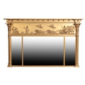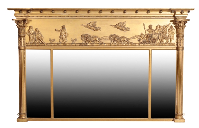 A GEORGE IV GILTWOOD AND COMPOSITION FRAMED OVERMANTEL MIRROR,, circa 1825, the inverted breakfront cornice with applied spheres, above a frieze of a Bacchic procession in relief, the three bevelled plates flanked by reeded pilasters with Composite capitals, 90cm high, 143cm wide