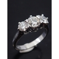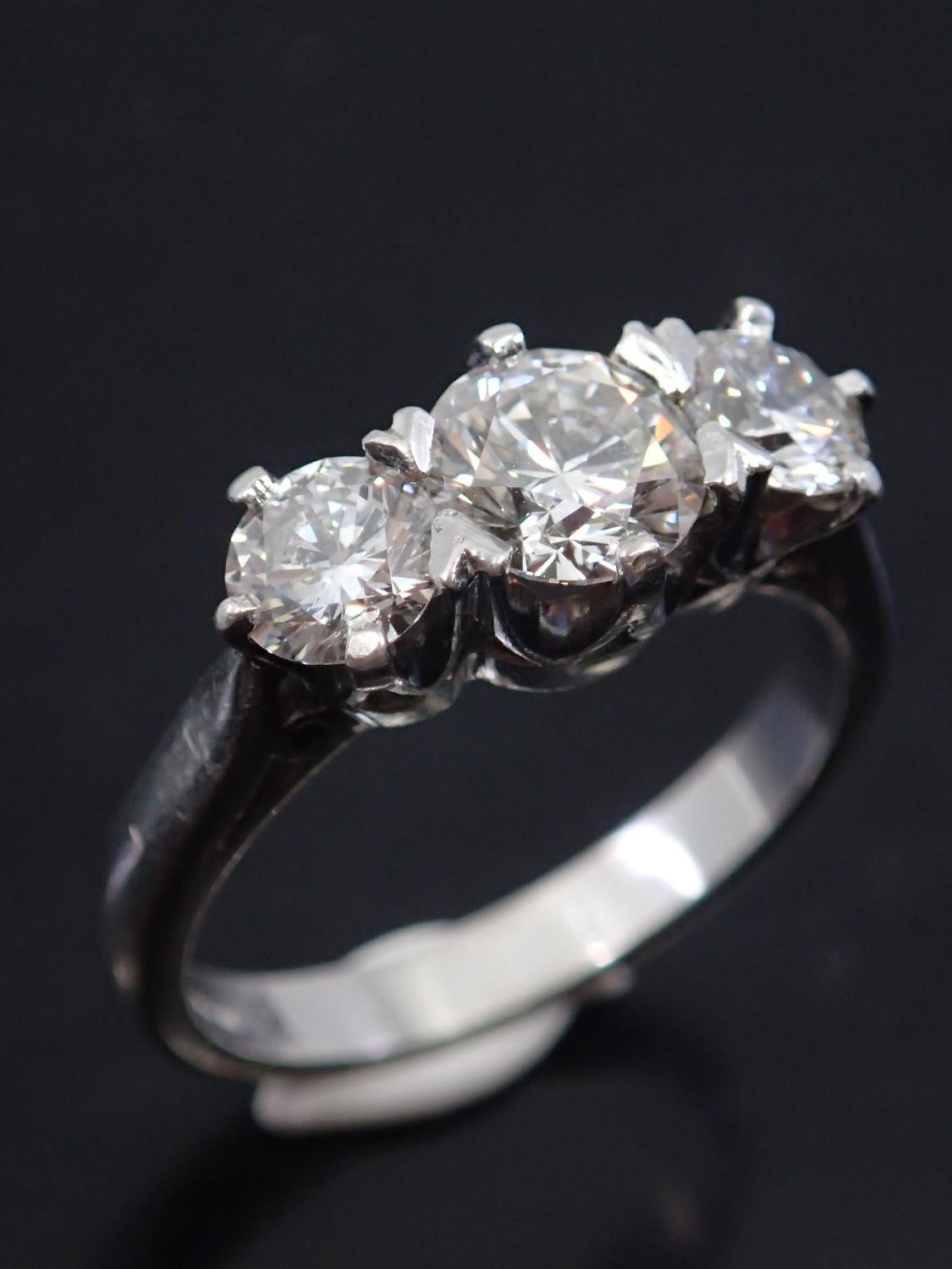 A fine diamond three stone ring set in platinum with a copy of a valuation which states the total diamond weight is 1.50cts H colour and VS clarity valued at â¬10,000 Oct 2005 finger size approx. K