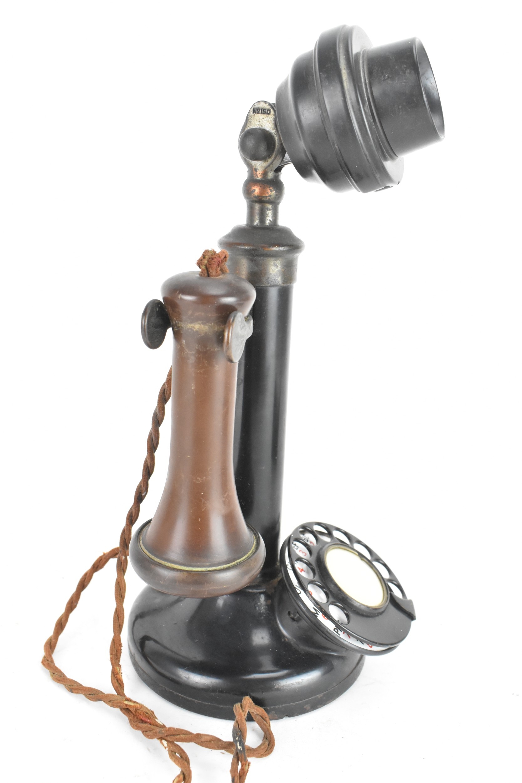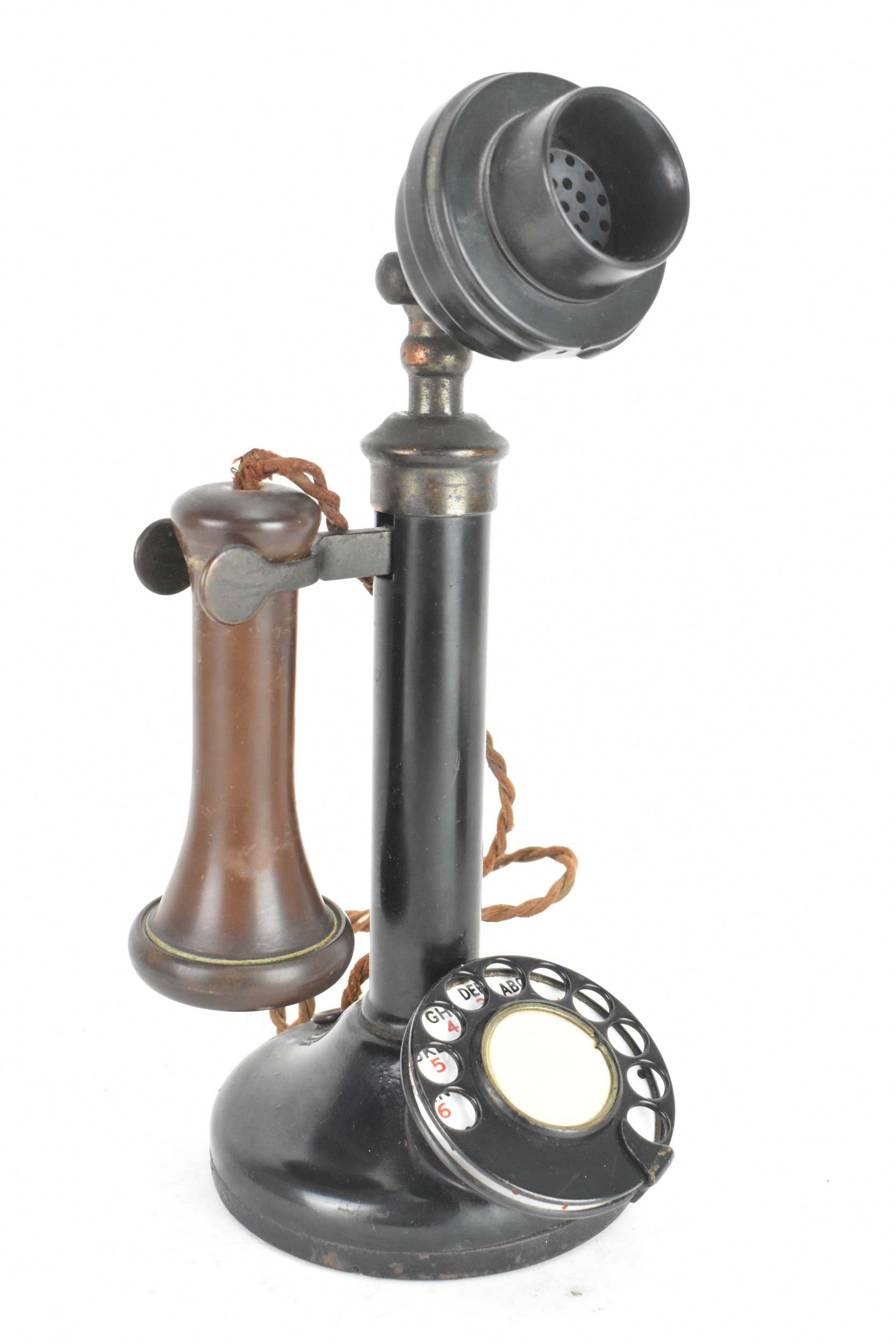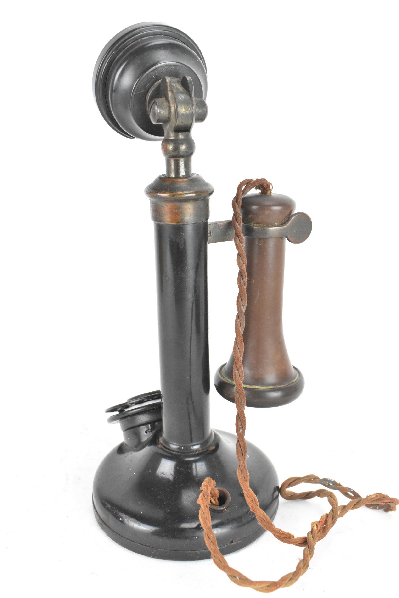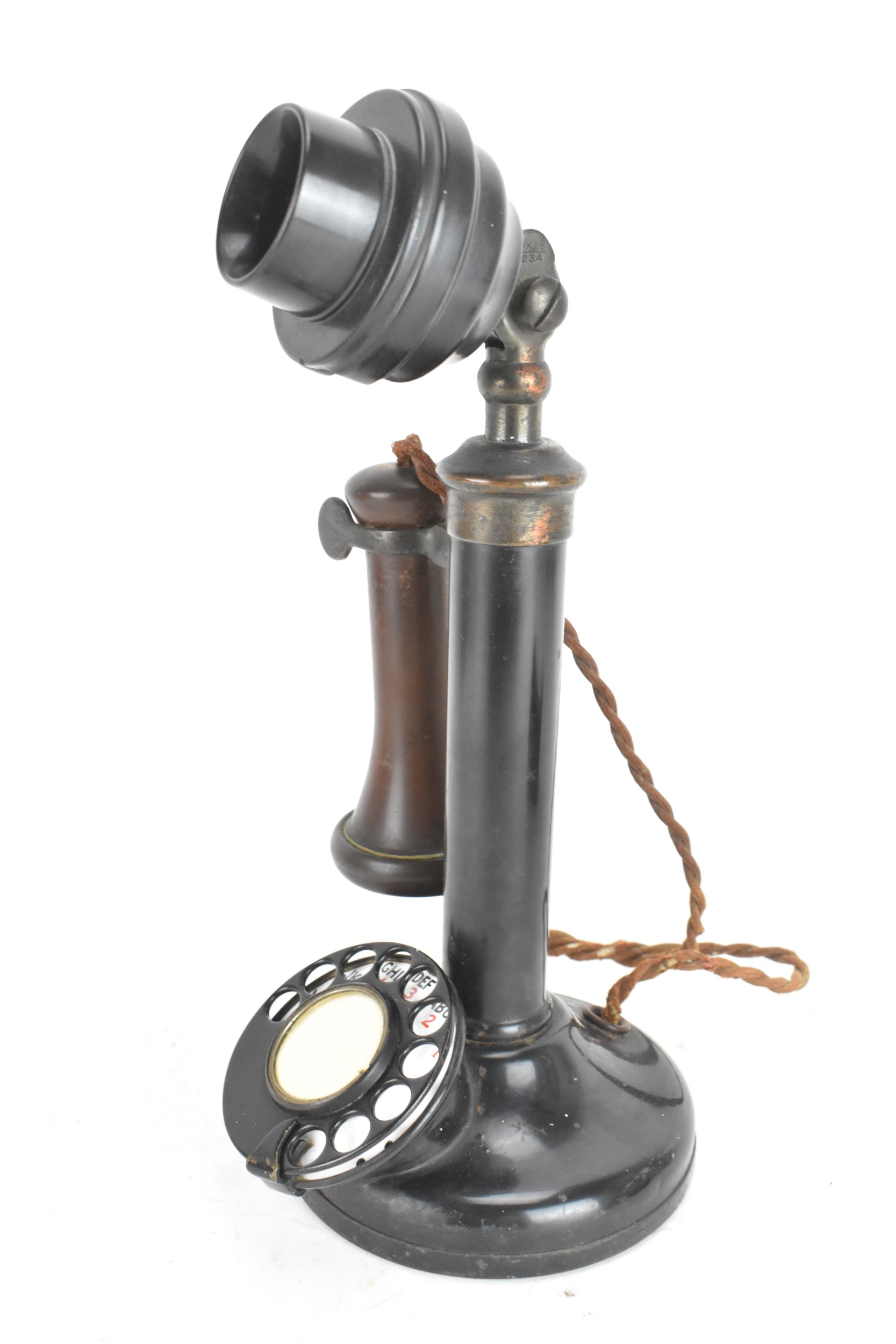 An early 20th century candlestick telephone, model No.150, black lacquered metal and brass, rotary dial, vulcanite earpiece, stamped No.150, PX28/234, 33cm high