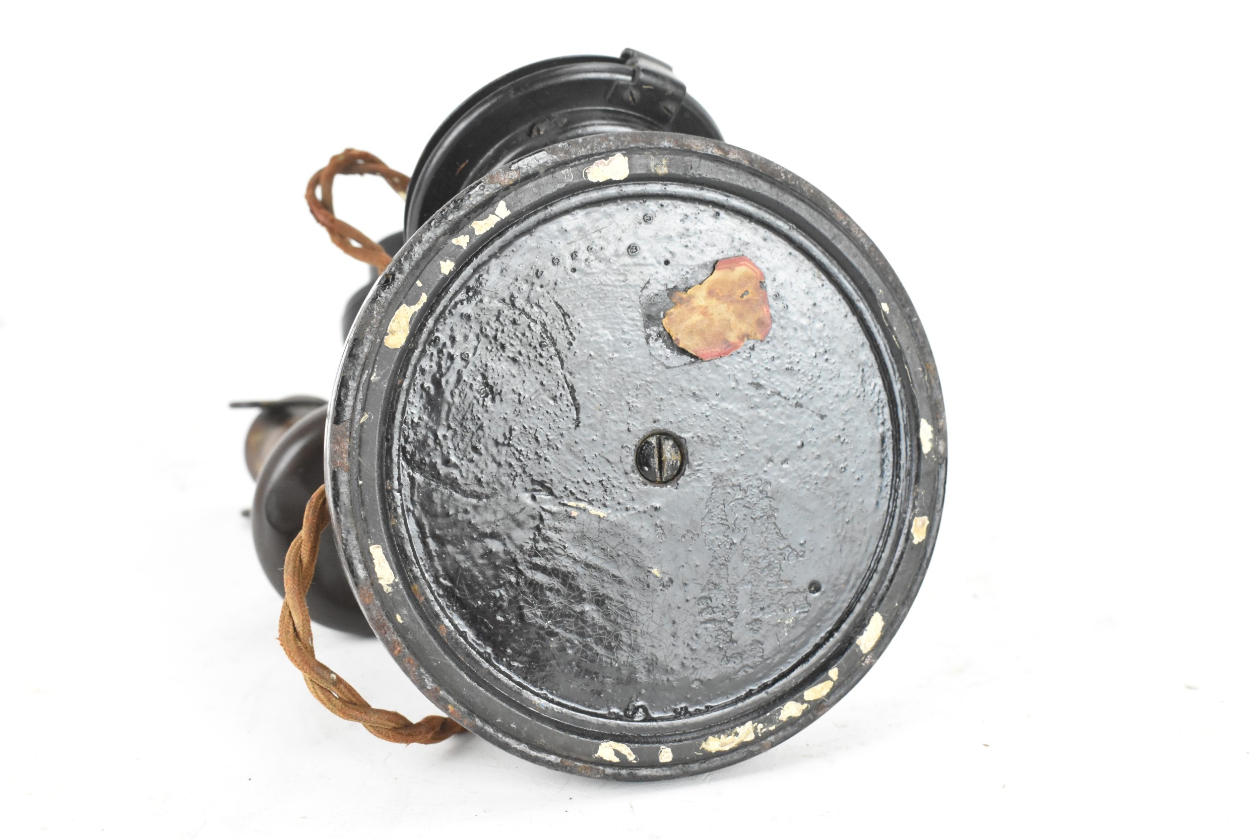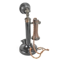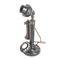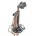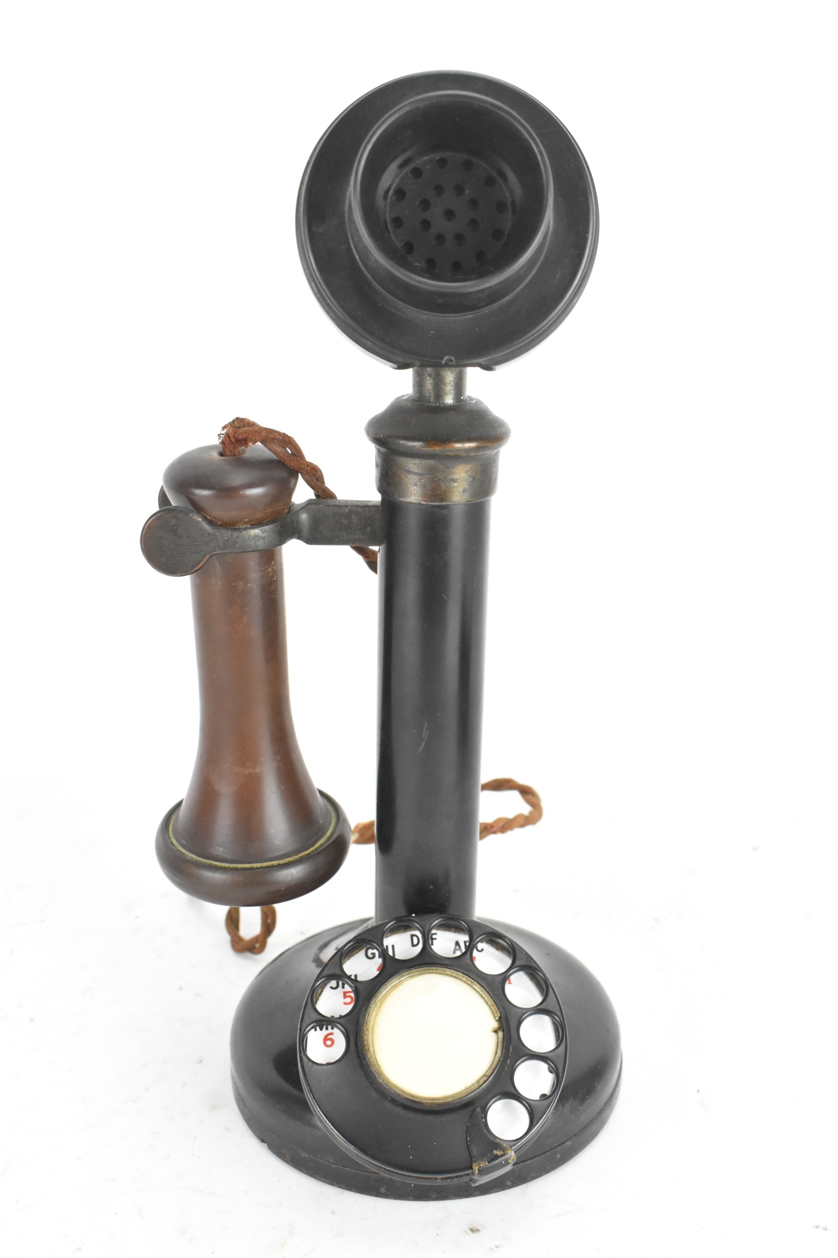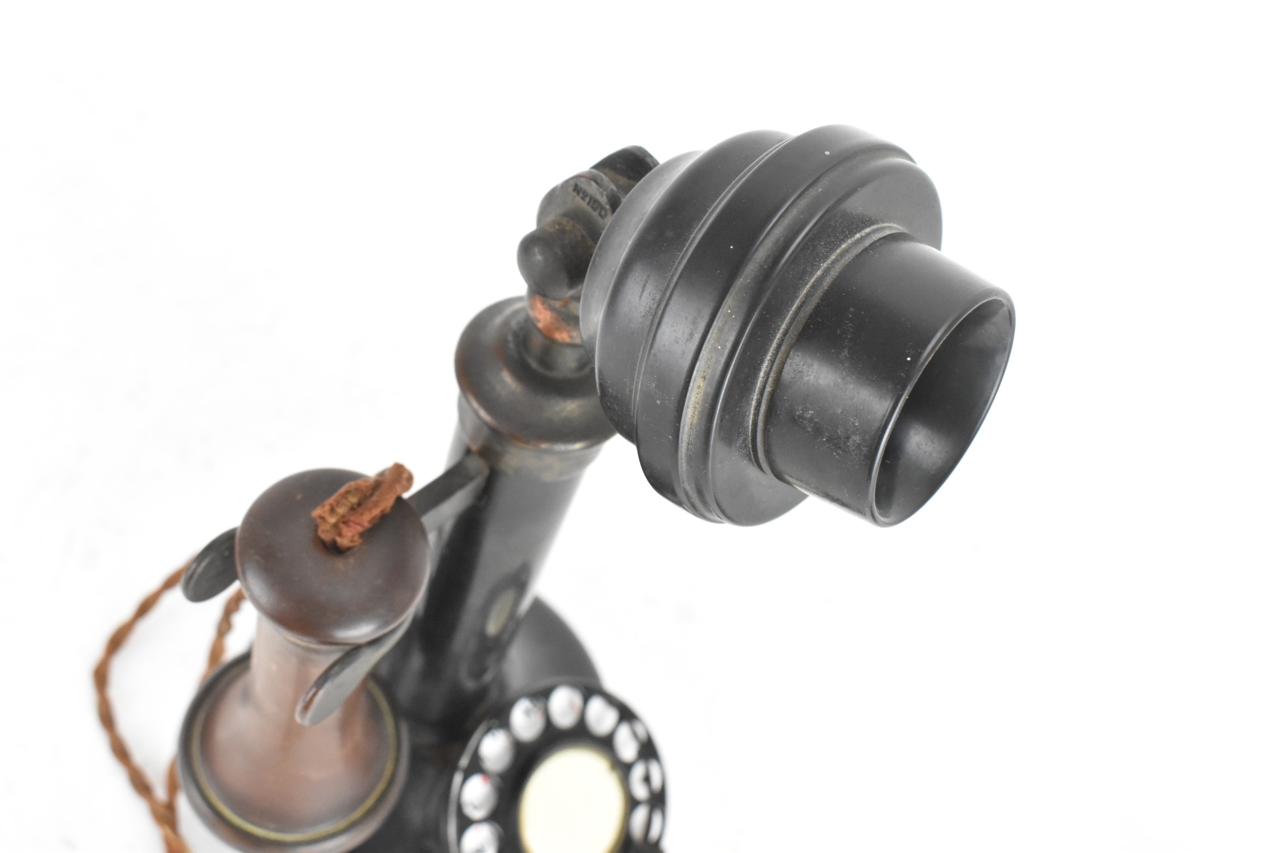 An early 20th century candlestick telephone, model No.150, black lacquered metal and brass, rotary dial, vulcanite earpiece, stamped No.150, PX28/234, 33cm high