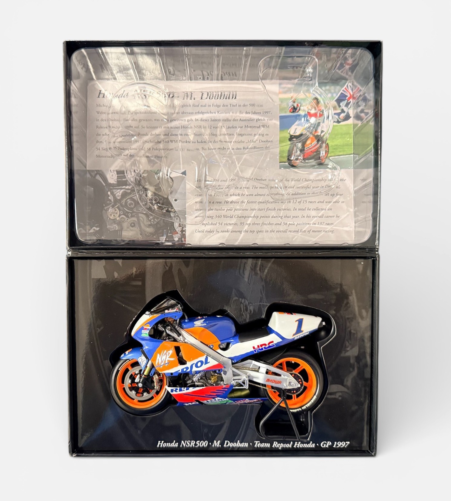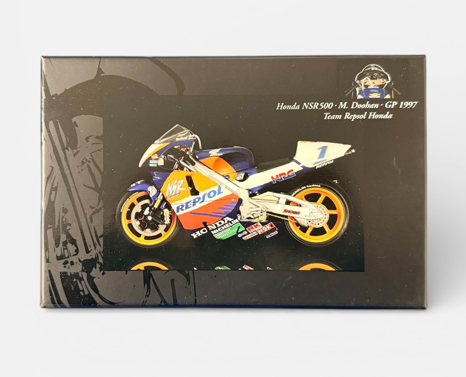 Minichamps 1/12th scale 1985 Honda NSR500 Repsol M Doohan No. 122 976101 (Classic Bike series No. 39), generally excellent in excellent presentation box including inner packing piece and outer polythene sleeve. Contents unchecked for completeness or correctness and viewing recommended.
