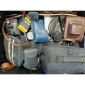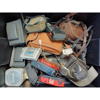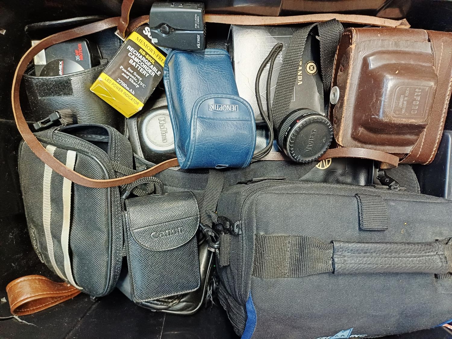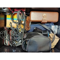 A box containing cameras and photography accessories