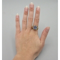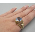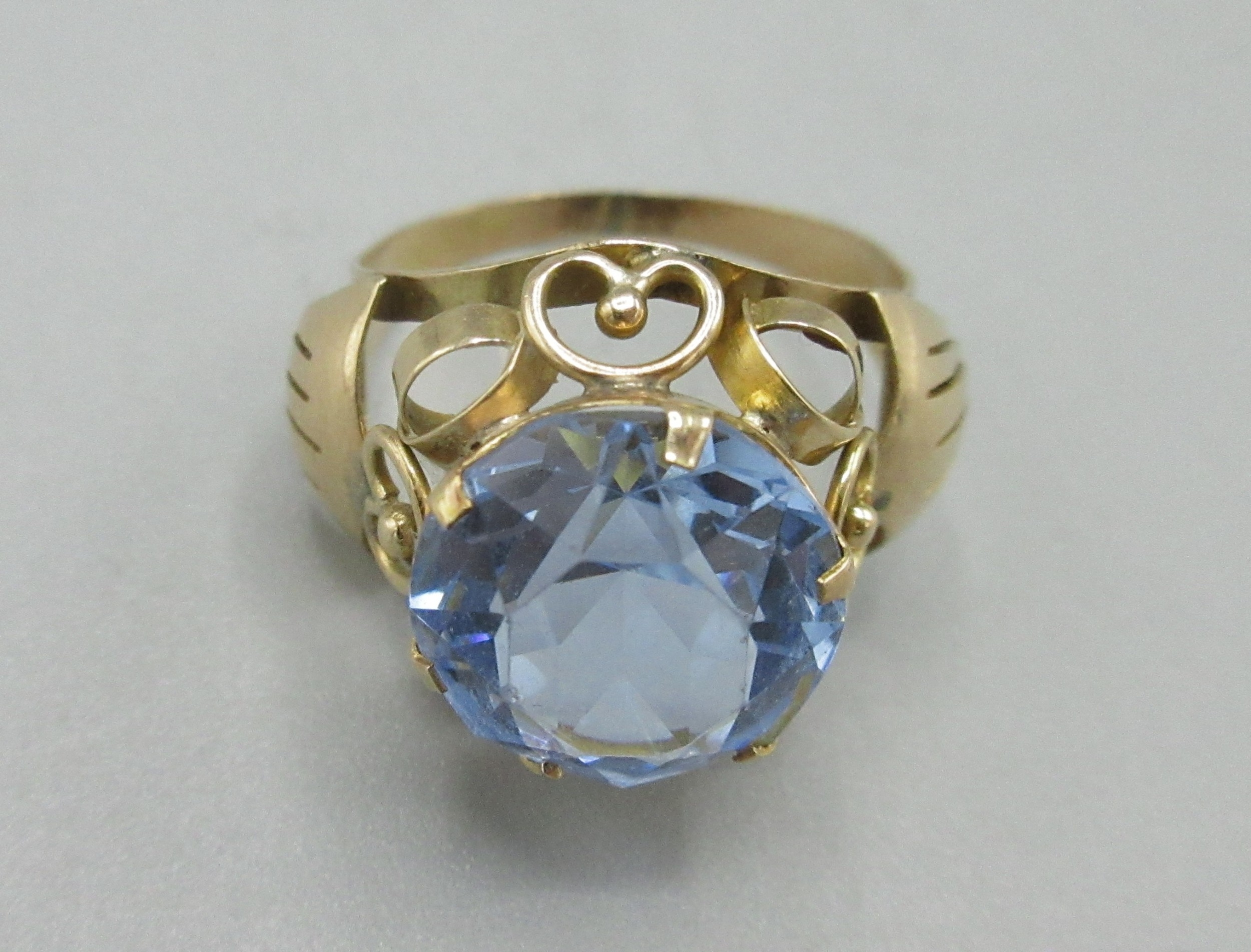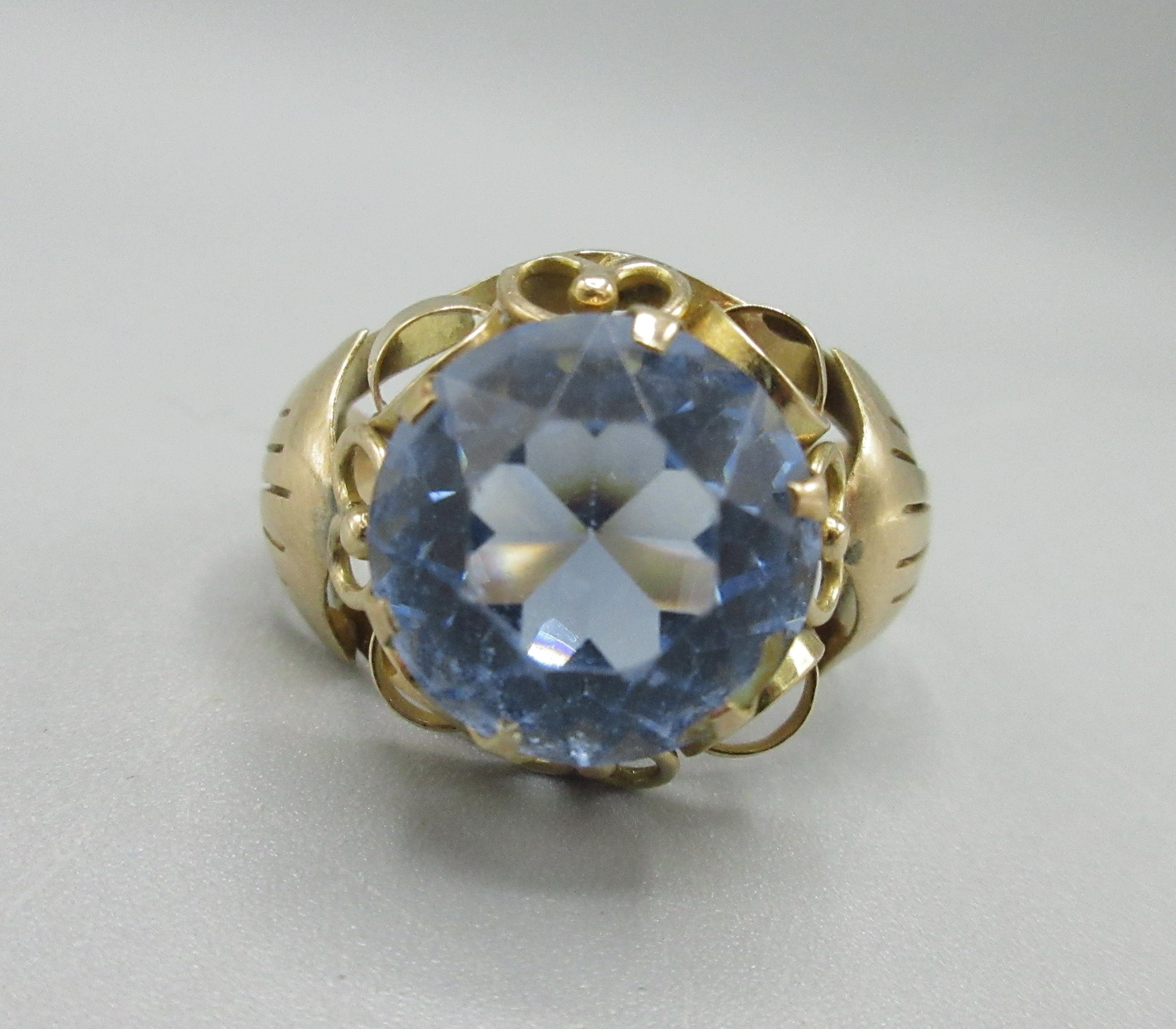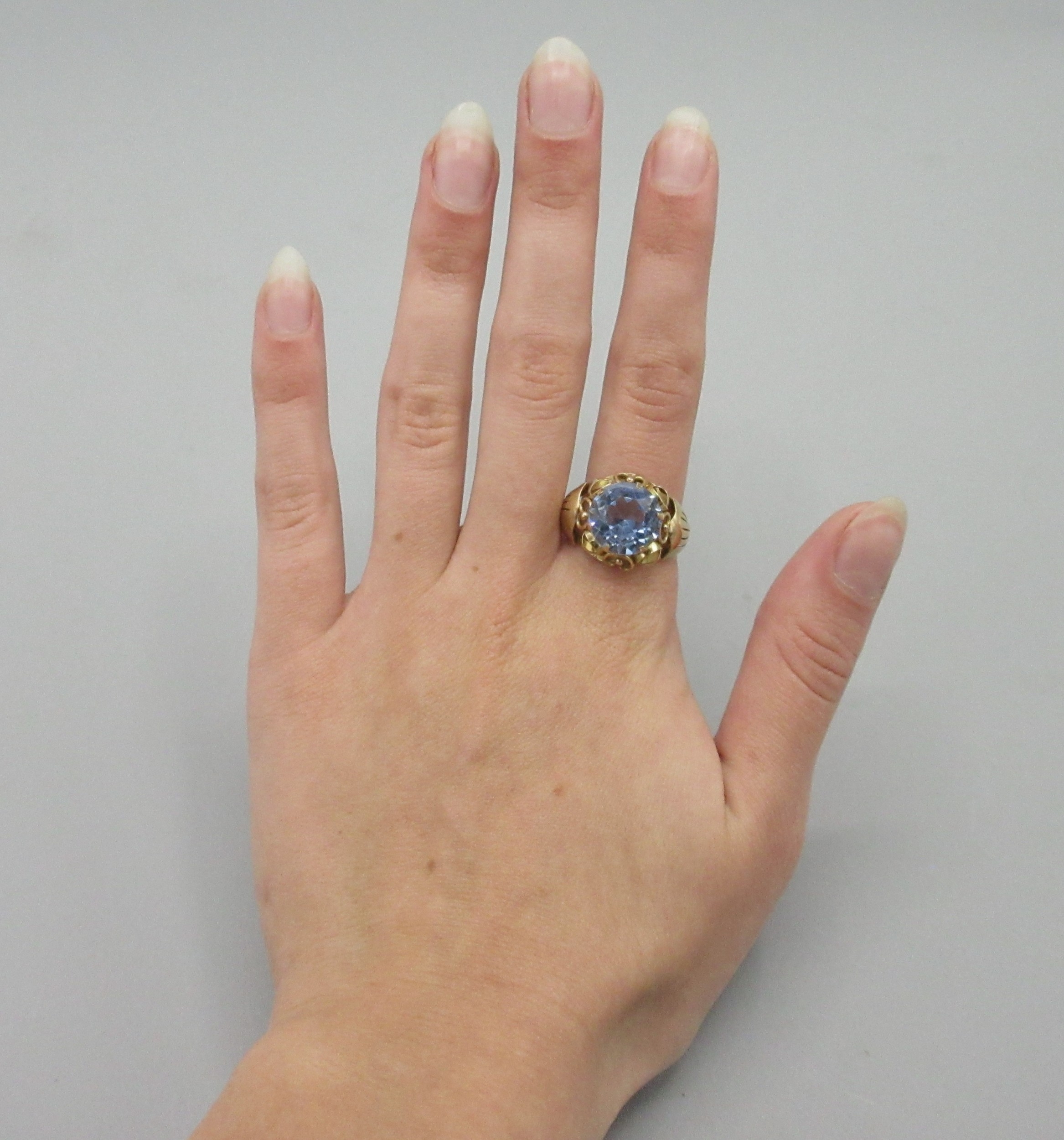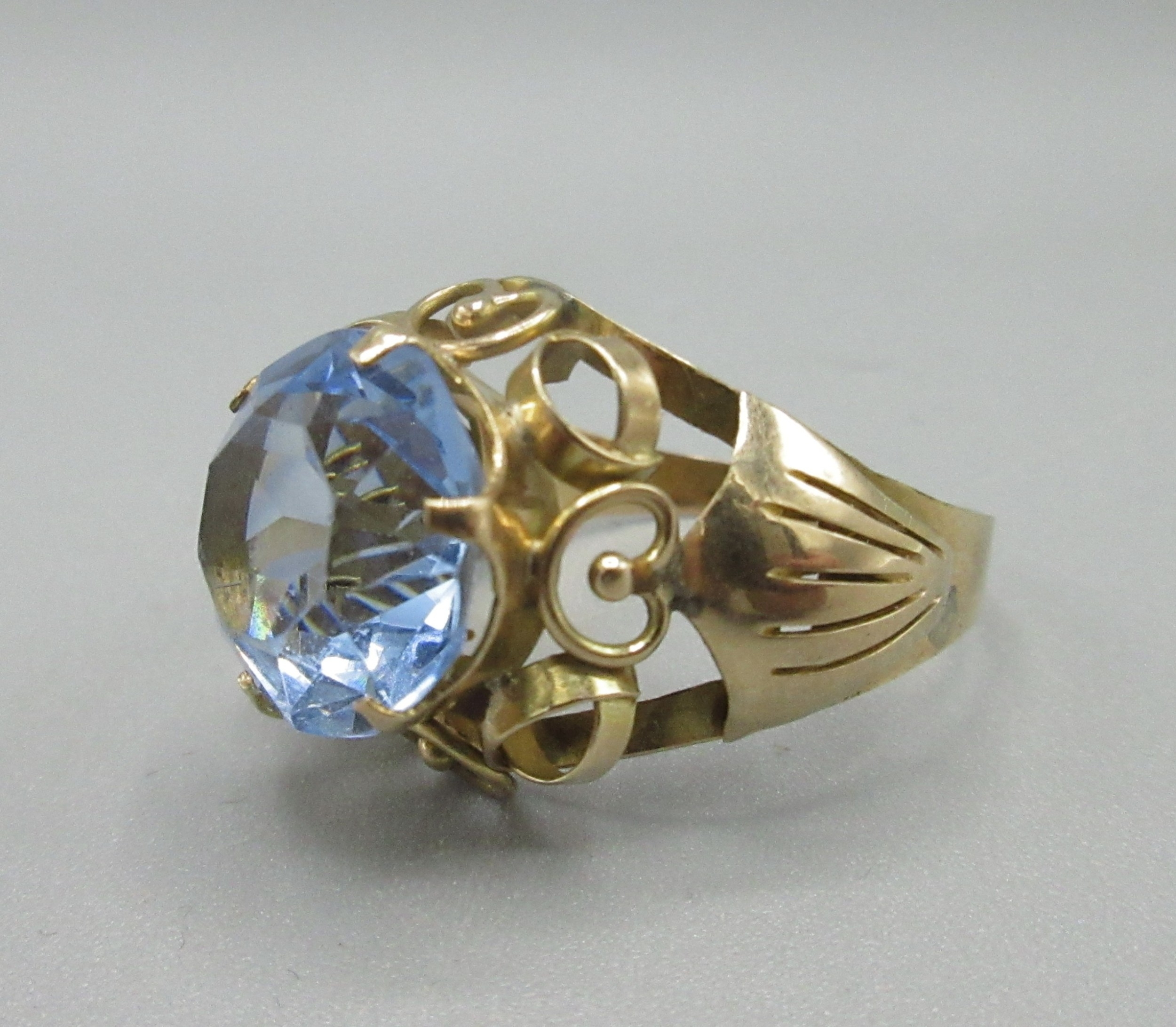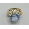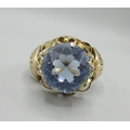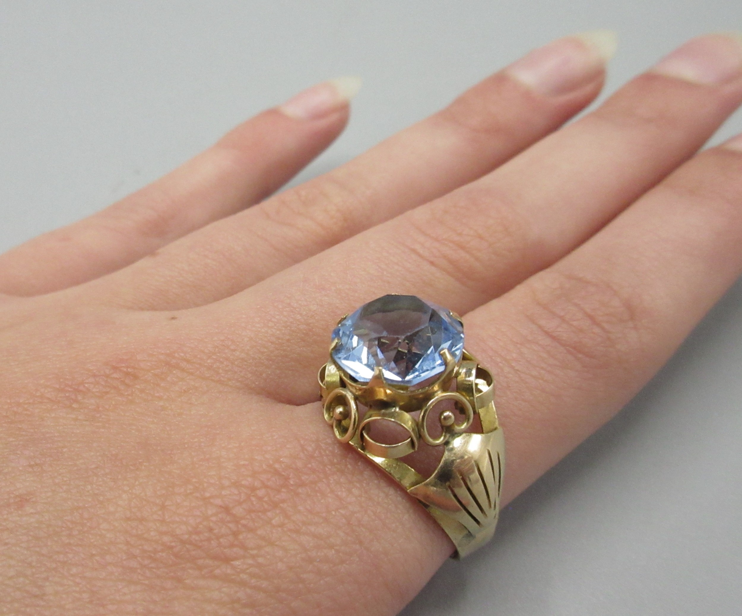 Yellow metal cocktail ring, large blue stone set in ornate mount, marks indistinct, size Q, 3.9g