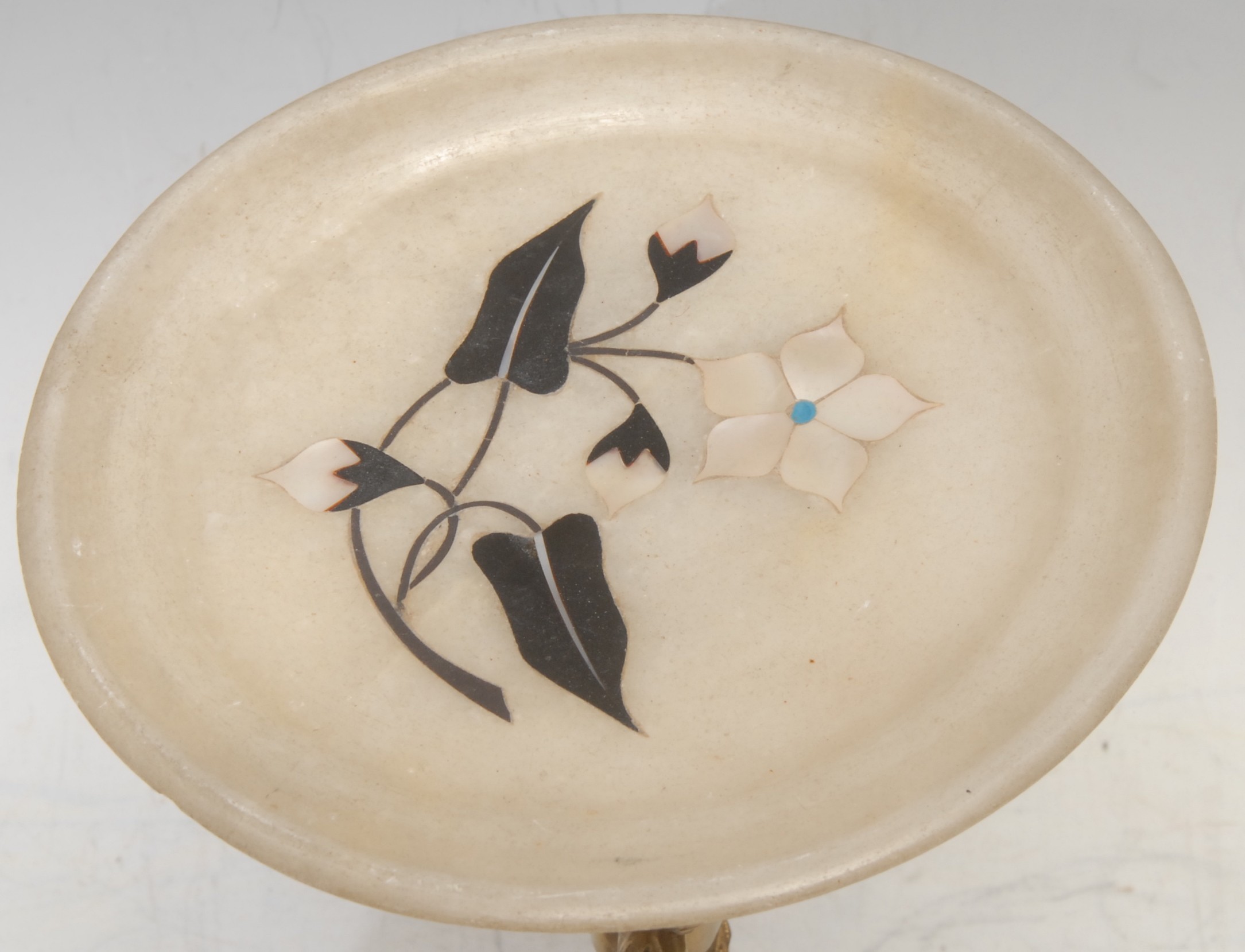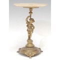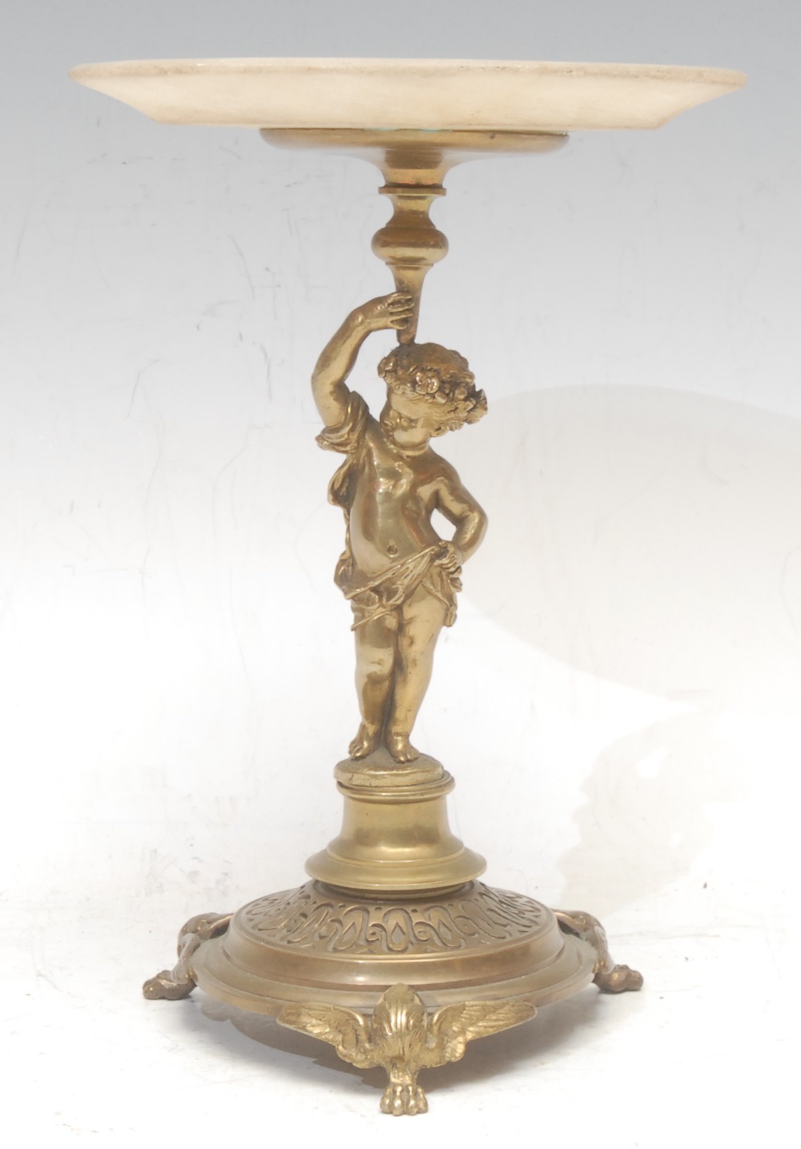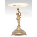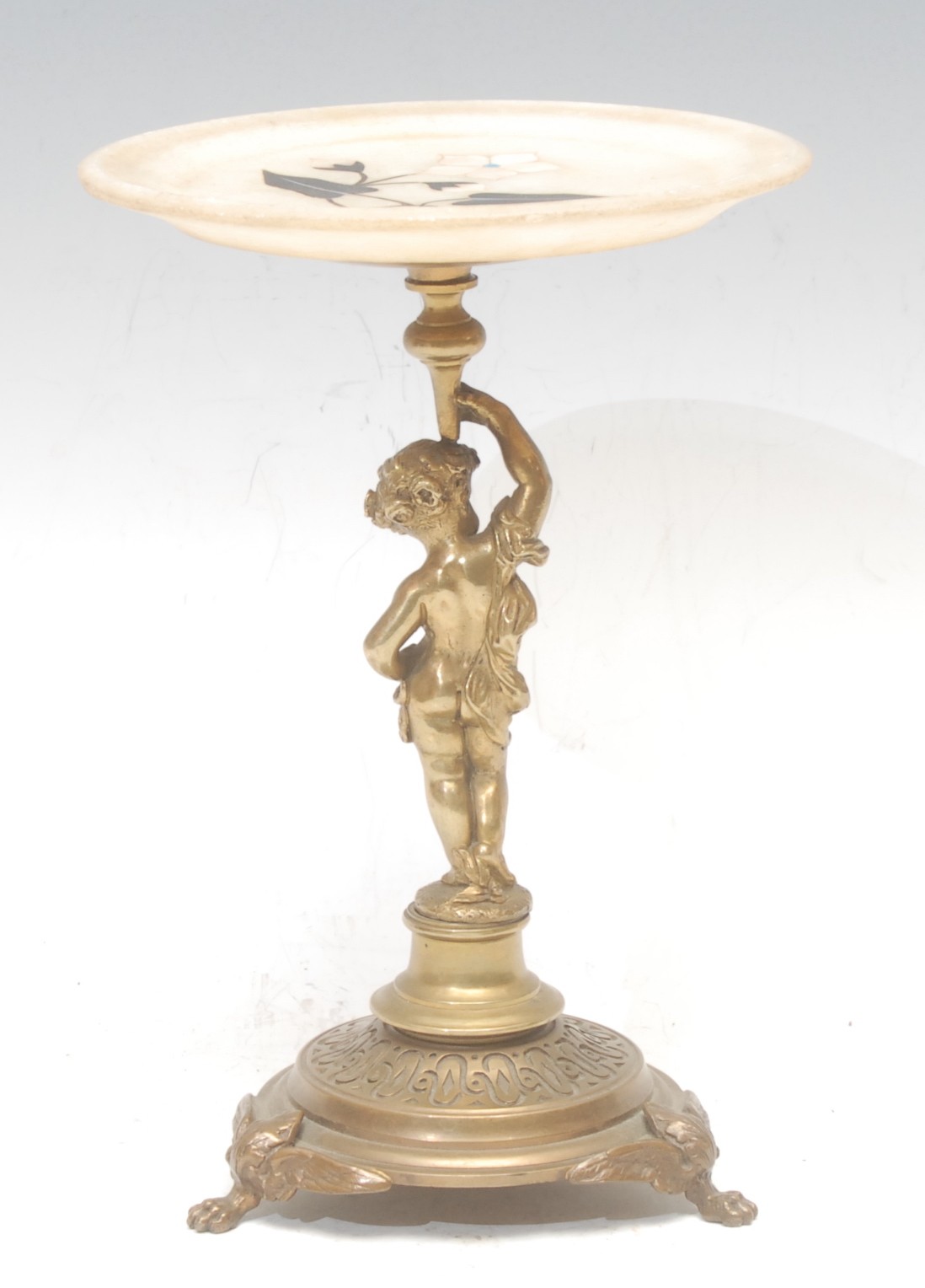 A 19th century gilt metal and pietra dura figural tazza, cast with a Bacchic infant, 18.5cm high