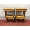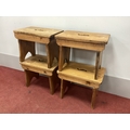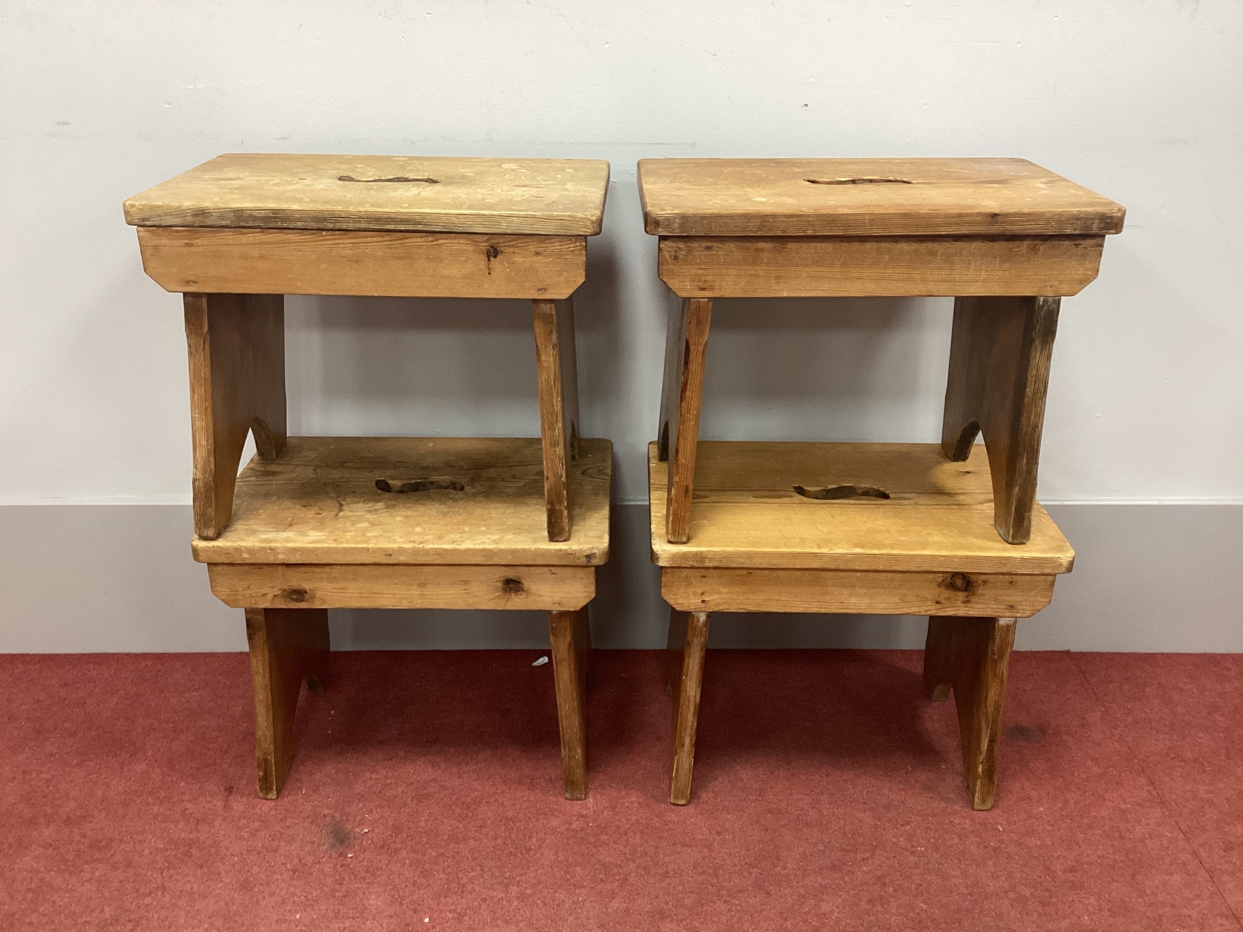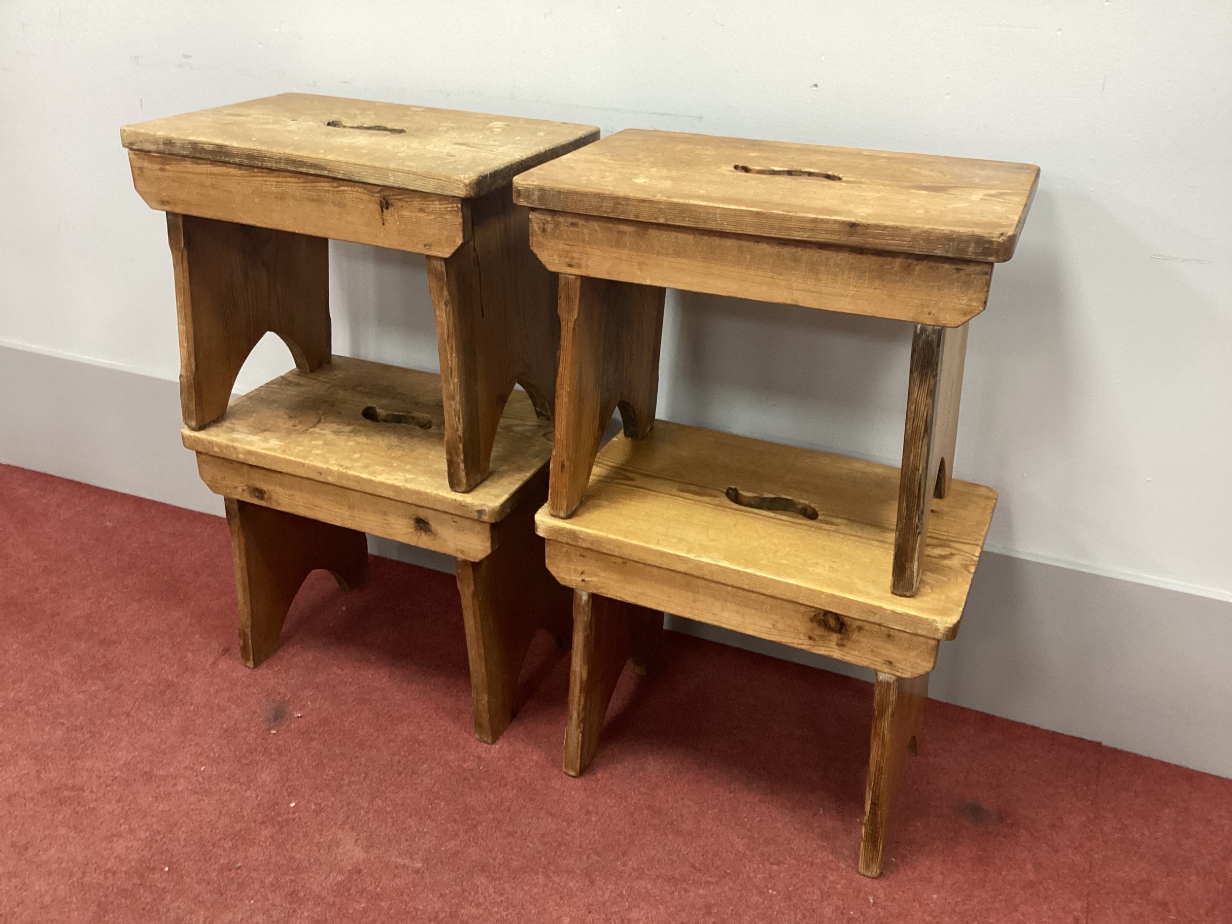 Four Pine Prayer Kneelers, the top with pierced hand grips, 46cm wide. (4)