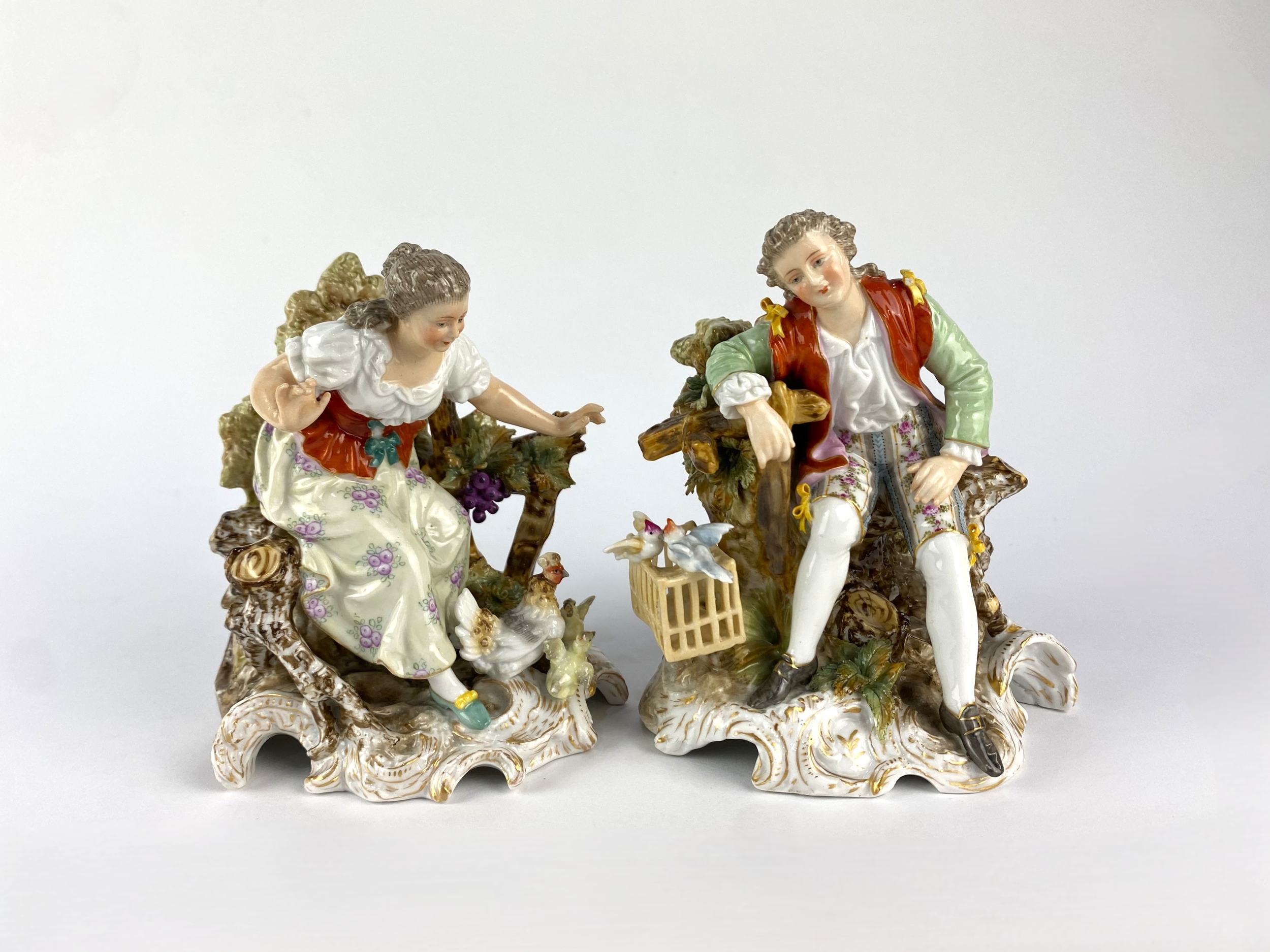 A pair of Volkstedt, Germany porcelain figures if a gentleman seated beside a bird cage, and a lady with hens, 12.5cm high (a/f)