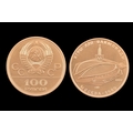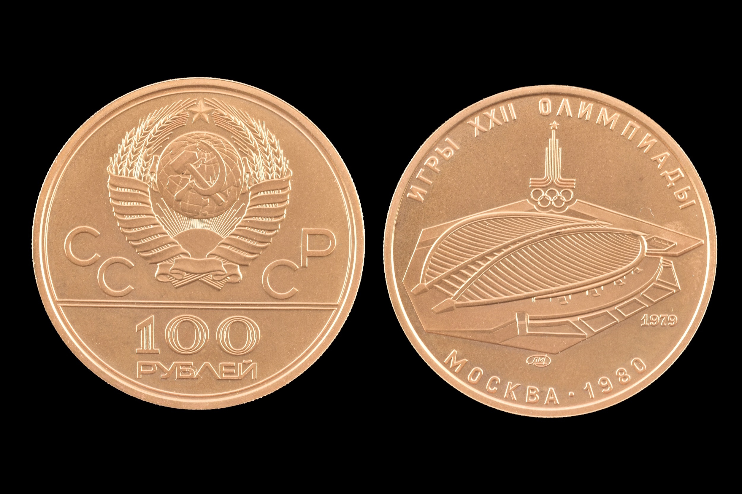 A 1979 USSR 100 Rubles gold coin commemorating summer olympic games held in Moscow in 1980.