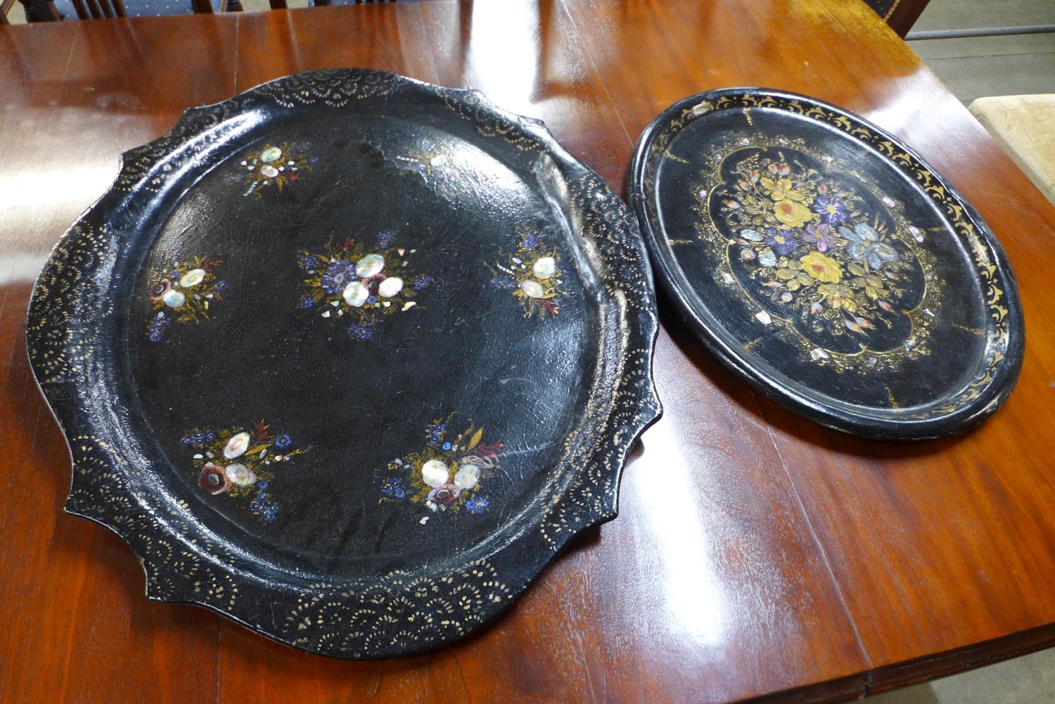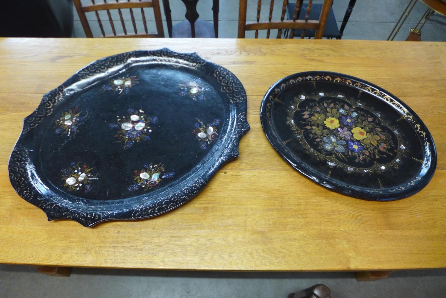 Two Victorian painted and mother of pearl inlaid papier mache trays