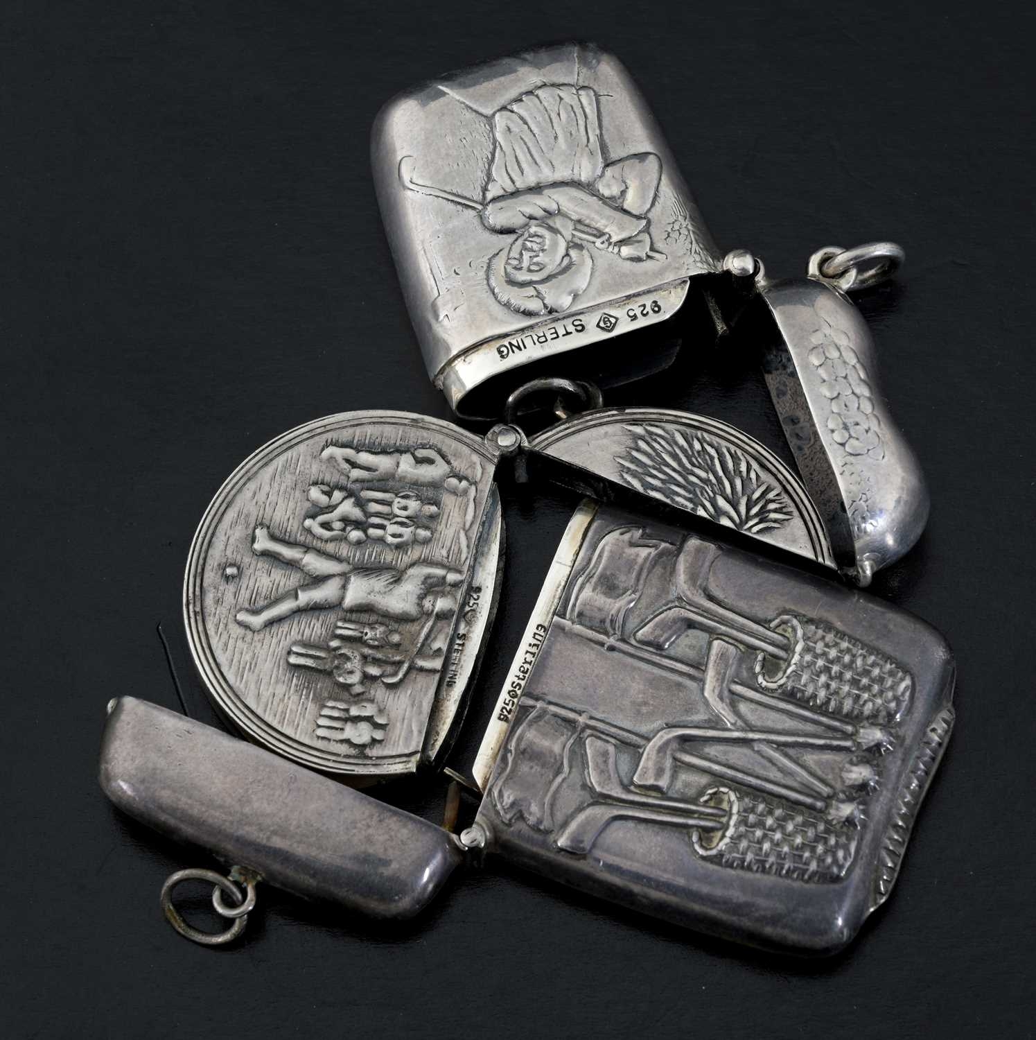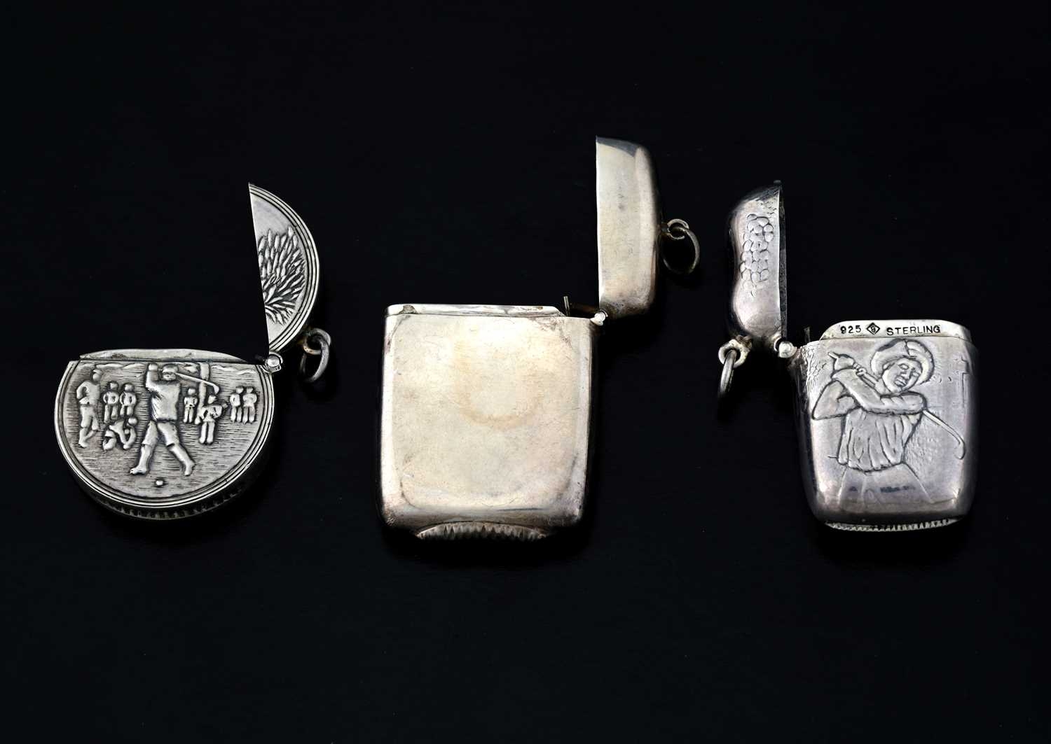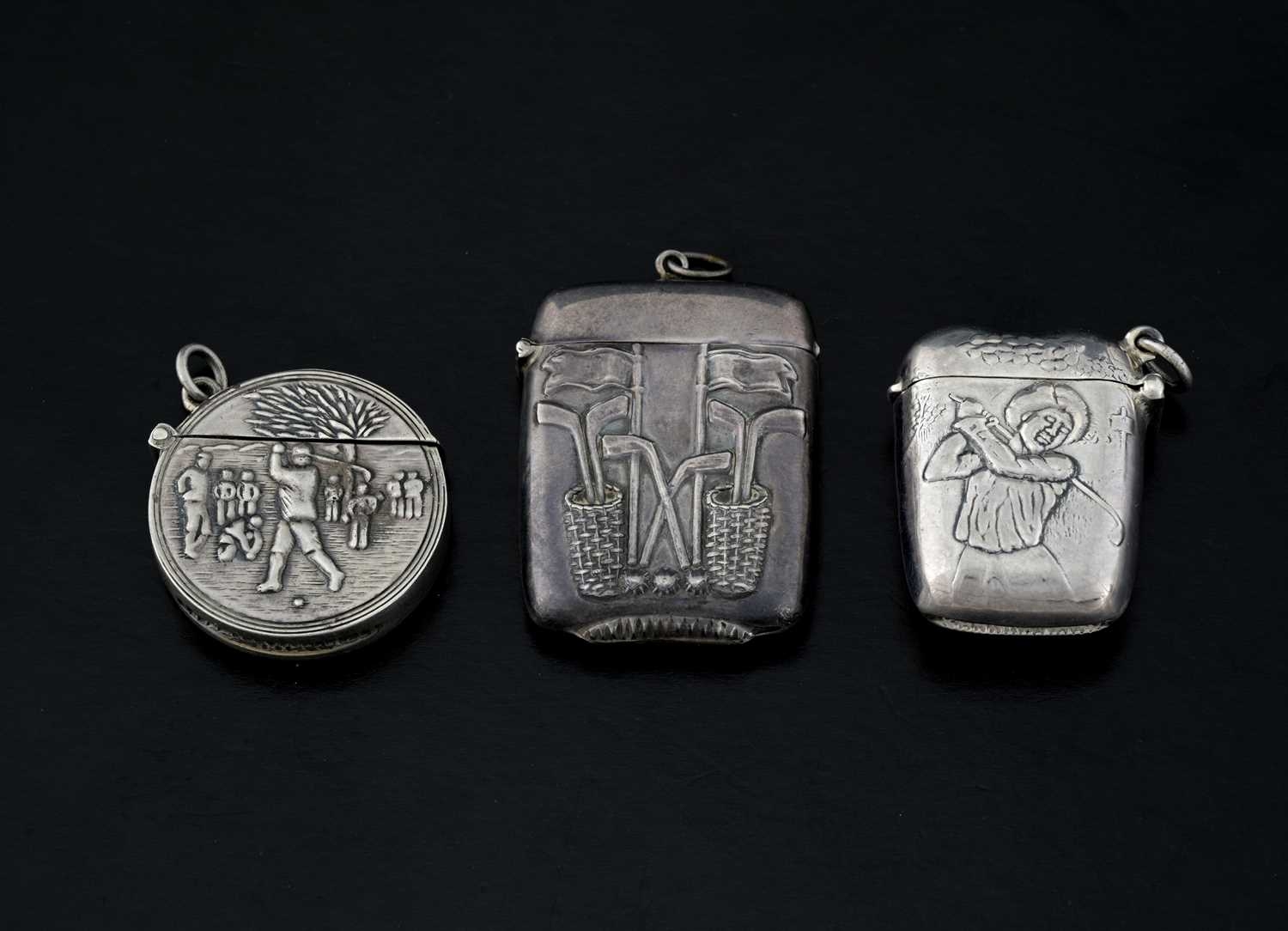 Golf interest, three twentieth-century vesta cases, the bases with an integrated striker, each flange marked '925 Sterling', length of larger 4.7cm, combined weight 55g/1.76ozt approx (3)