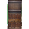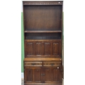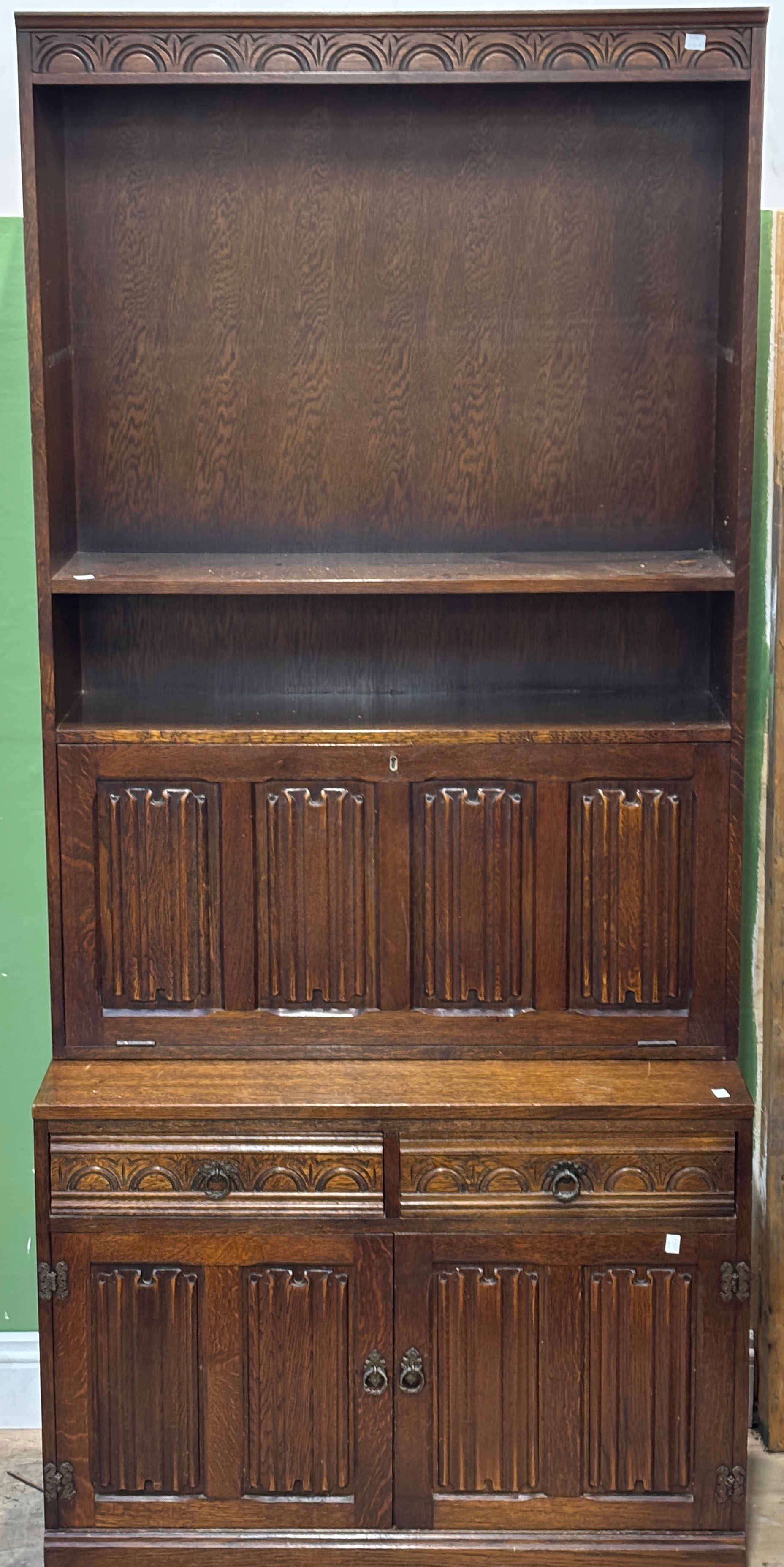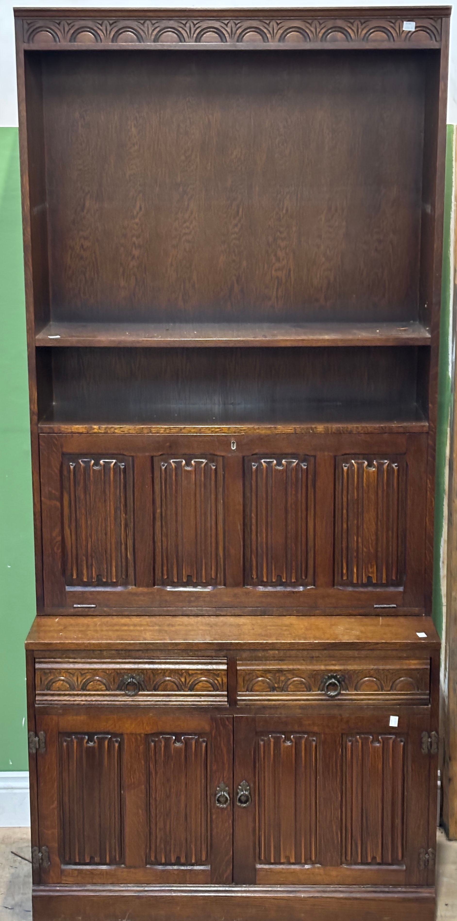 A pair of oak bookshelves with linen fold cupboards below approx. 92cmW 204cmH
