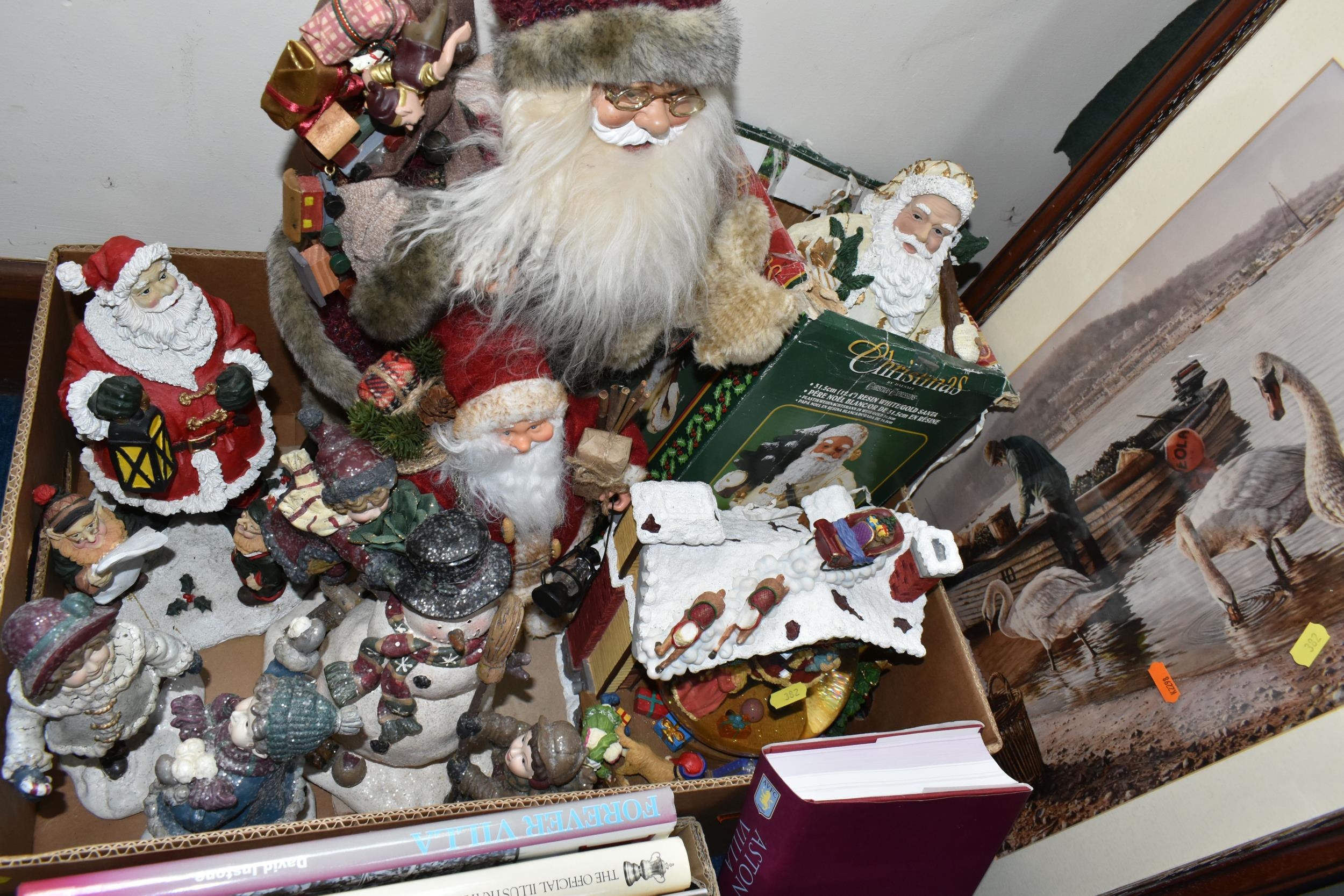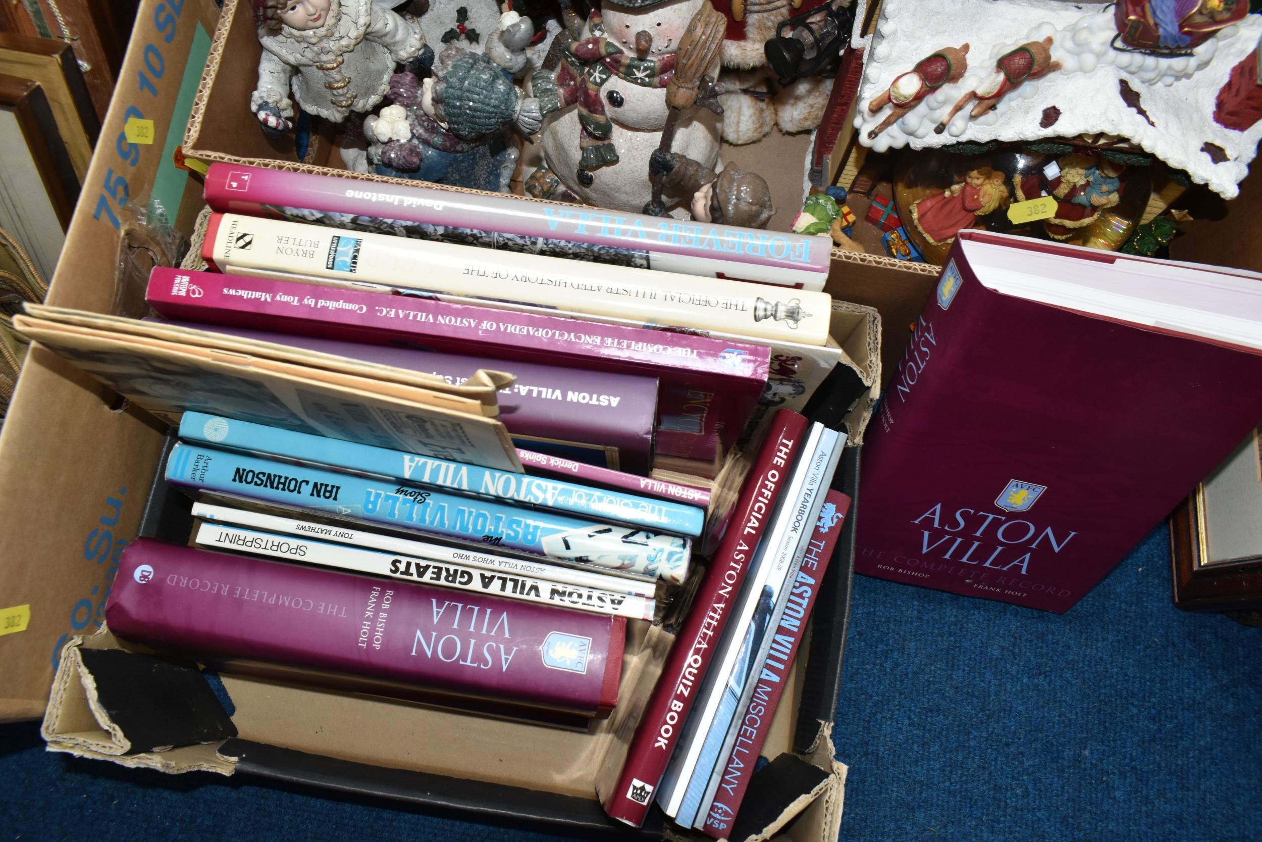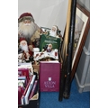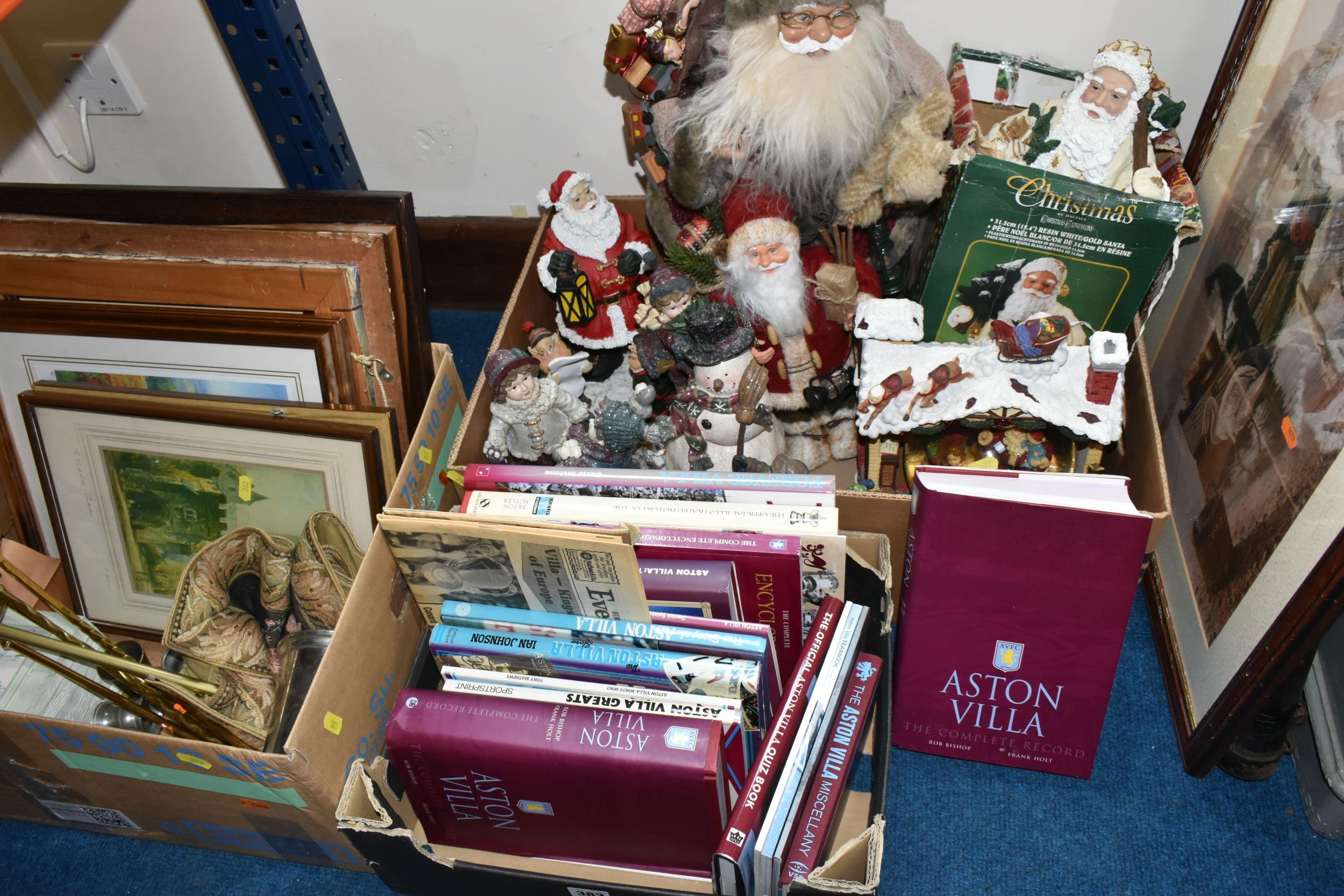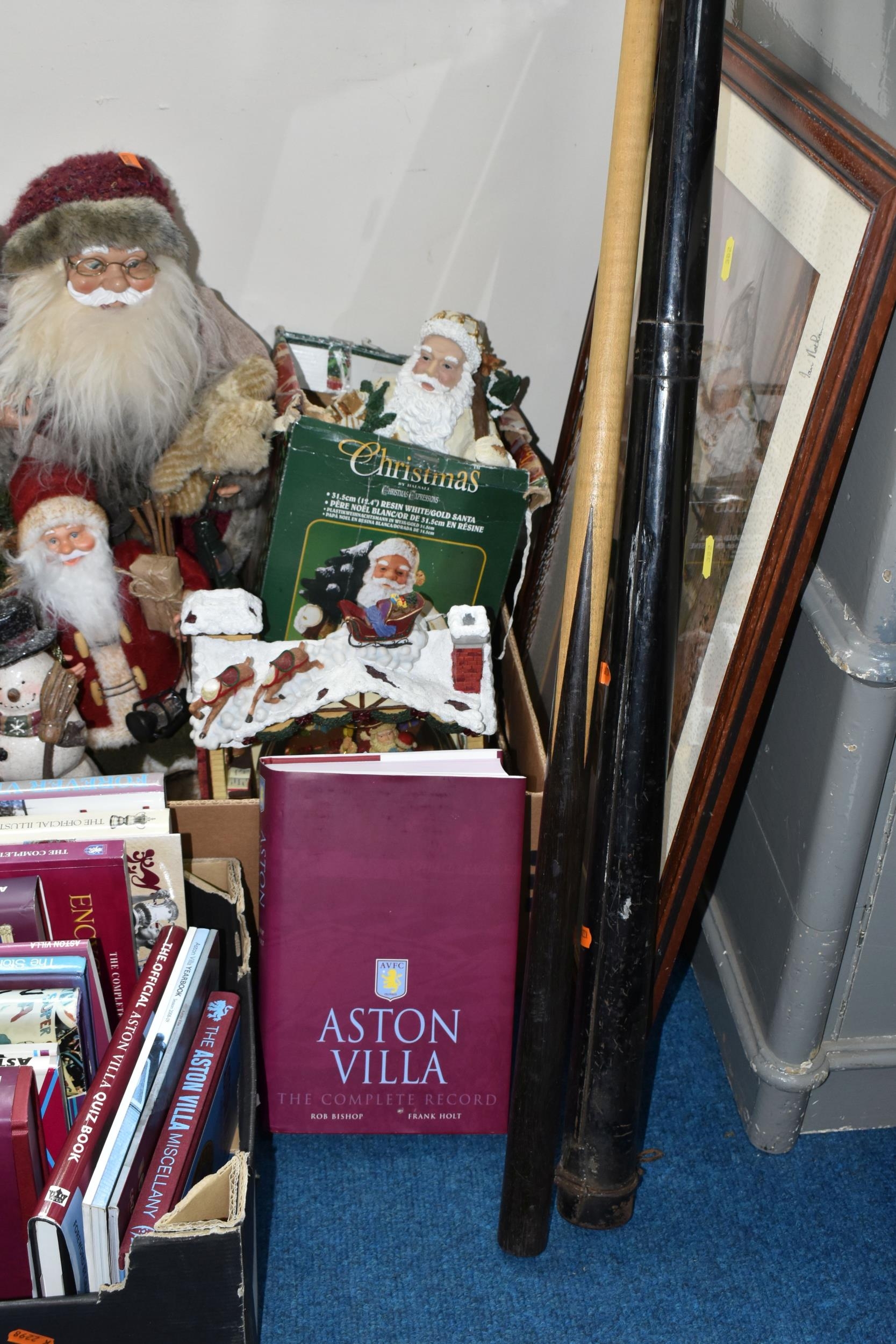 THREE BOXES OF CHRISTMAS DECORATIONS, BOOKS AND FRAMED PRINTS, to include two vintage A.W Chick Ltd Billiard/Snooker cues with an original metal carrying case, a pencil signed framed print of a fisherman by Ian Nathan, a box of Christmas decorations, miniature pewter tankards, framed prints, together with sixteen Aston Villa related books, comprising a 2008 The Aston Villa Miscellany by Dave Woodhall, two Aston Villa The Complete Record by Rob Bishop and Frank Holt (one copy is signed inside the front cover), Aston Villa The First Superclub by John Lerwill, The Complete Encyclopaedia of Aston Villa by Tony Matthews, etc. (s.d) (3 boxes)