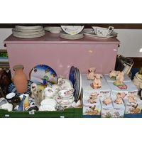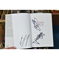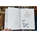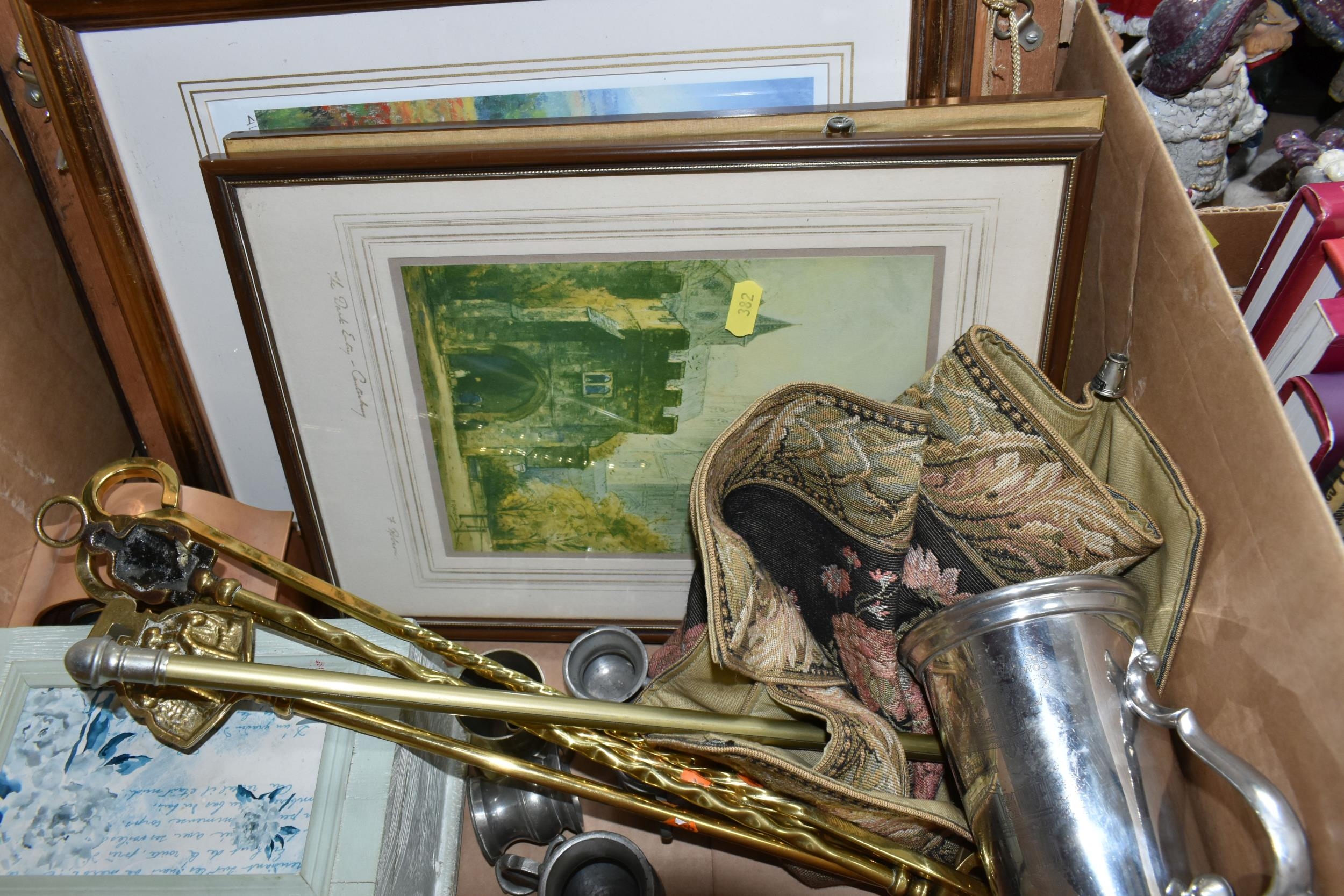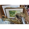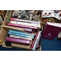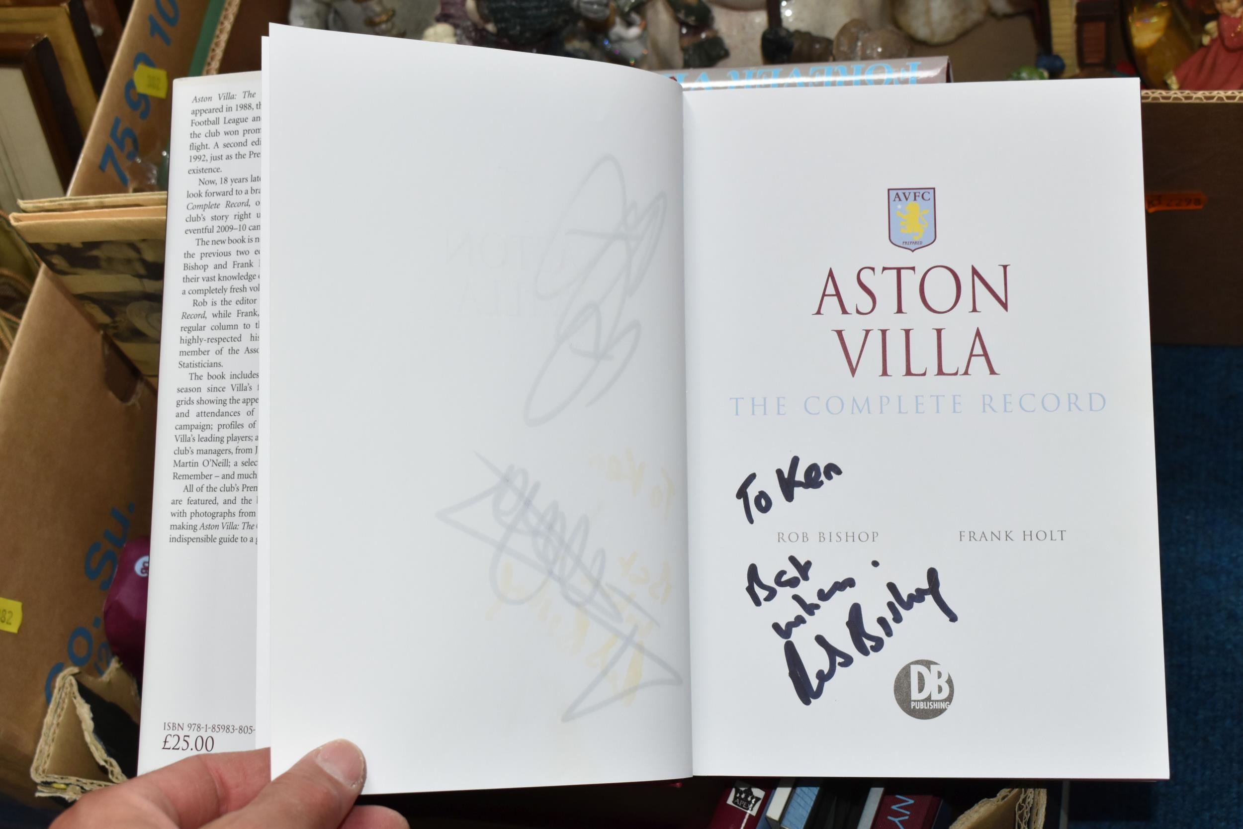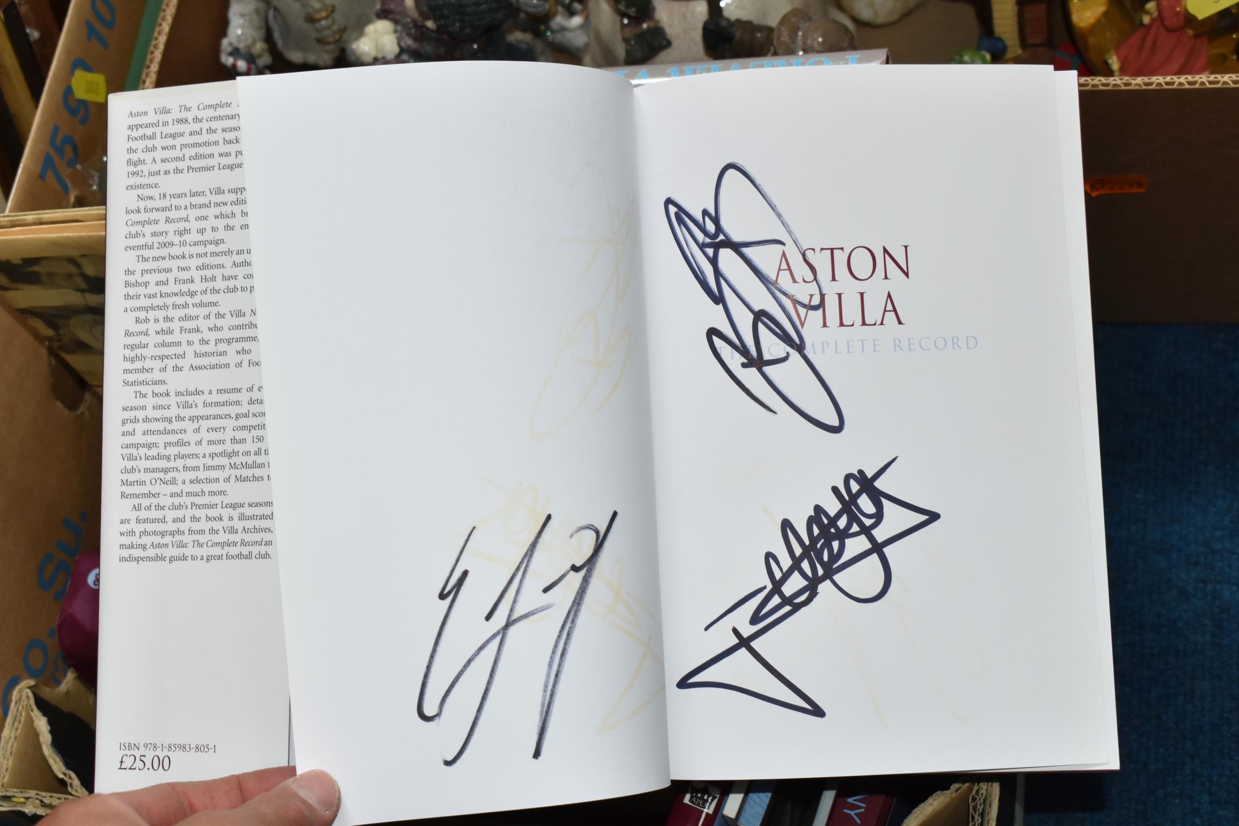 THREE BOXES OF CHRISTMAS DECORATIONS, BOOKS AND FRAMED PRINTS, to include two vintage A.W Chick Ltd Billiard/Snooker cues with an original metal carrying case, a pencil signed framed print of a fisherman by Ian Nathan, a box of Christmas decorations, miniature pewter tankards, framed prints, together with sixteen Aston Villa related books, comprising a 2008 The Aston Villa Miscellany by Dave Woodhall, two Aston Villa The Complete Record by Rob Bishop and Frank Holt (one copy is signed inside the front cover), Aston Villa The First Superclub by John Lerwill, The Complete Encyclopaedia of Aston Villa by Tony Matthews, etc. (s.d) (3 boxes)