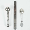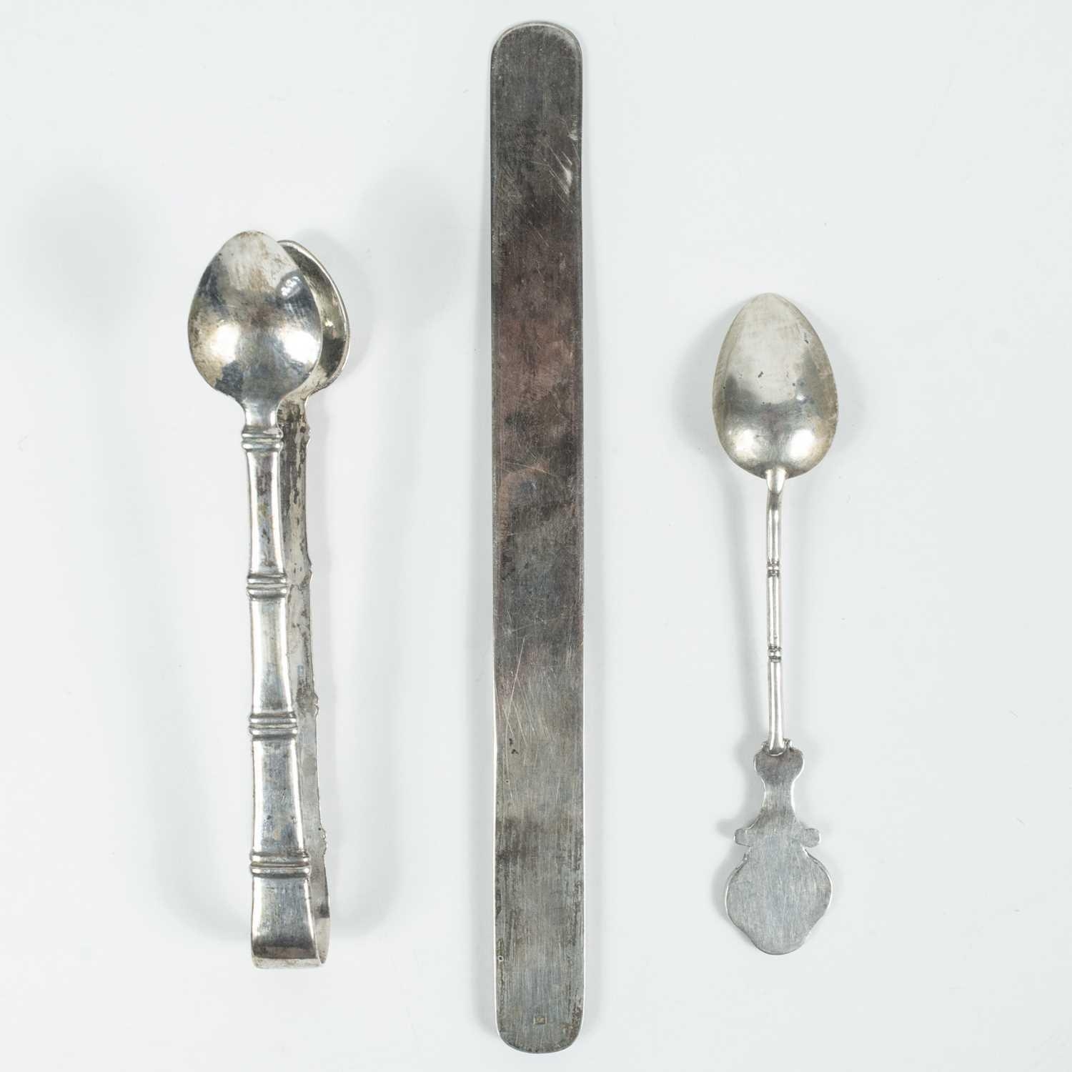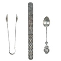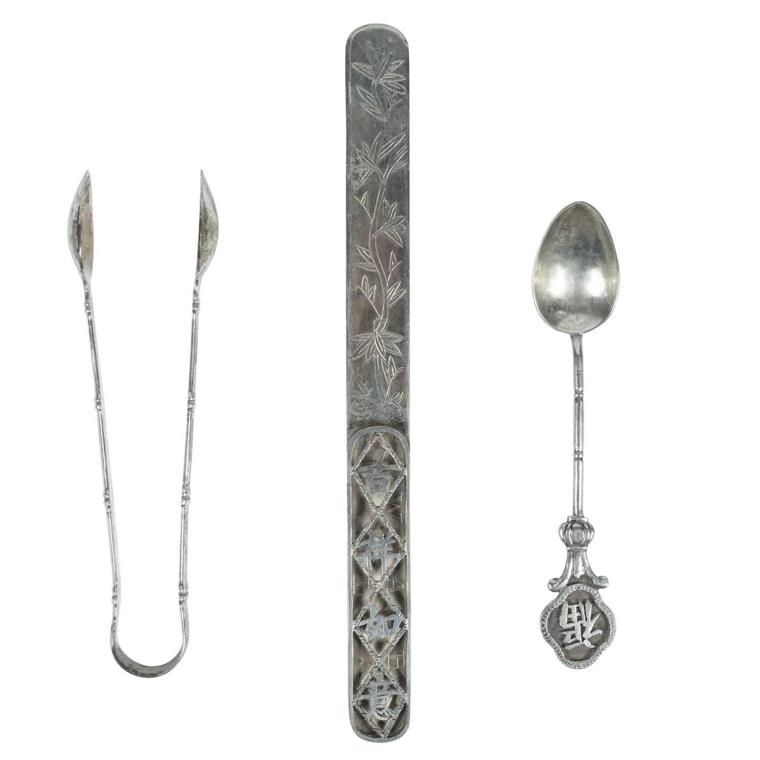 A Chinese silver letter opener, circa 1900. The handle with pierced Chinese characters and engraved initals W.A.B, the blade decorated with trailing foliage, length 18.7cm, width 1.7cm; weight 38 grams, a pair of Chinese silver sugar tongs, stamped 'Woshing, Shanghai', length 13cm, weight 37 grams and a Chinese teaspoon, length 12.5cm, weight 13 grams. (3)