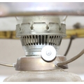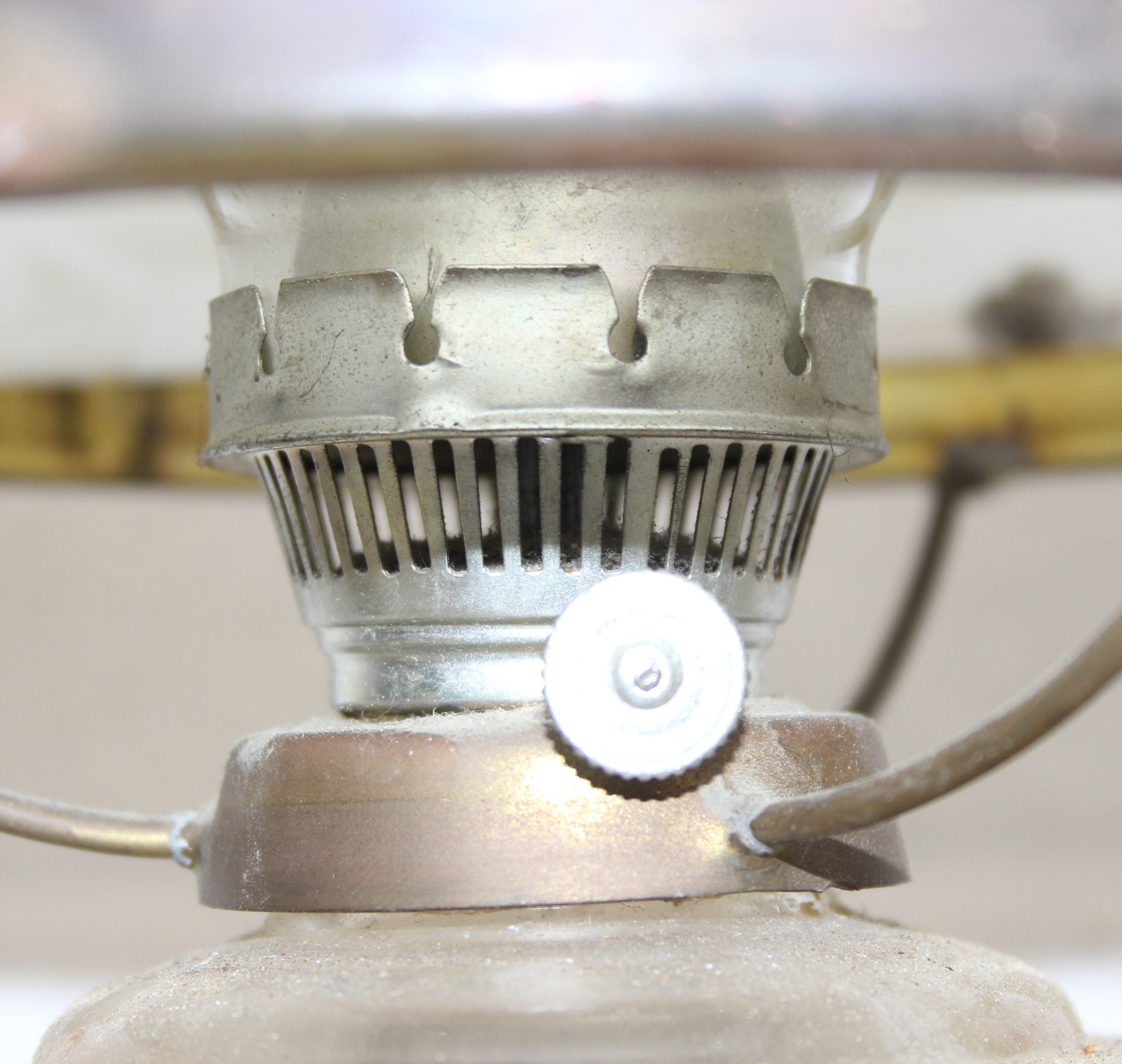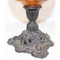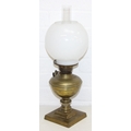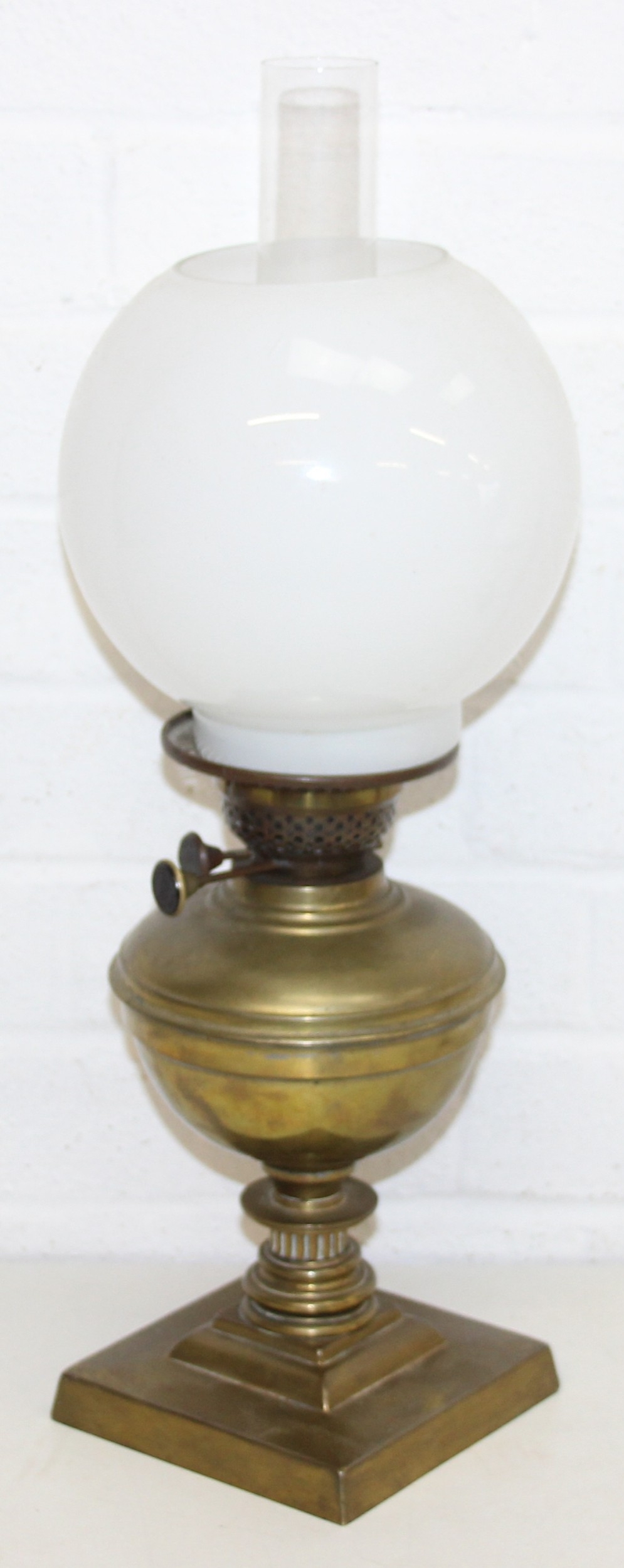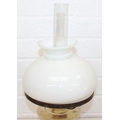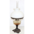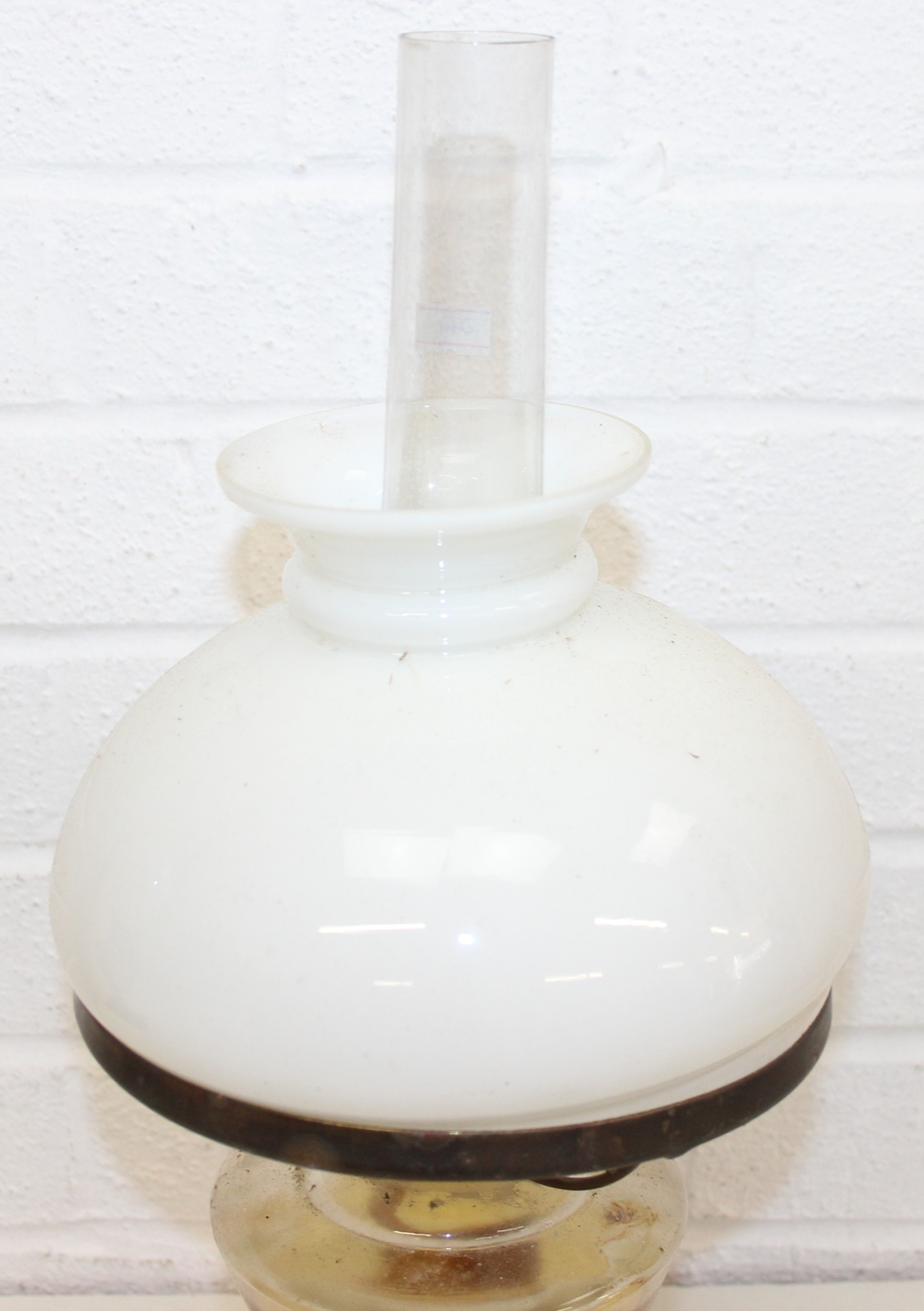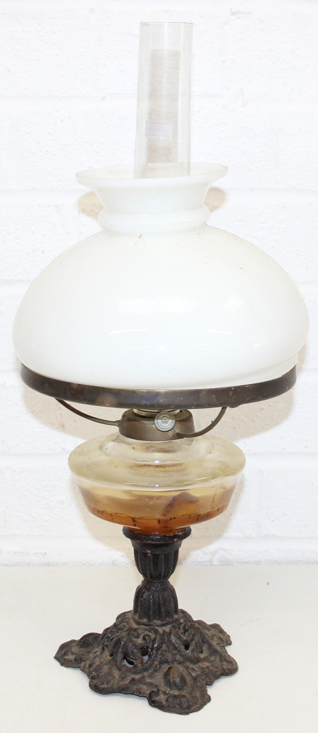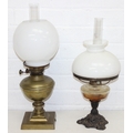Two vintage oils lamps with chimneys and shades, one brass the other cast iron and glass, the largest 54cm tall [2]