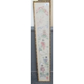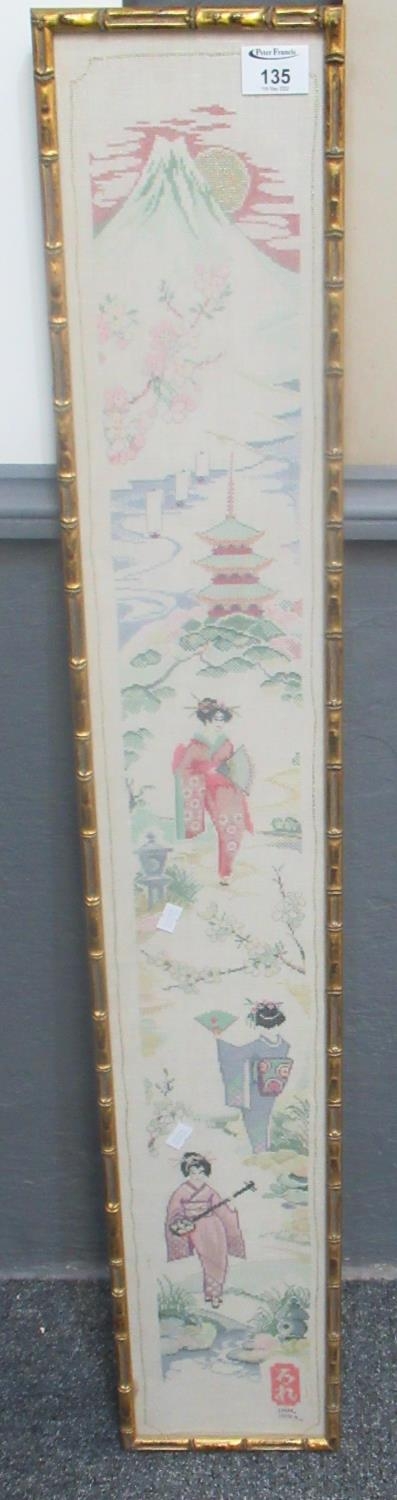 Japanese style needle point panel featuring a geisha, Mount Fuji, pagoda, etc. in gilded bamboo style frame. 110 x 16cm approx.