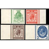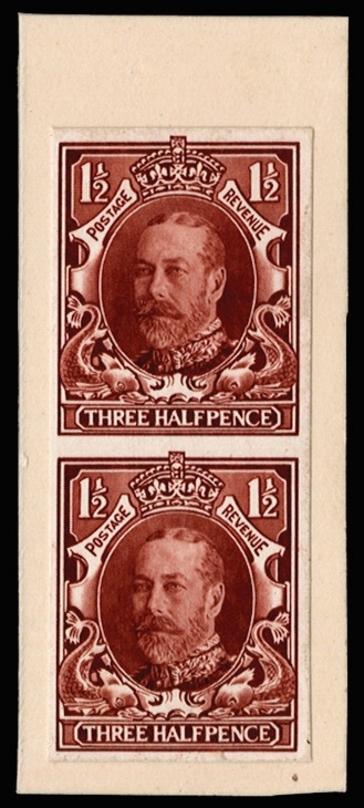 1934 1½d Photogravure essay. Very fine vertical pair of imperforate essays printed by Harrison & Sons on"Harrison" Script gummed watermarked paper, mounted on a small piece of cream card. Printed in red-brown, using the Lafayette portrait design (Type D). A very attractive and rare unadopted essay. See Specialised catalogue Vol.2 p178 SG 441