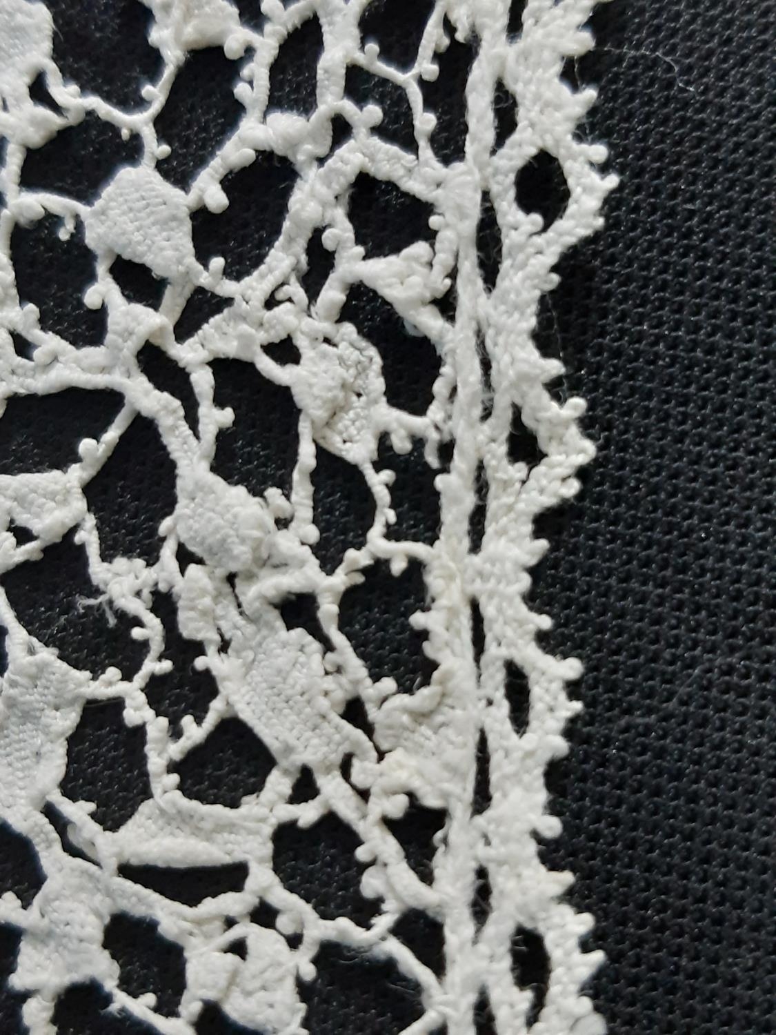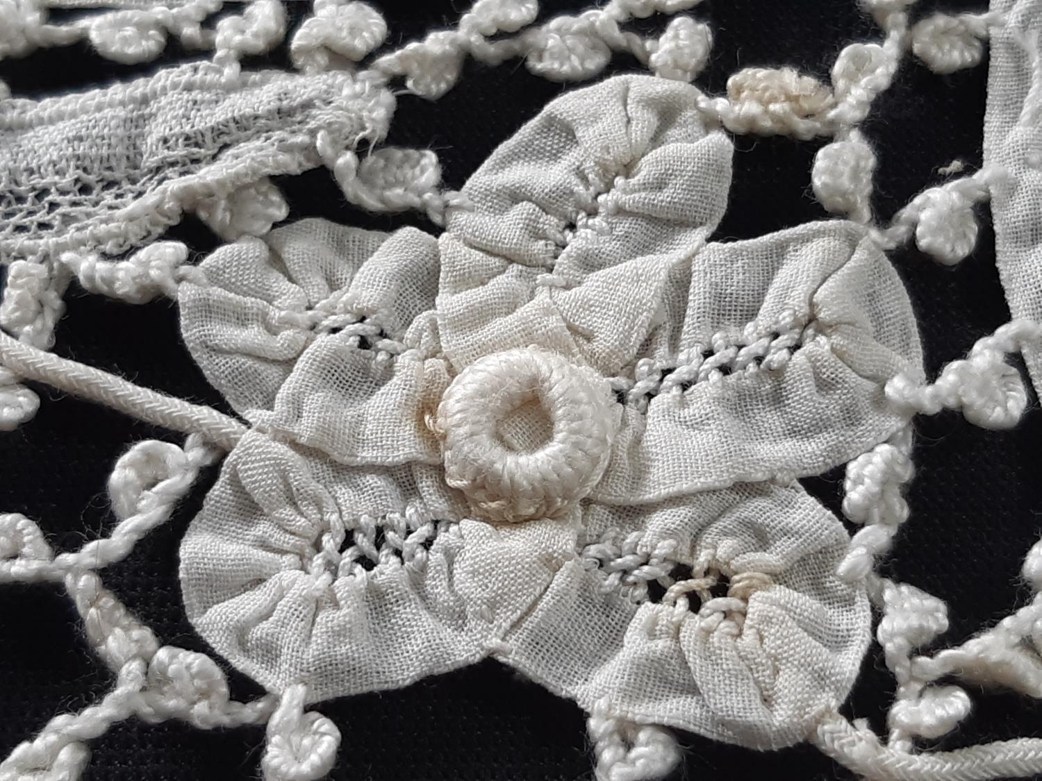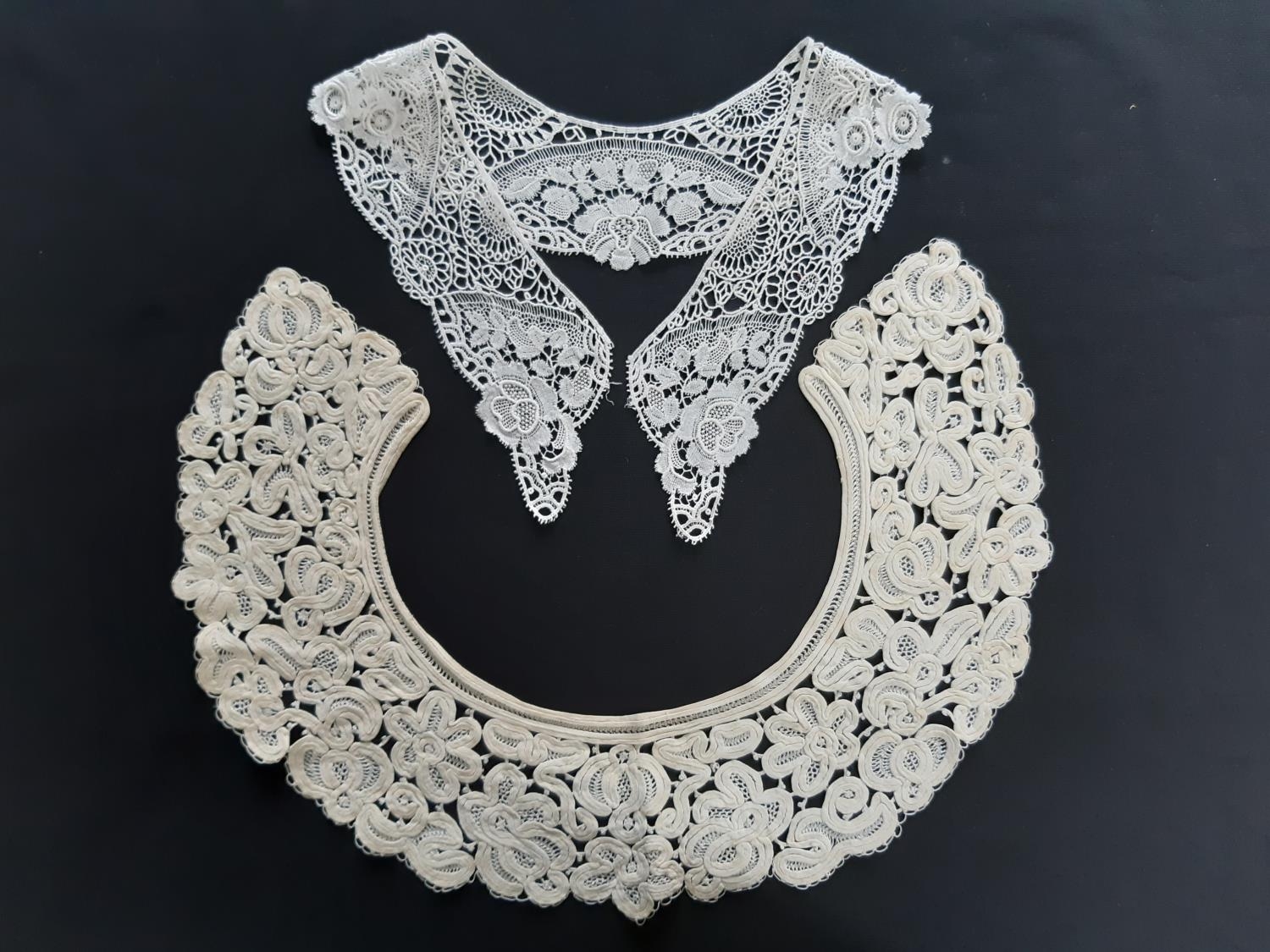 Collection of lacework including two 19th century lace collars one demonstrating a number of lace styles including Bucks Point edging lace and Battenburg tape lace flower motifs. The other is a 9cm wide collar hand stitched in the Battenburg style, using machine made tape, together with a pair of embroidered cotton lappets with Ayrshire style pulled thread work, a Victorian lappet cap of needle lace length 88cm, a 19th century Honiton lace baby cap and a machine made collar (7)