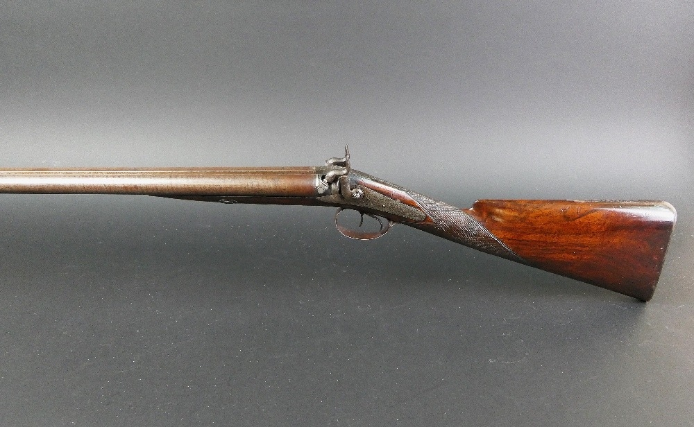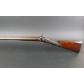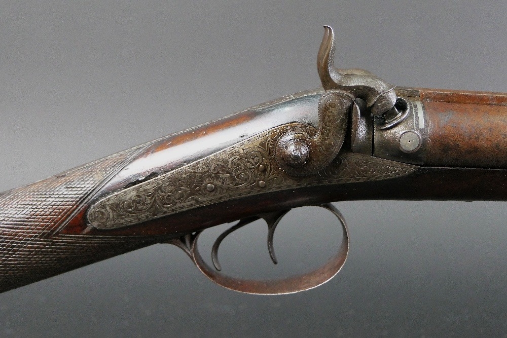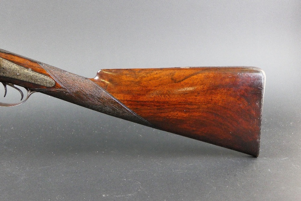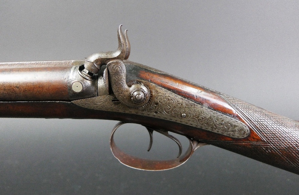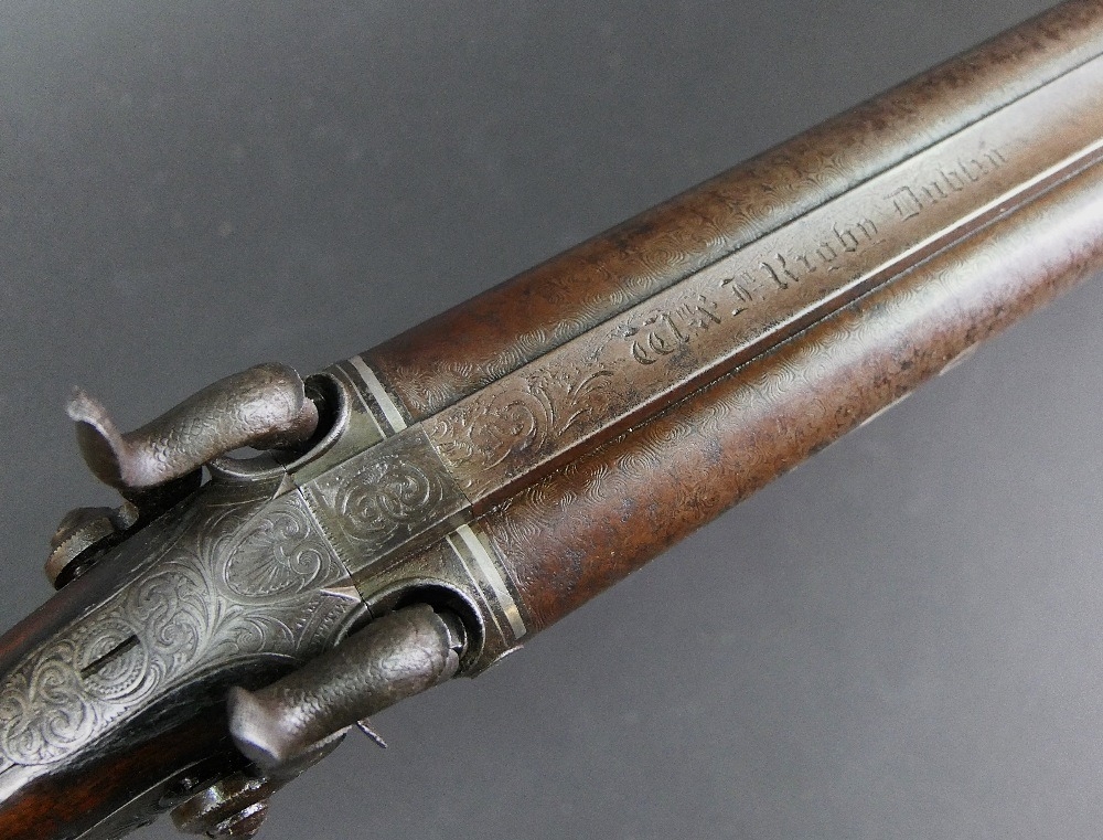 W & J Rigby Dublin 16 bore side by side hammer shotgun, with 28" damascus barrels, the rib marked WM & JN Rigby Dublin, having platinum lines and plugs, the hammers engraved in the manner of Dolphins and the locks with scroll engraving and marked WM & JN Rigby, with similar engraving to the trigger guard, double trigger with 14" stock with steel butt plate. NOTE: William and John Jason Rigby traded as W & J Rigby from 24 Suffolk Street Dublin circa 1850. Serial No. 8197. Sold as a section 58 obsolete calibre.