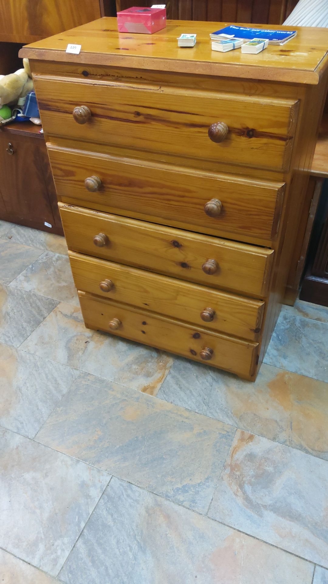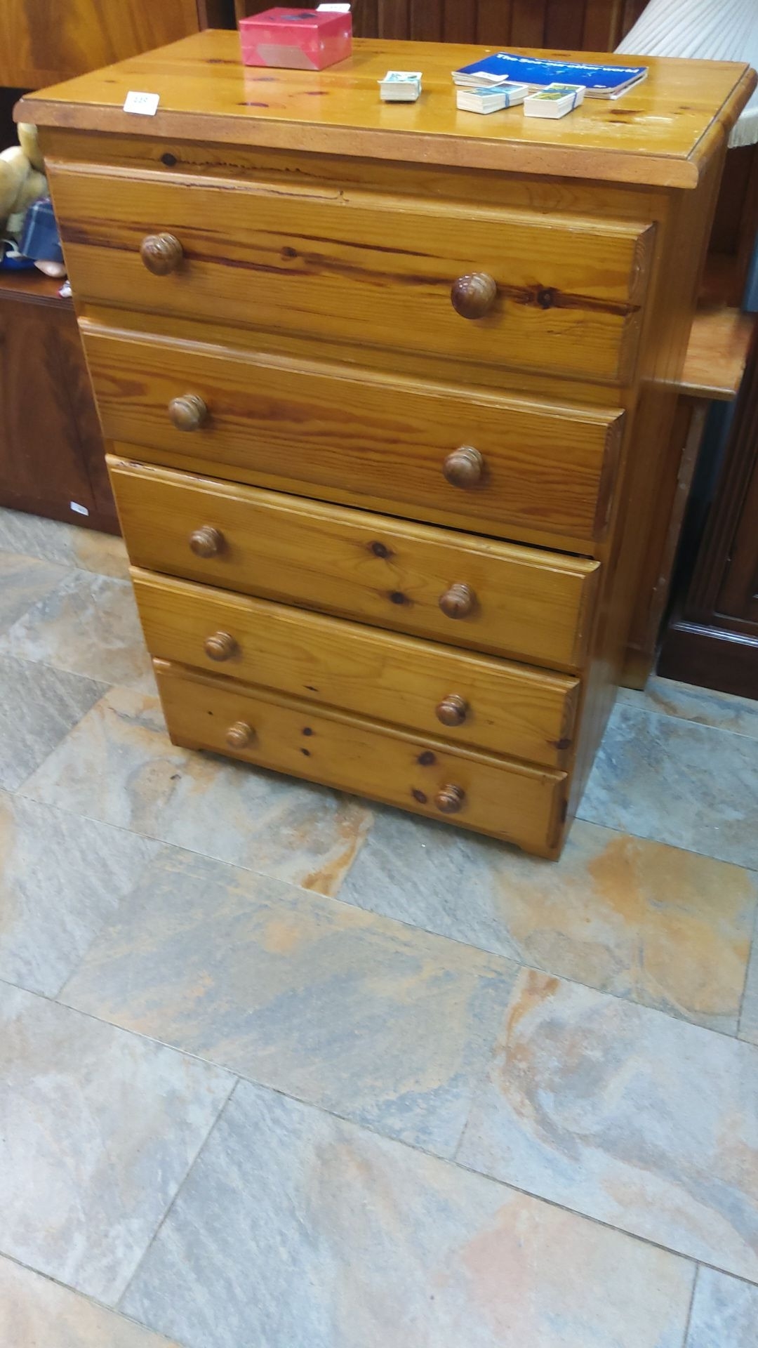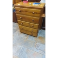 Pine chest of five drawers with round wooden knobs, showcasing natural grain.