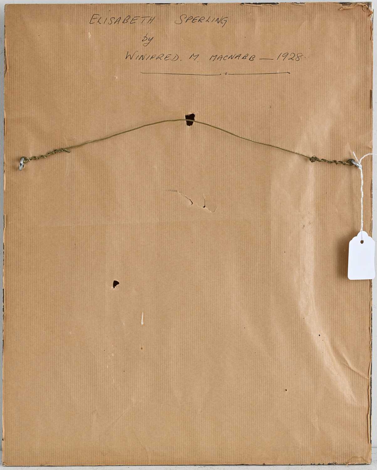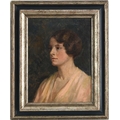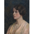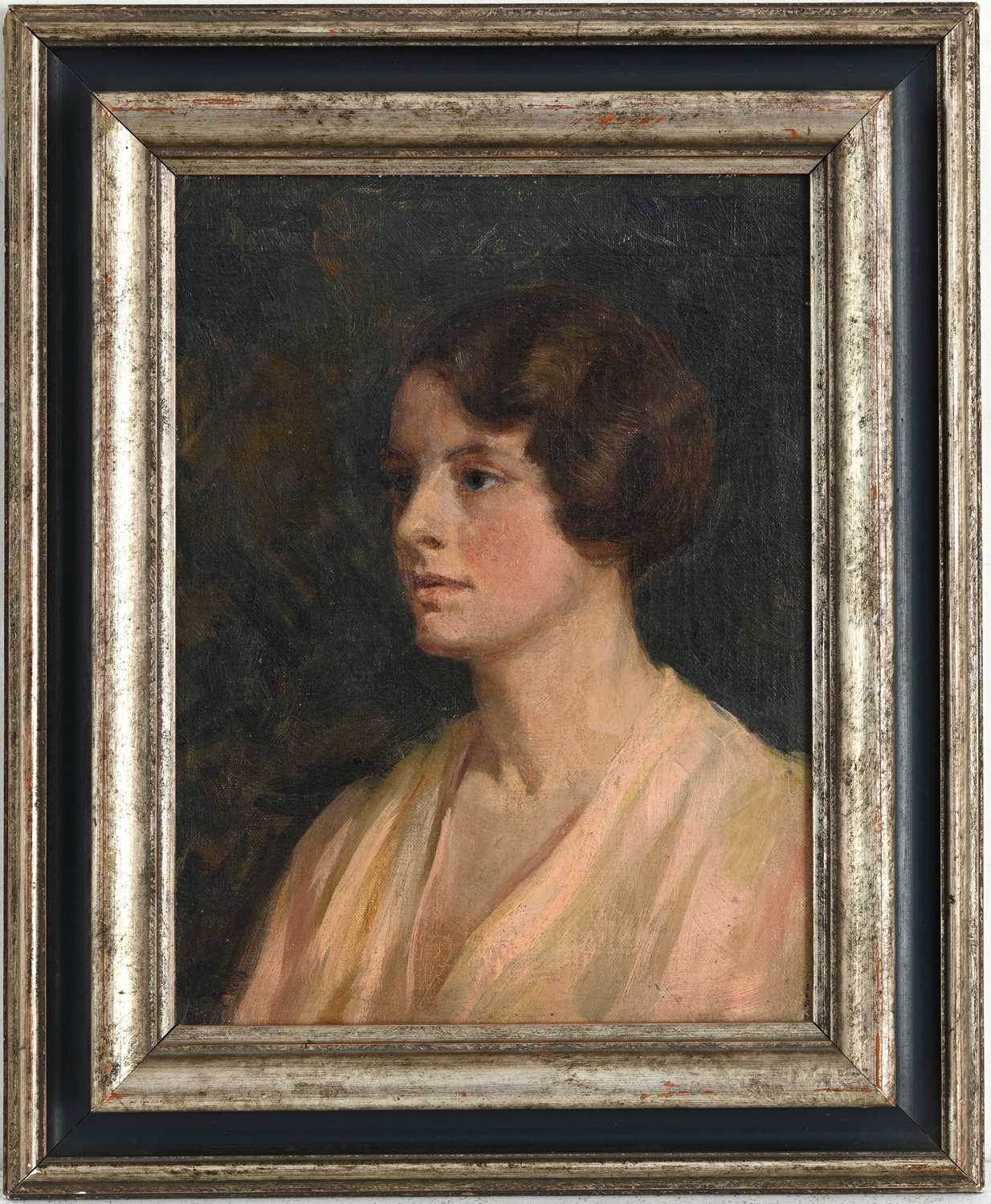 Winifred M. Macnabb (British, early 20th Century), portrait of Elisabeth Sperling, bust-length in slight profile, wearing a pink open-neck dress, titled and dated 1928 verso, oil on canvas, 33 by 24cm, framed