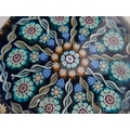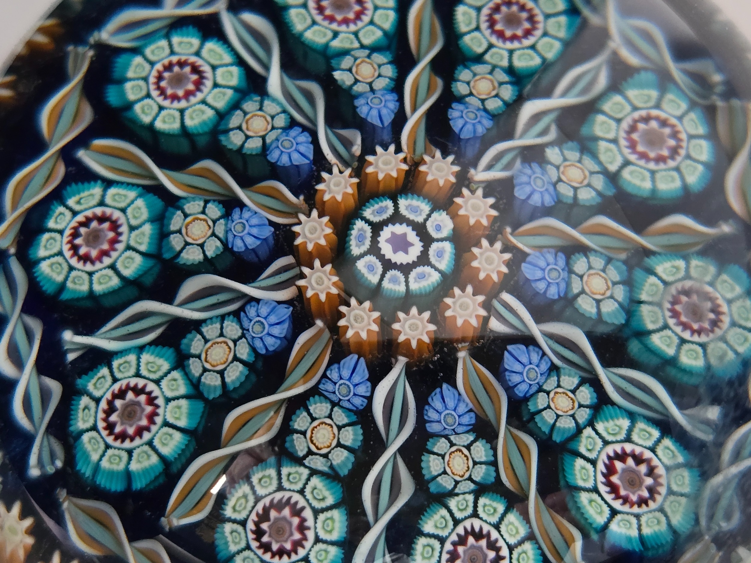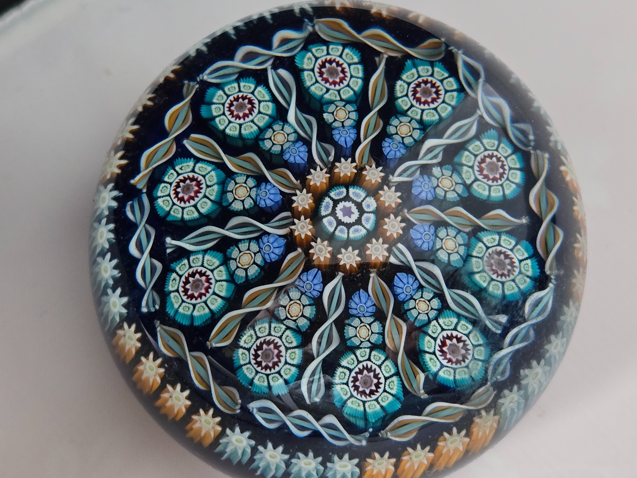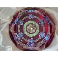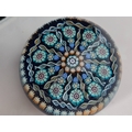 Perthshire paperweight: PP72. Attractive pattern of canes and radial spokes. Translucent blue ground. Excellent condition. 73mm diam. Boxed