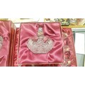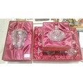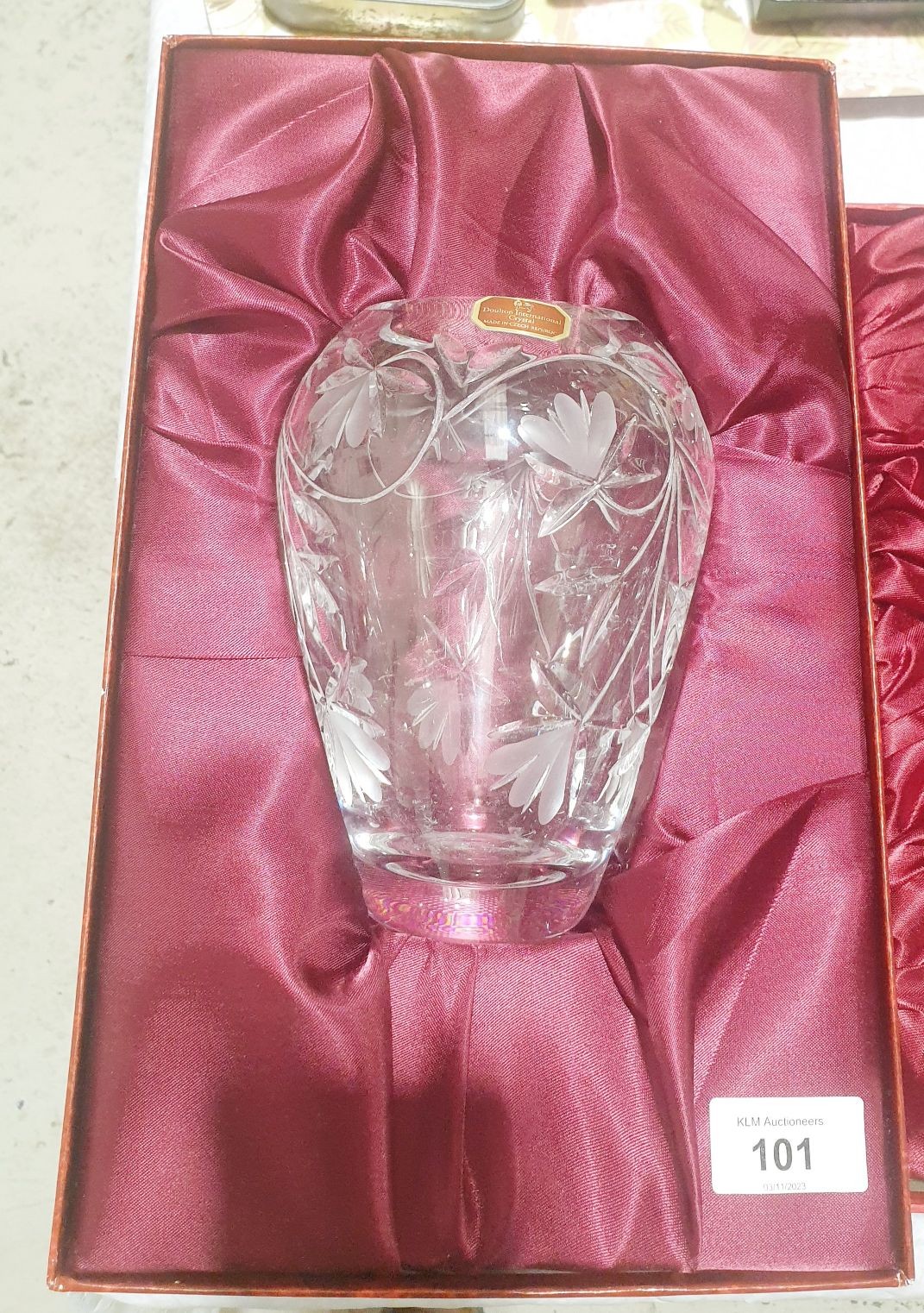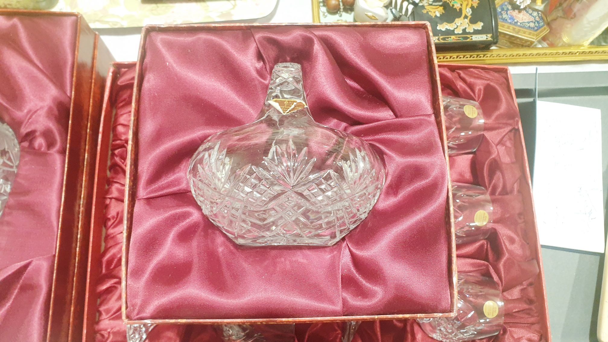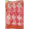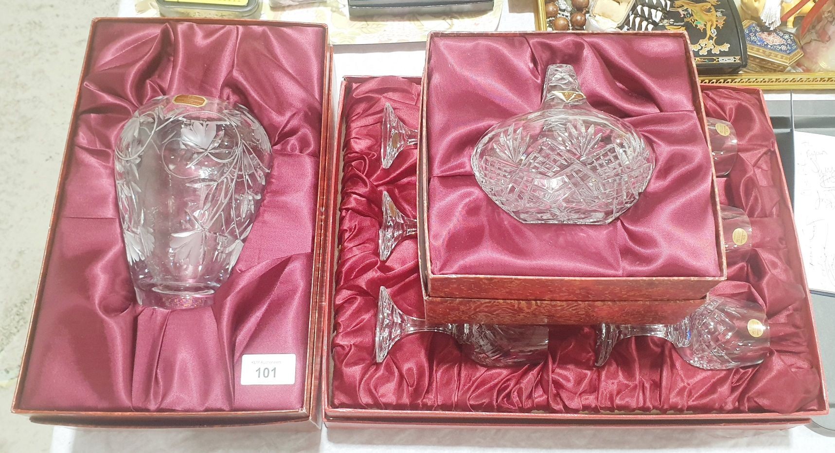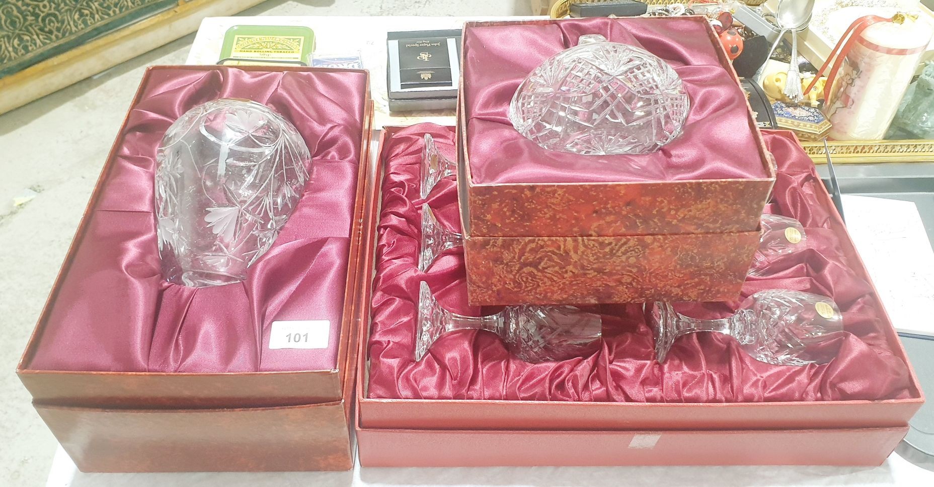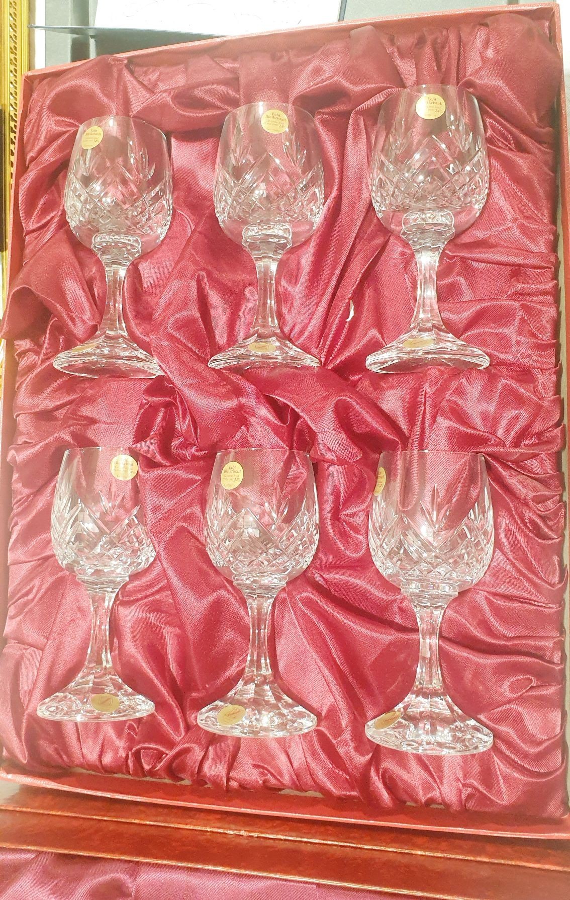 Six boxed Cristallerie Wiesel crystal wine glasses together with two pieces of boxed Royal Doulton crystal. No shipping. Arrange collection or your own packer and shipper, please.