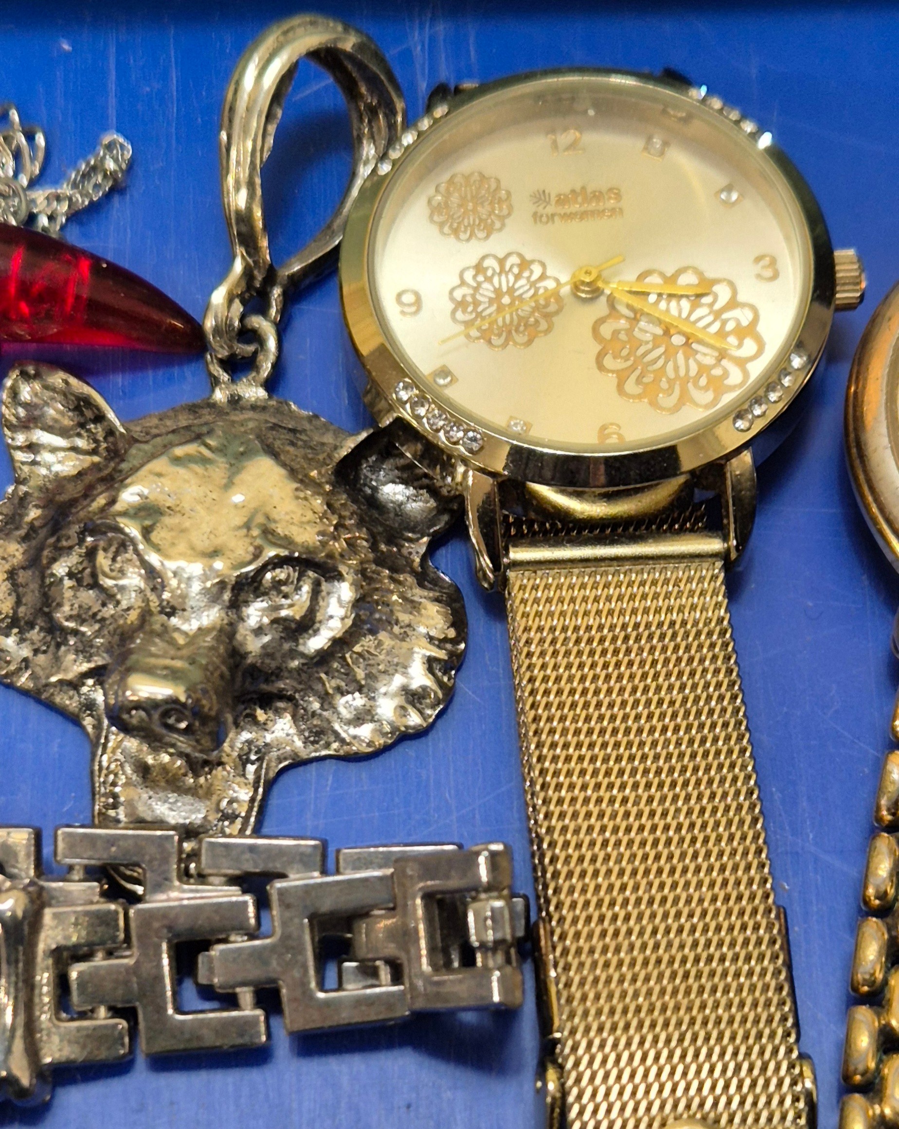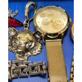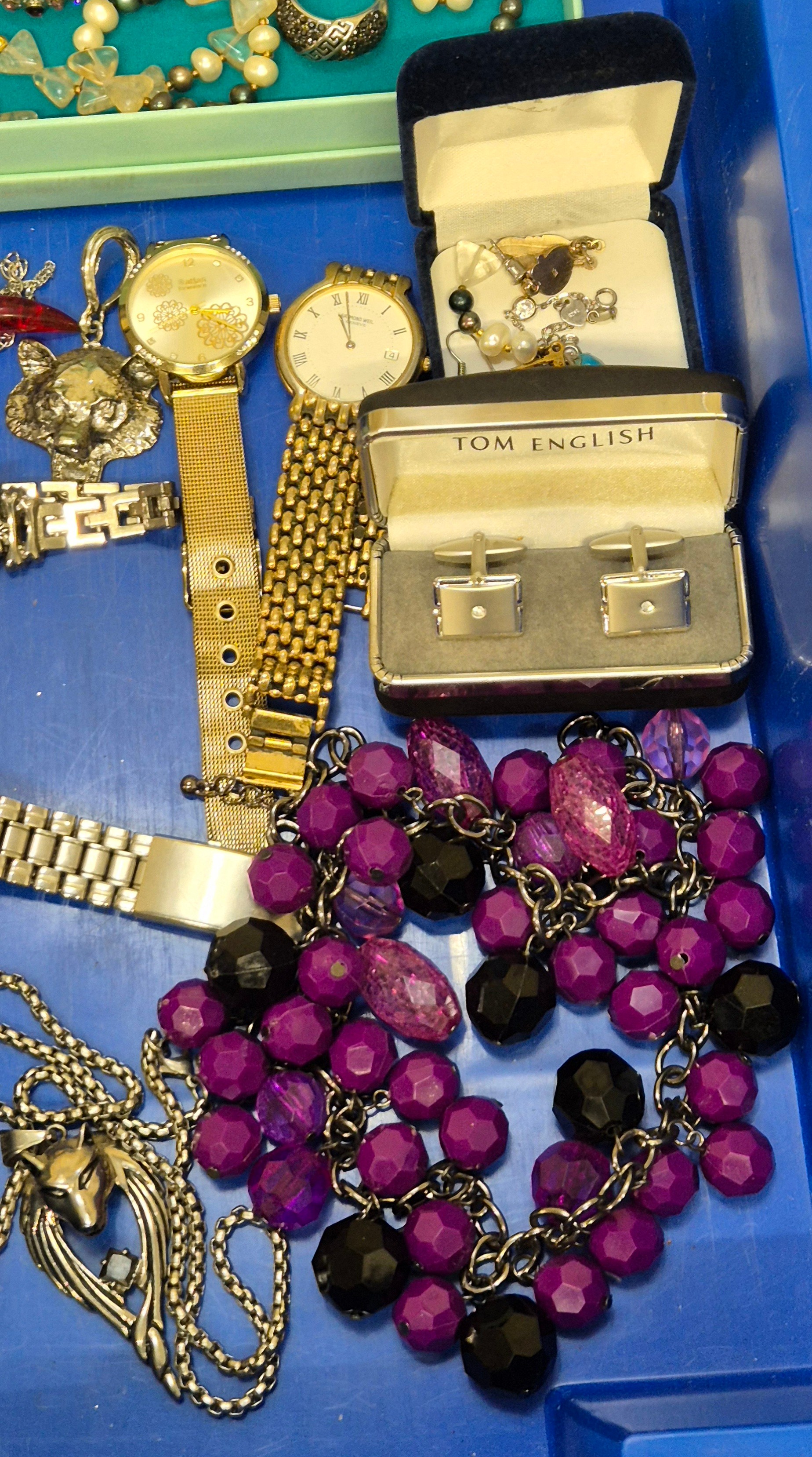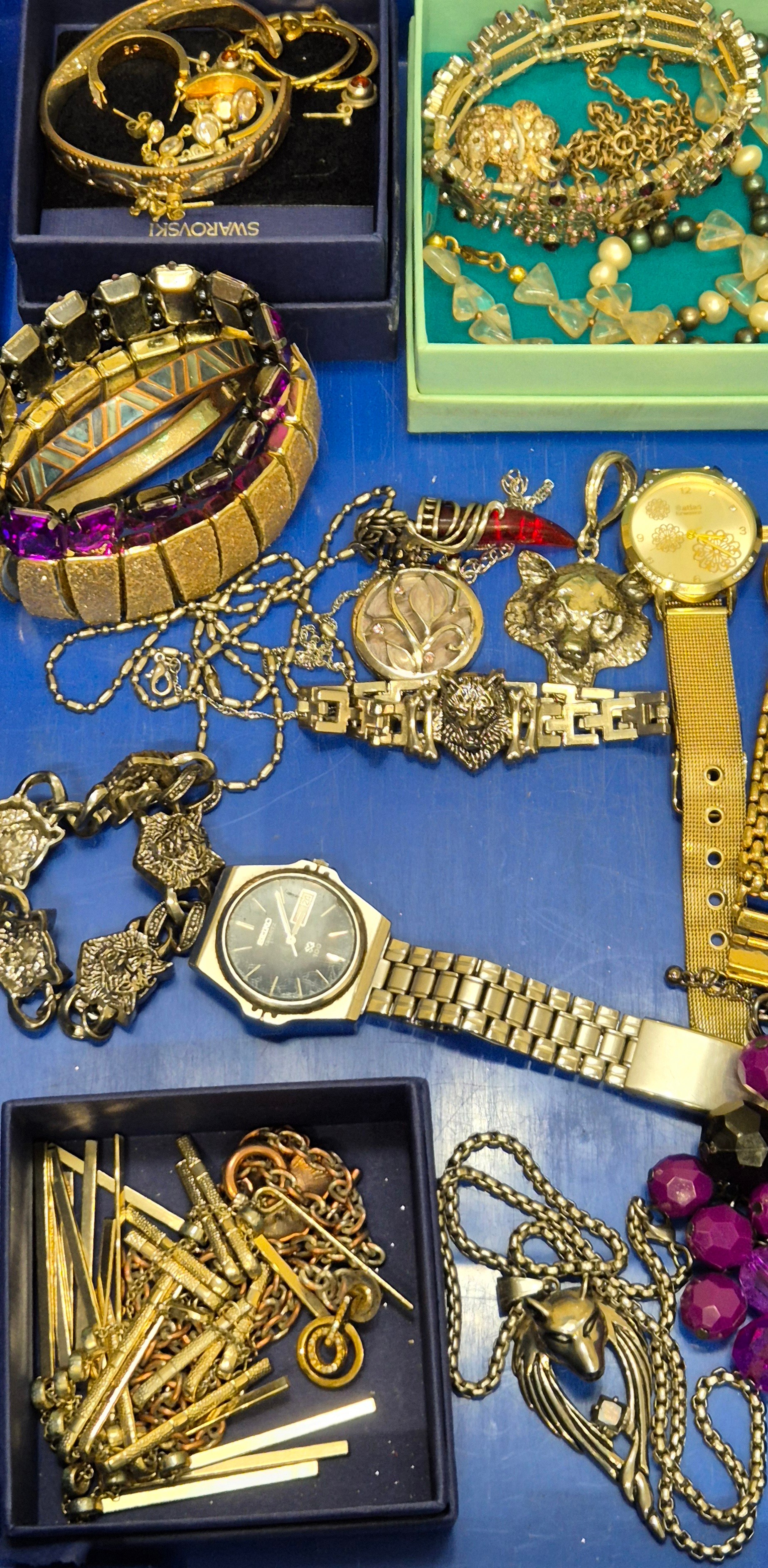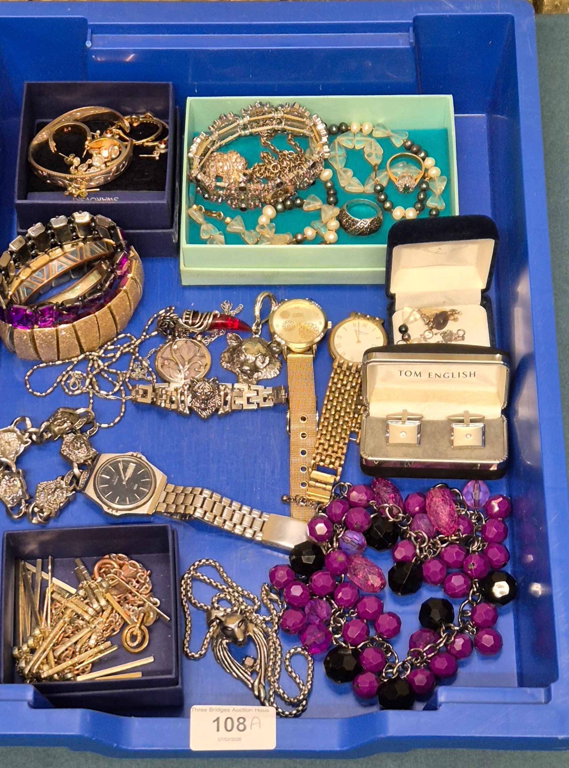 Tray of costume jewellery and watches; Seiko quartz 100, Raymond Weil and Atlas watches.