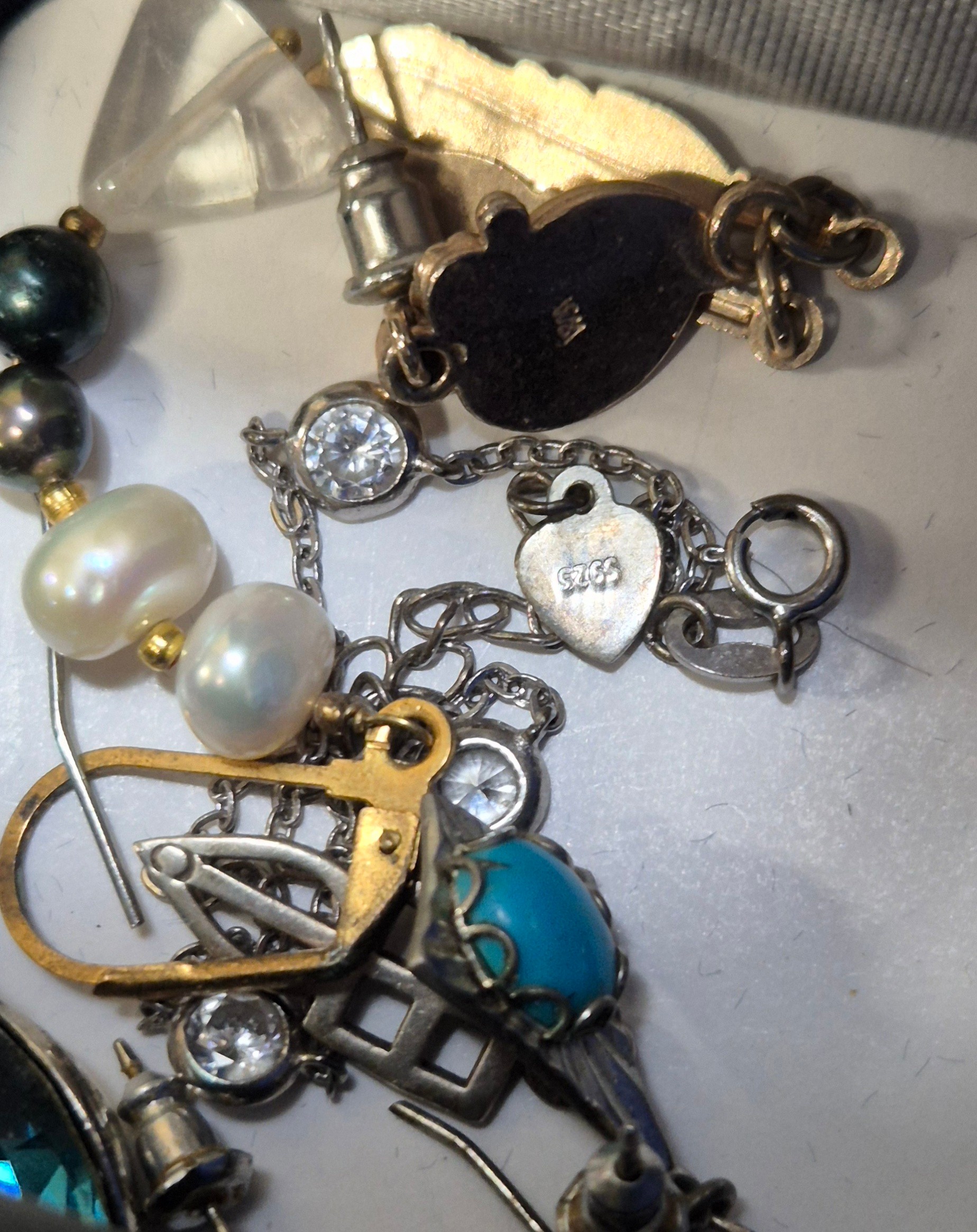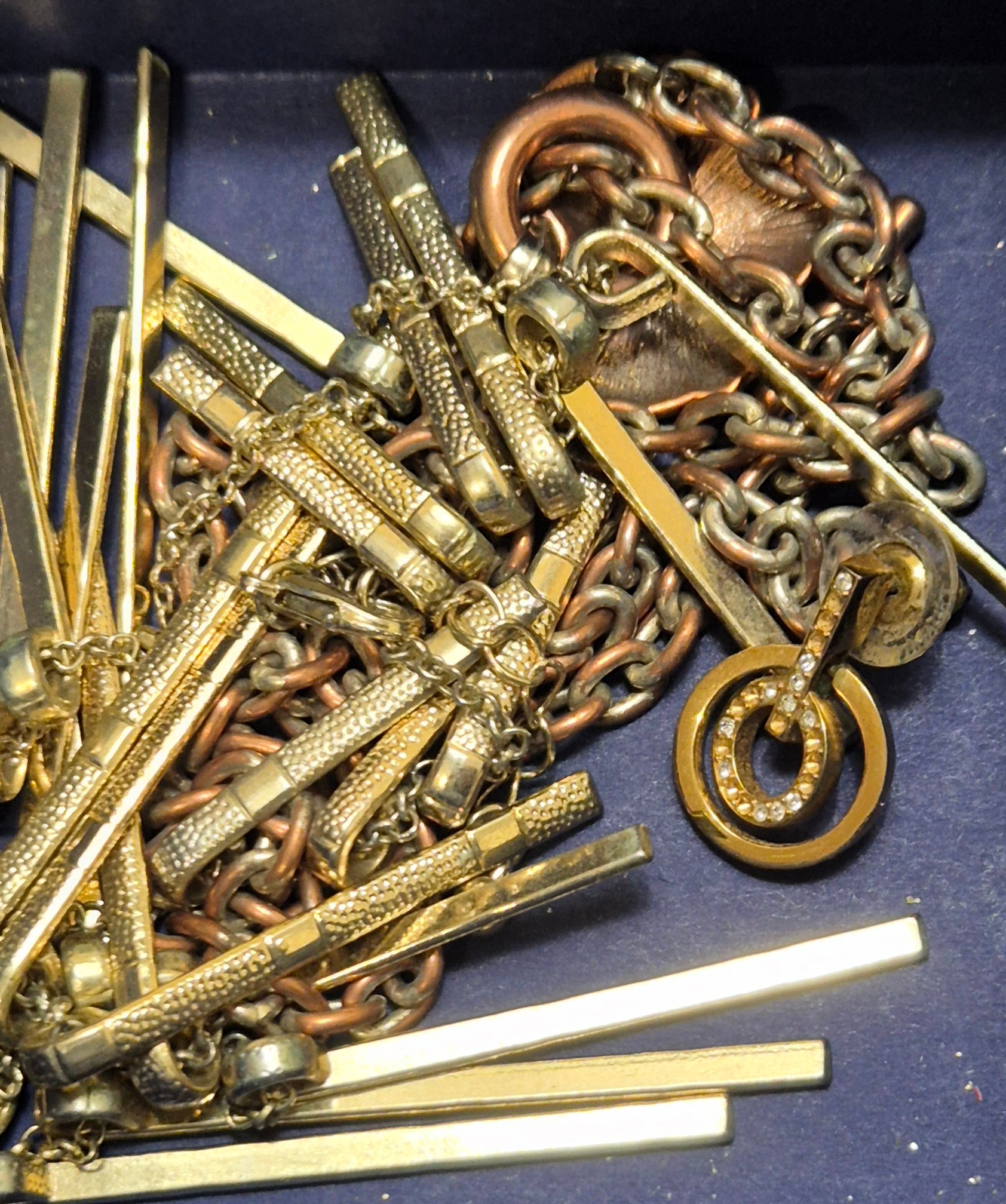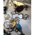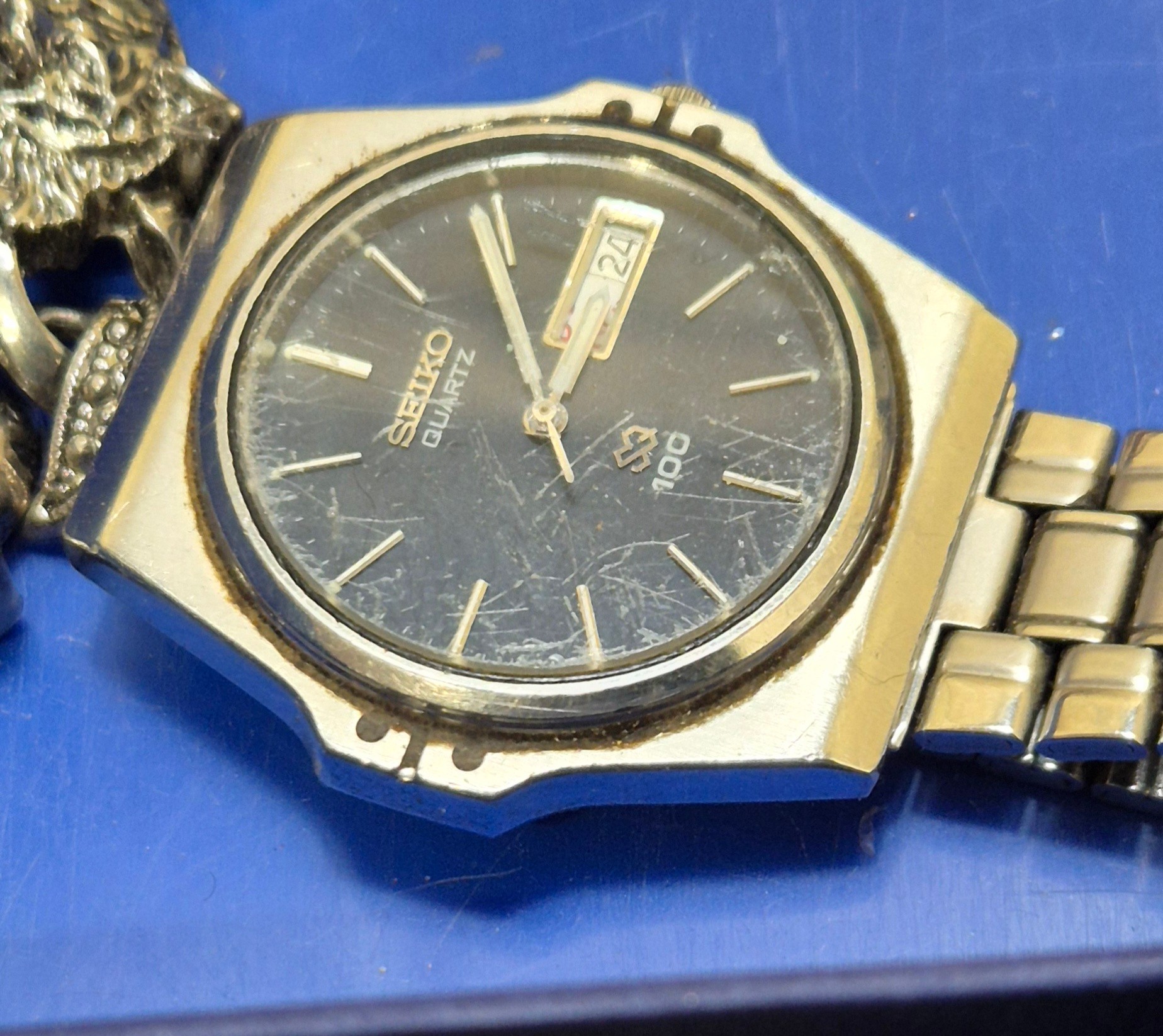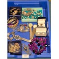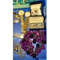 Tray of costume jewellery and watches; Seiko quartz 100, Raymond Weil and Atlas watches.
