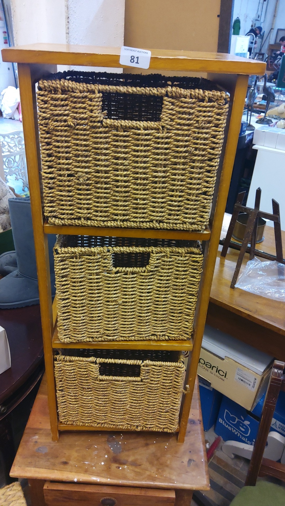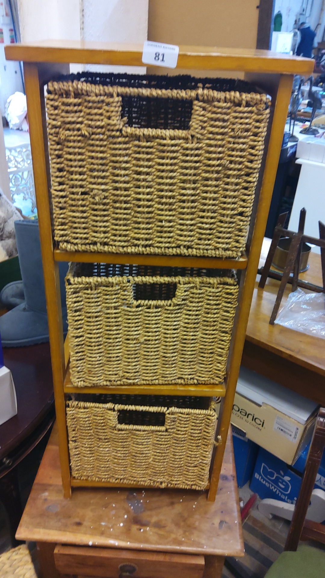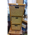 Contemporary honey-stained wood three-tier standing shelf fitted with three removable woven rush baskets, each with integral handhold aperture revealing a darker interior weave; open rectangular frame with square uprights and plain top.