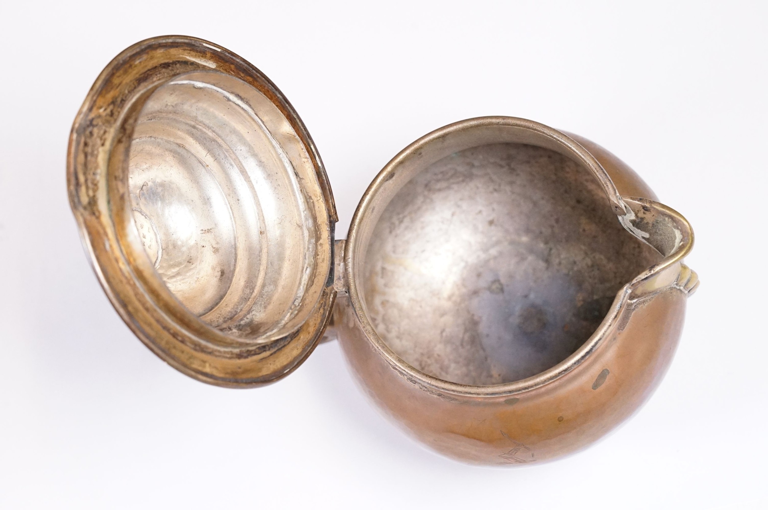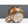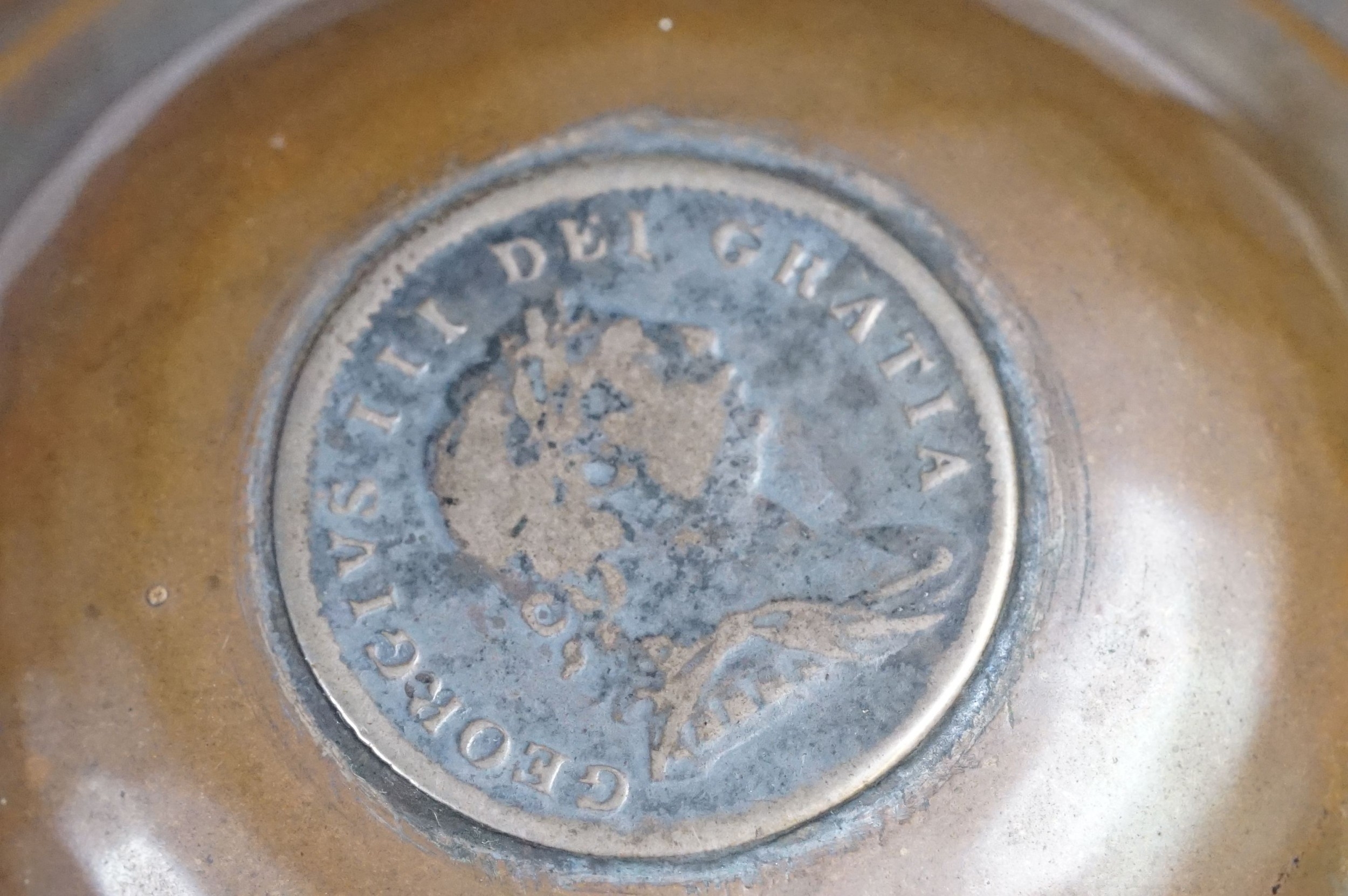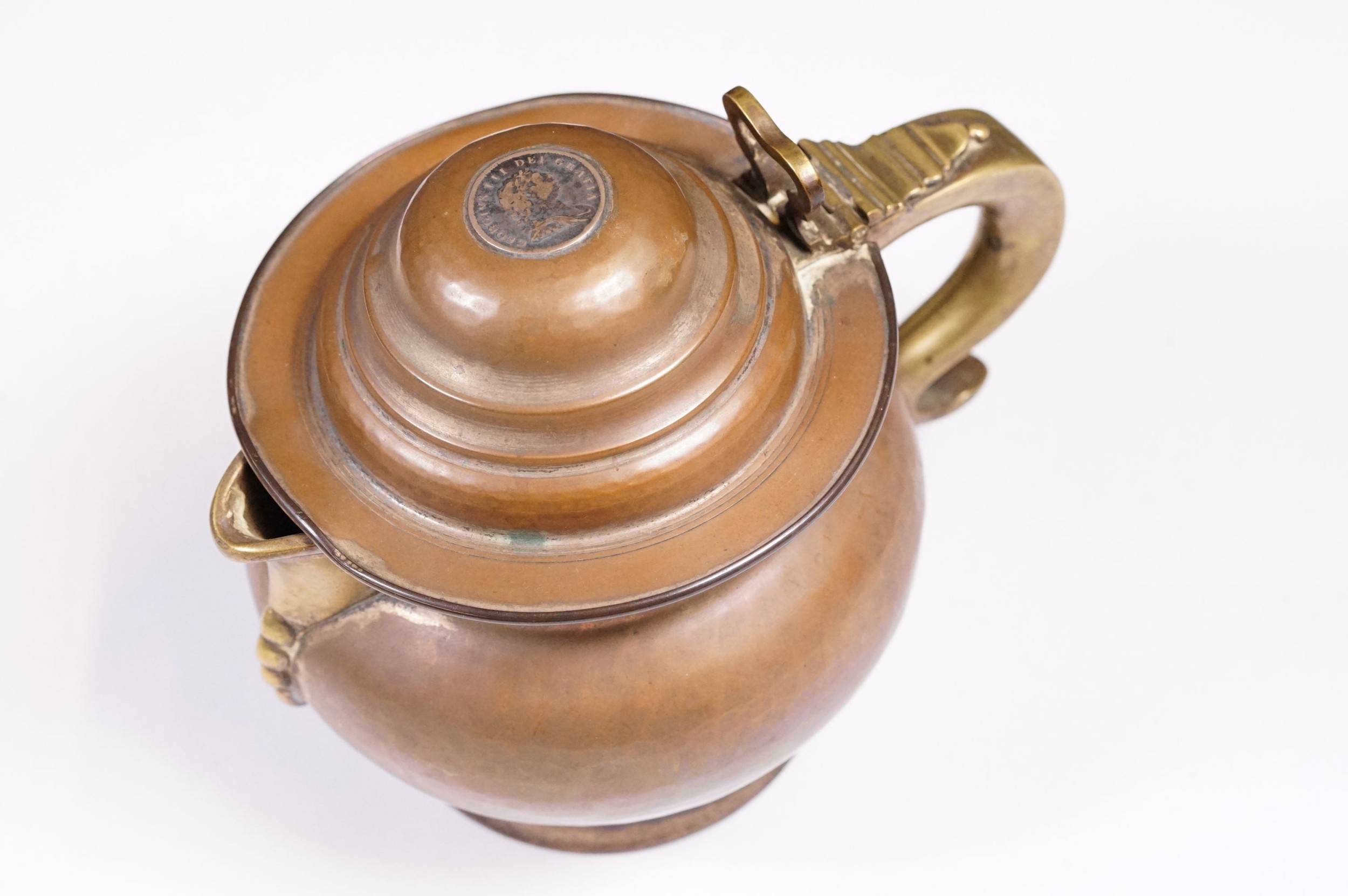 An antique Georgian copper ale tankard set with King George III coin to the lid.