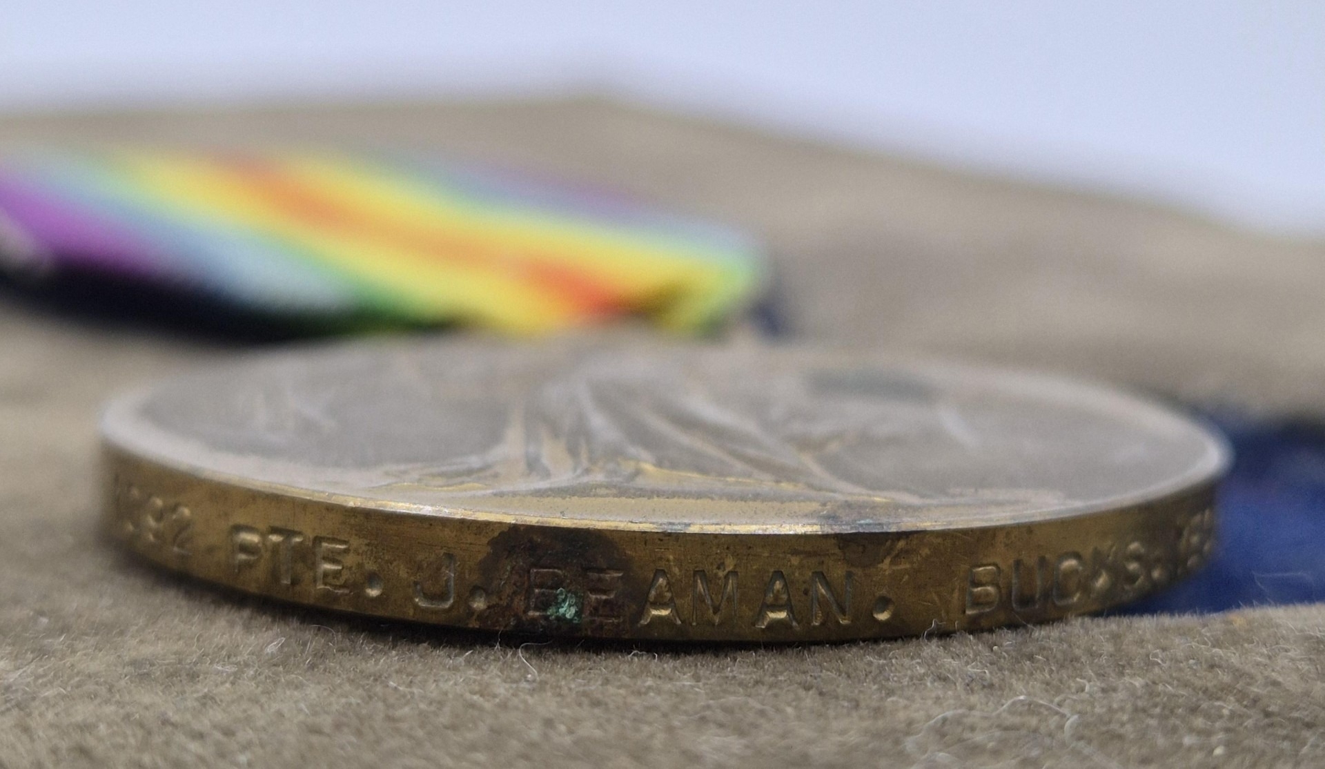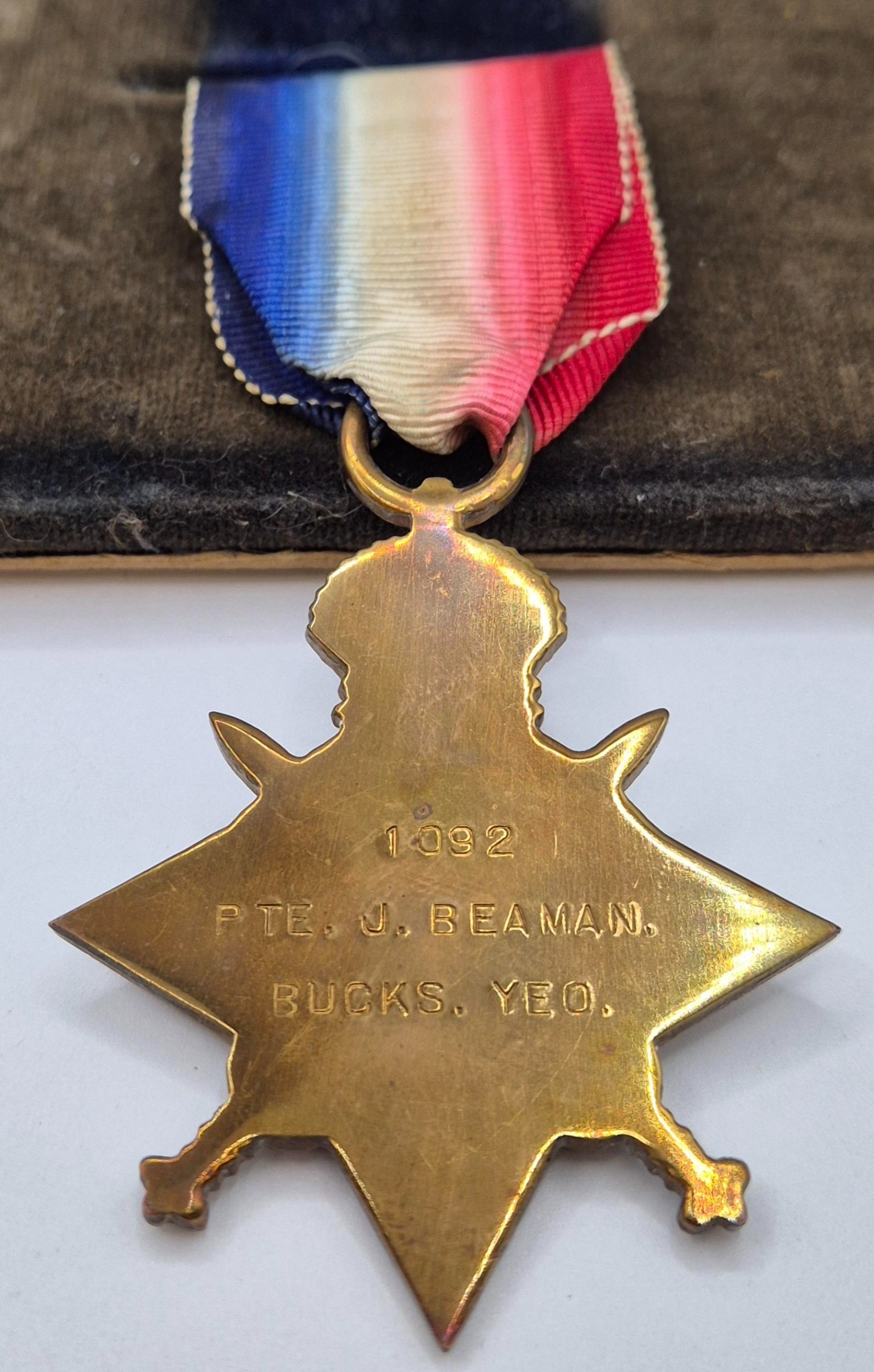 WWI Medals awarded to 1092 Pte J Beaman, Bucks Yeomanry. To include 1914-15 Star Medal, 1918 British War Medal & Victory Medal. Each with original ribbon & housed in a partial presentation case.