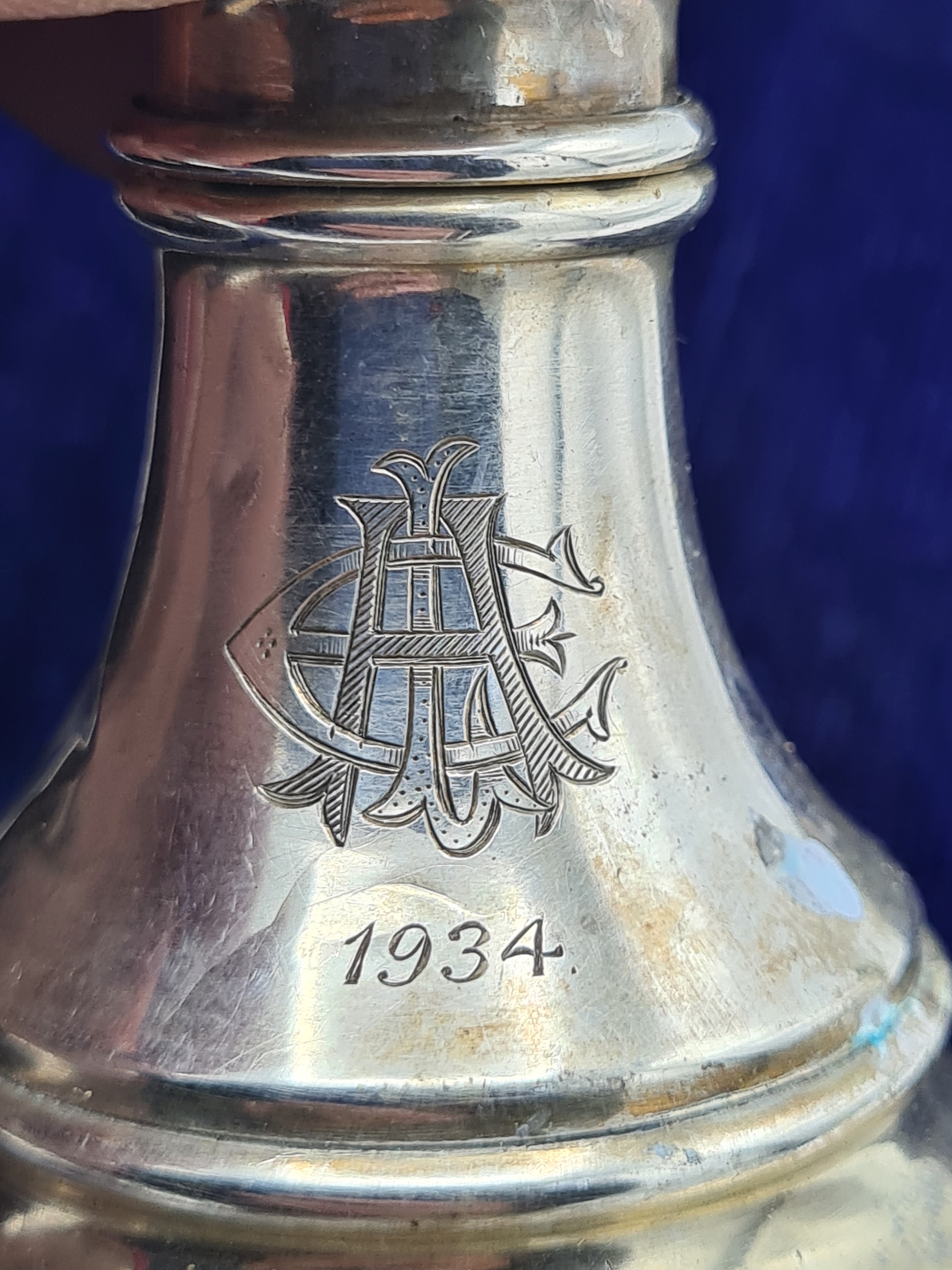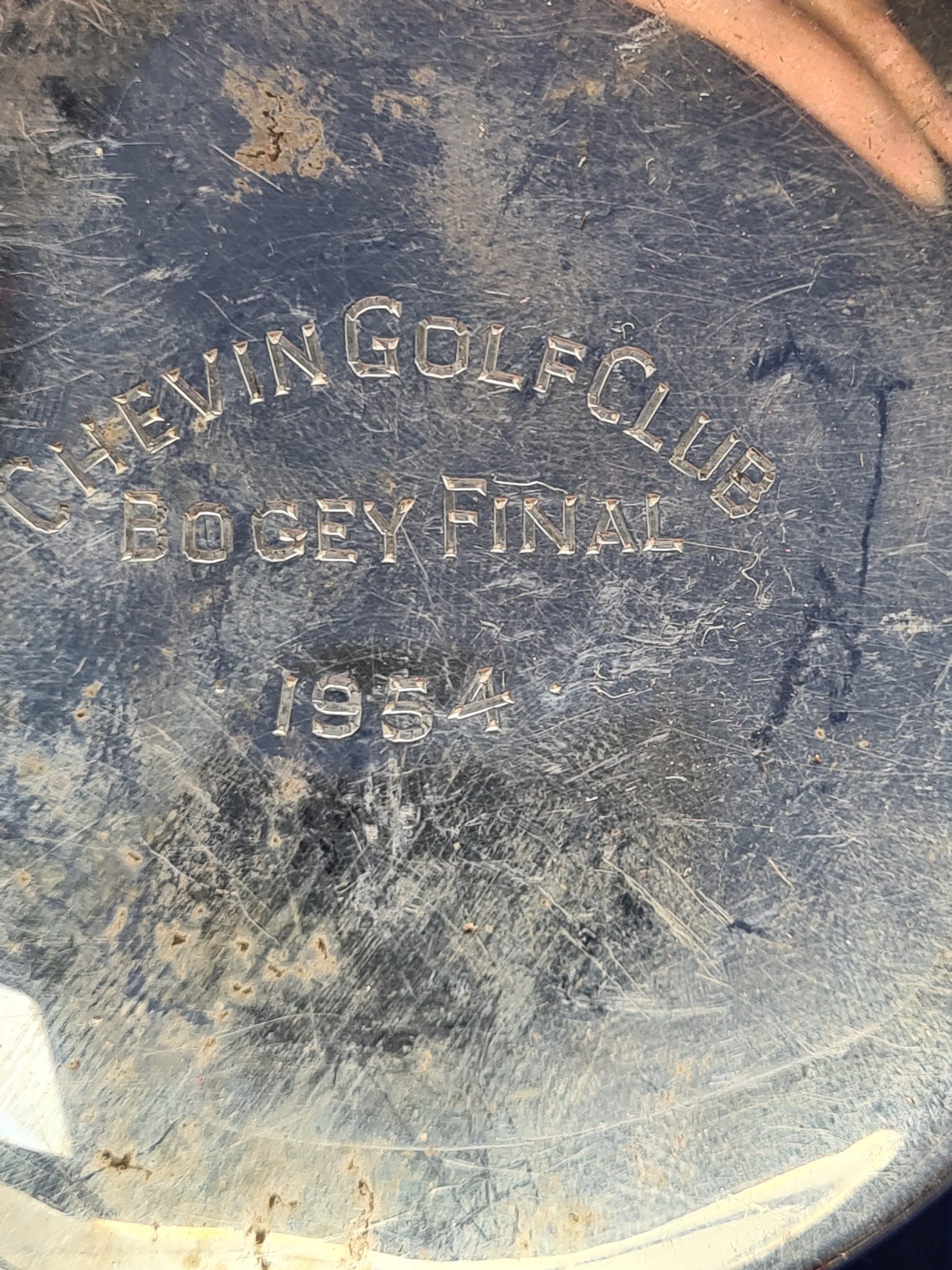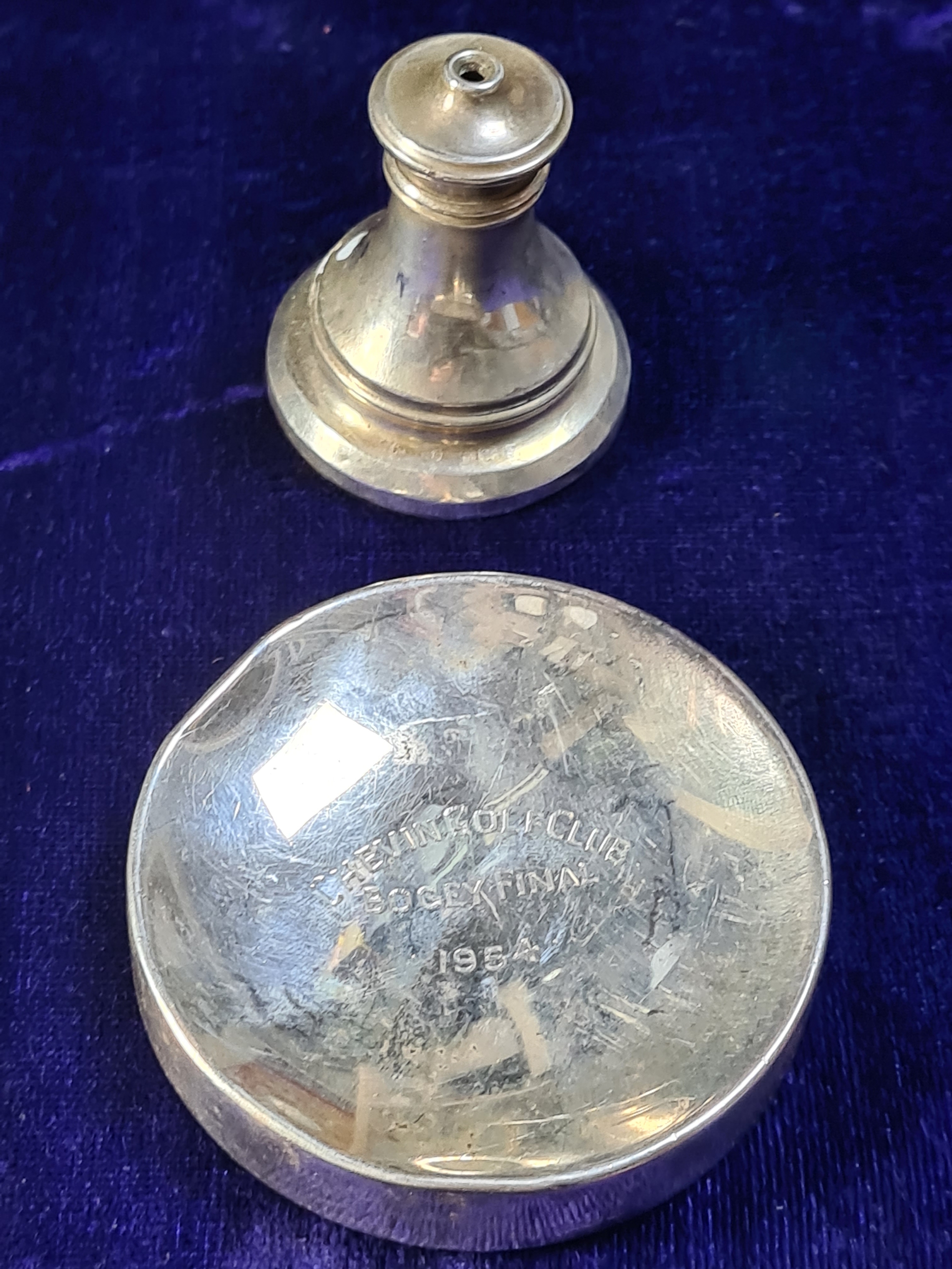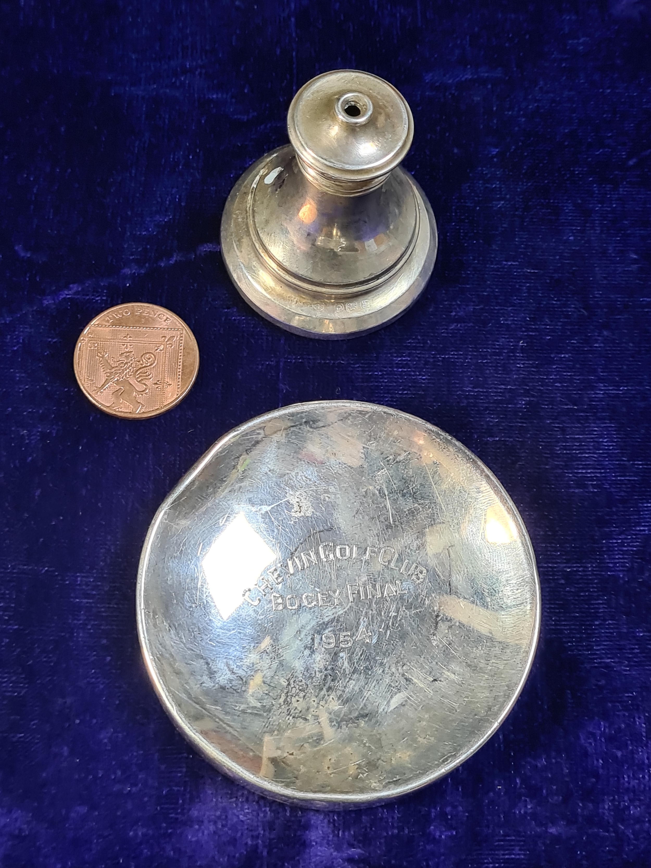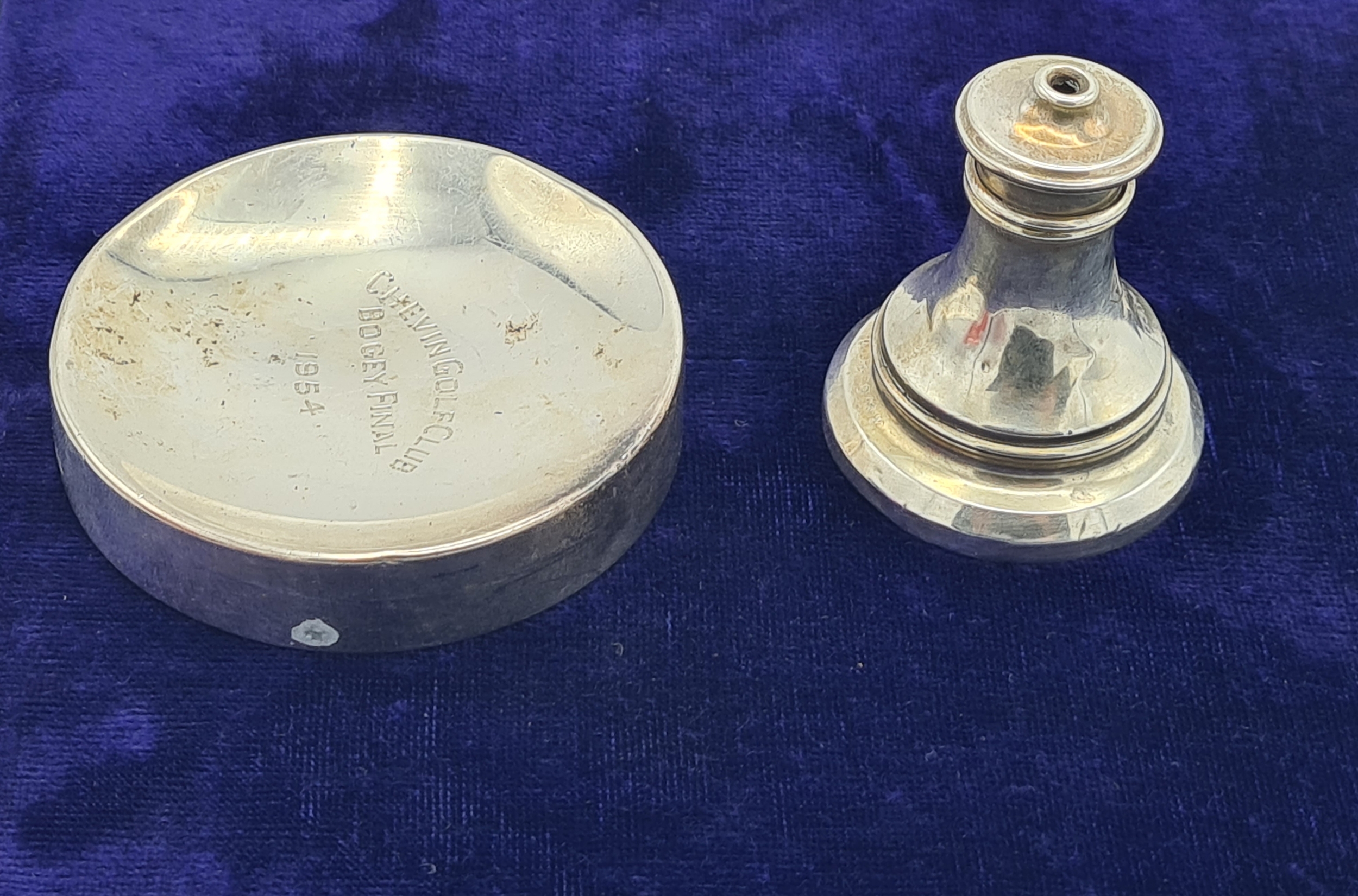 2 Sterling Silver items to include a weighted Chevin Golf Club award 1954 paperweight and an ink well engraved CLH 1934.