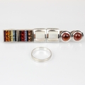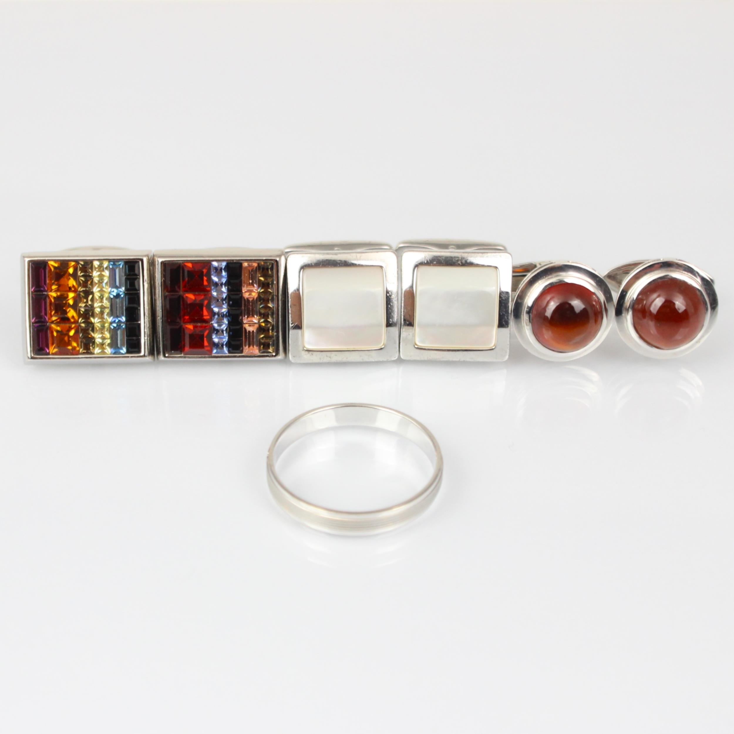 A selection of cufflinks, including a pair of Paul Smith multi paste set examples, stamped to toggle 'Paul Smith' a pair of white metal untested garnet cabochon cufflinks, stamped '375' (9ct gold) a pair of Dunhill mother of pearl examples, stamped 'AD 925' (sterling silver) and a white metal ring, stamped 'Italy 750' (18ct white gold) ring size U, gross weight 42gms (7)