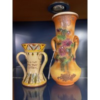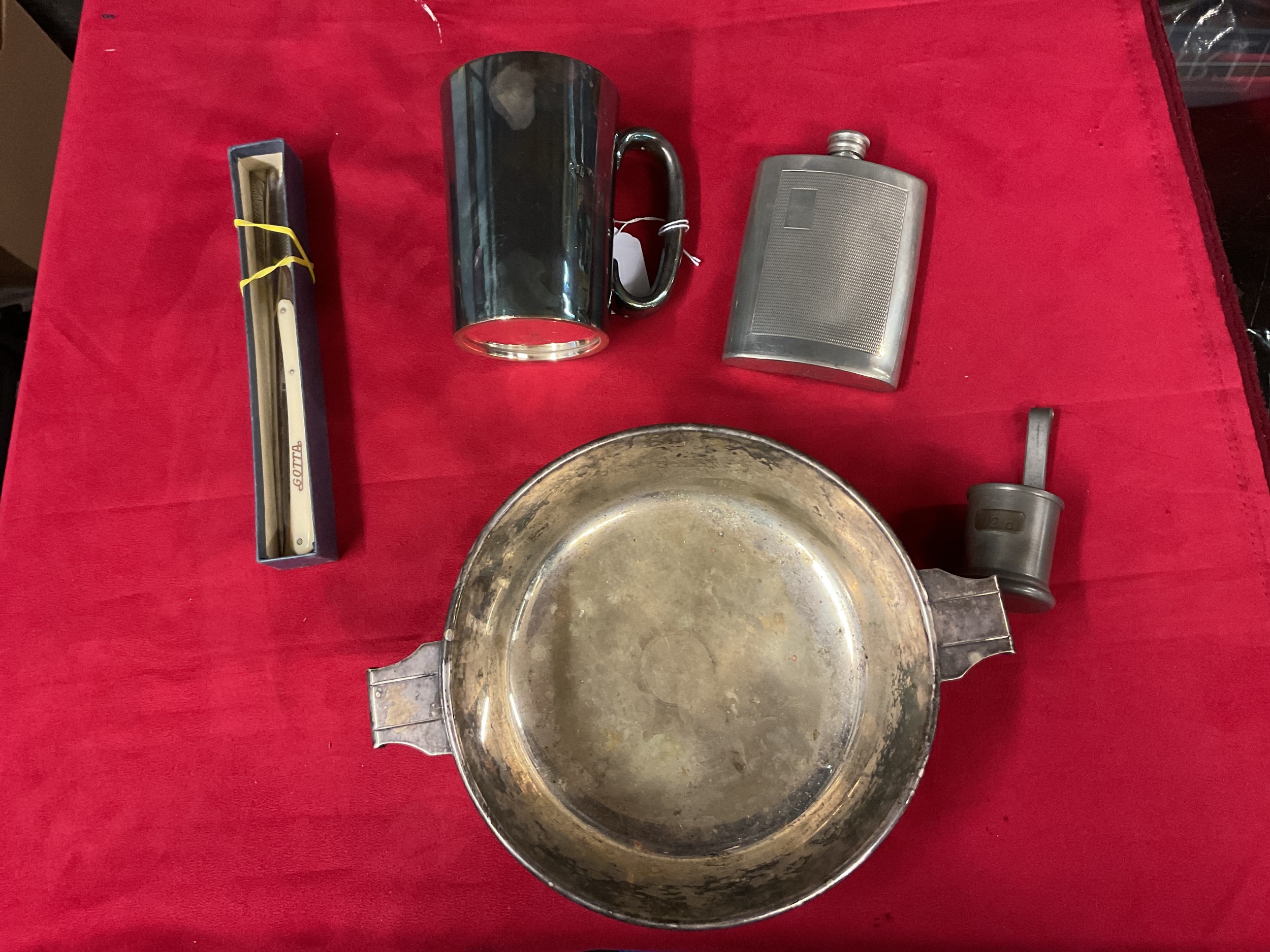 A mixed selection of silver-plated items to include a art deco fruit bowl, tankard, hip flask, an antique arrow head meat skewer, a vintage Gotta Hamburg superfine razor, and a pewter measure