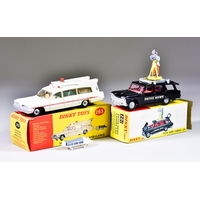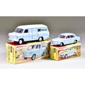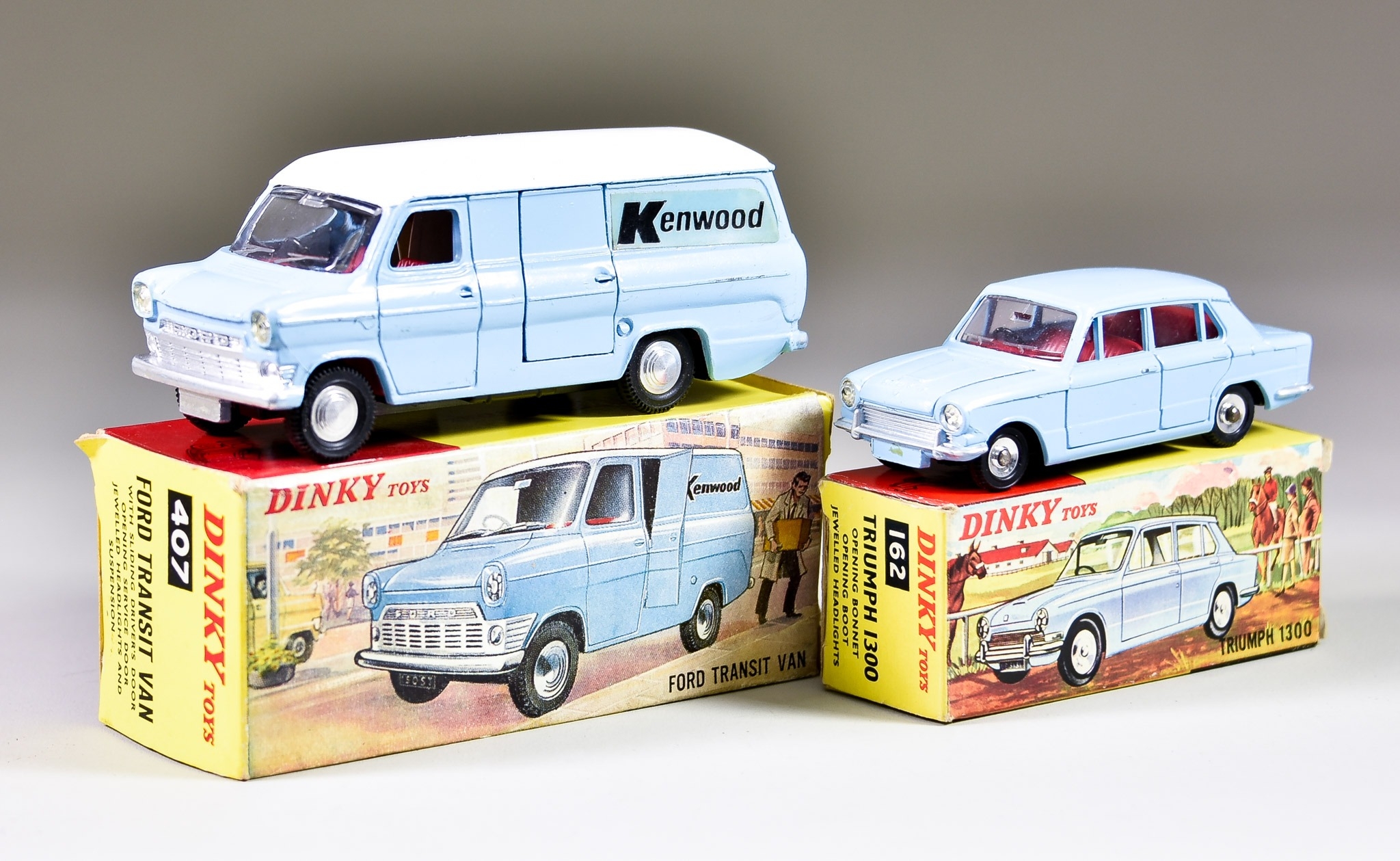 Two Dinky Toys Diecast Model Cars, comprising - No. 407 "Ford Transit Van", with white over blue body, spun hubs, red interior and Kenwood decal, and No. 162 "Triumph 1300", with blue body, spun hubs, red interior and black steering wheel, both in original boxes