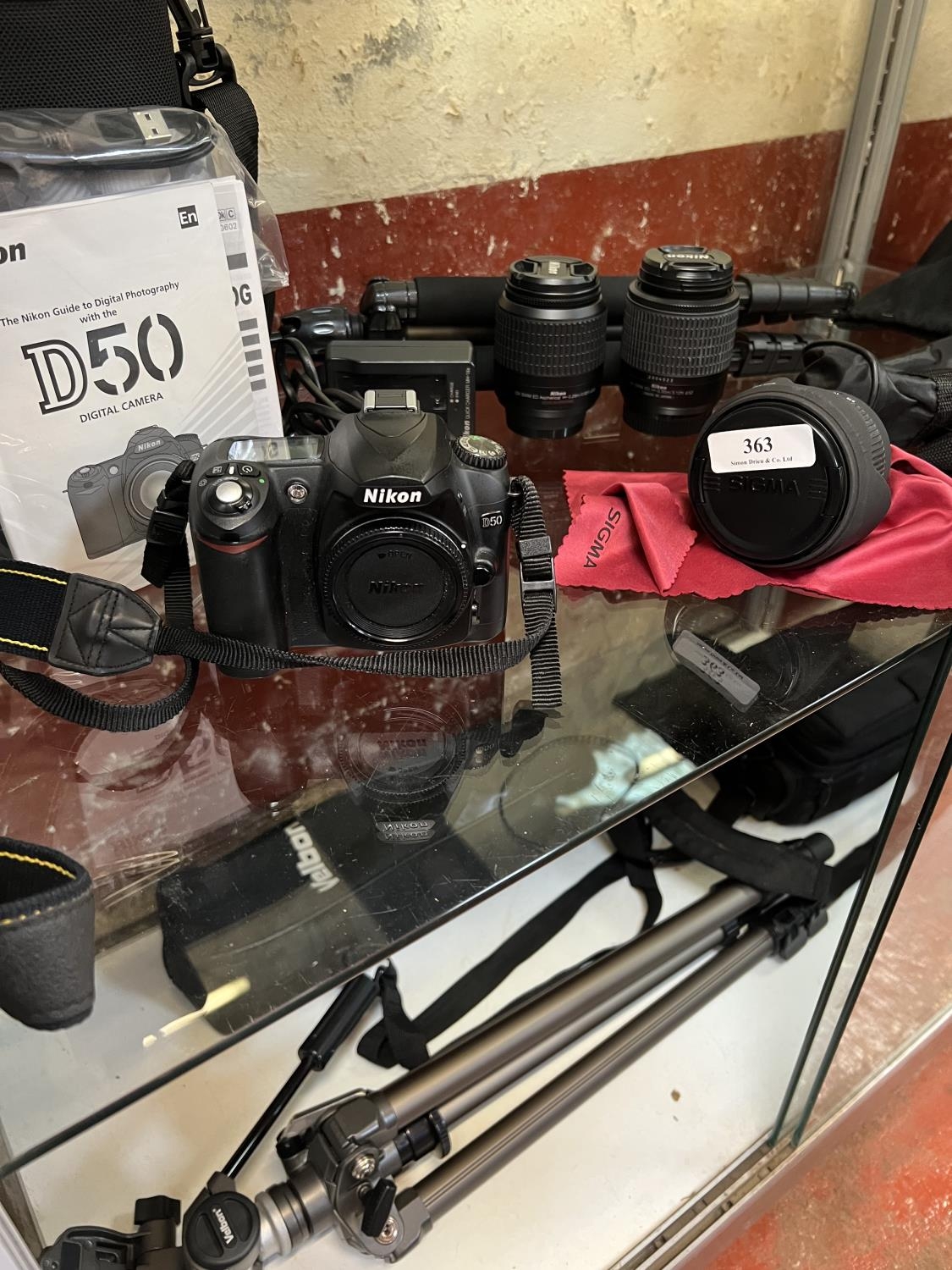 A Nikon D50 digital camera together with various lens, tripods and associated items