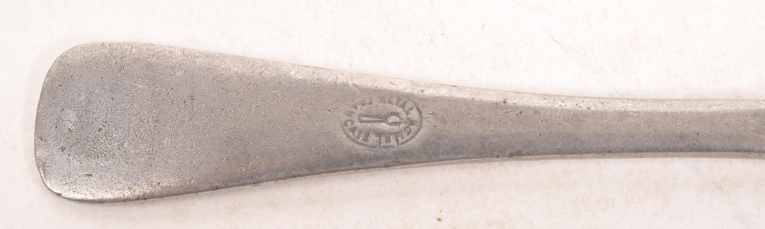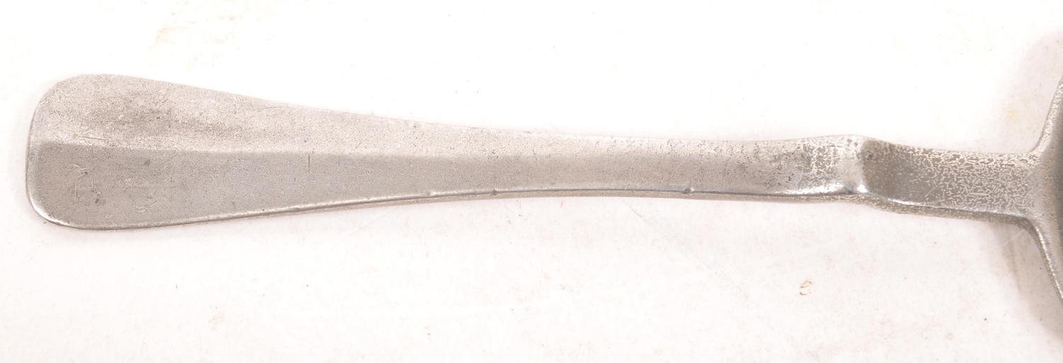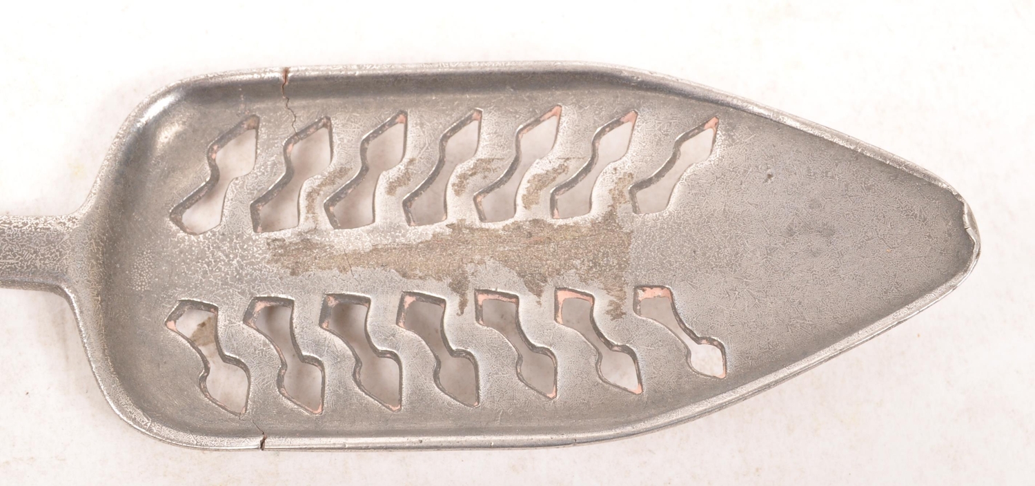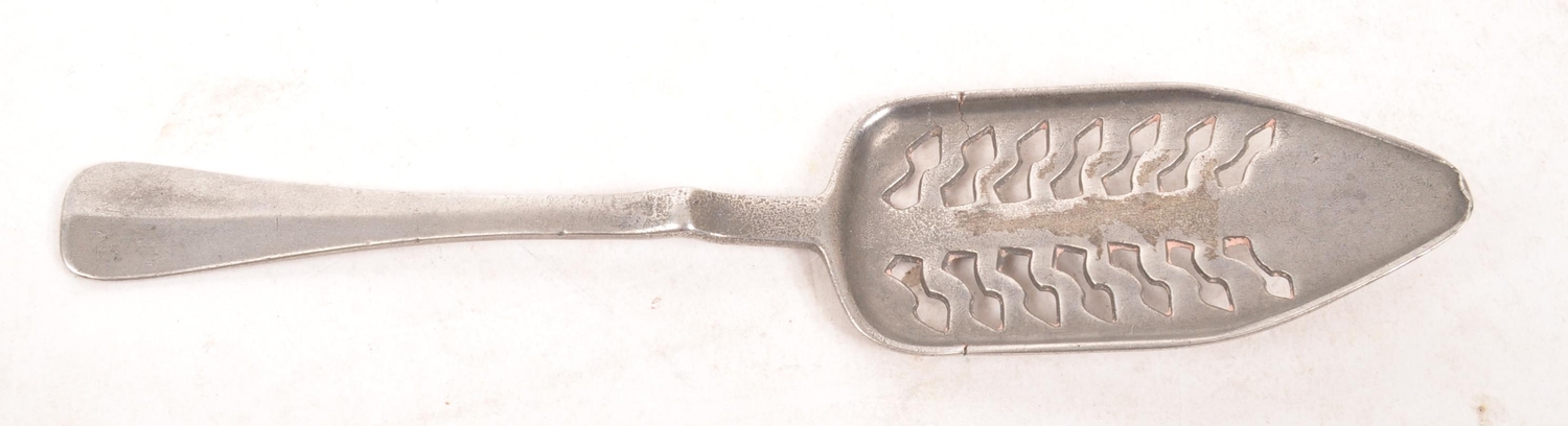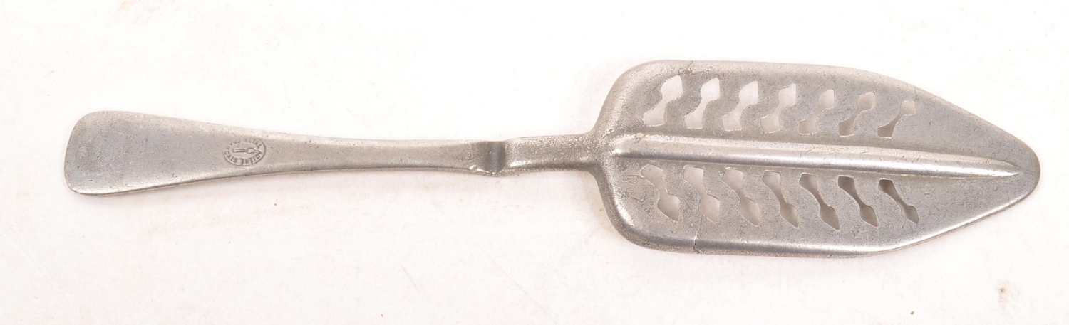 A late 19th century French white metal absinthe spoon. The spoon having a pierced basin with a handle in the Prescott pattern. Stamped. Measures approx 16cm length.