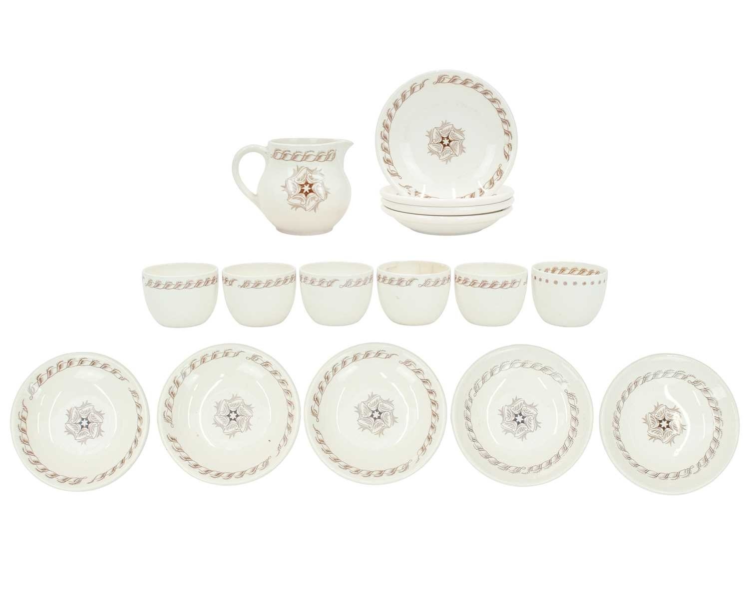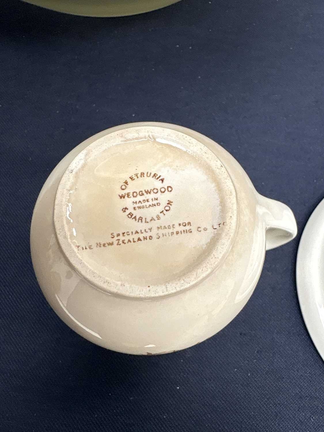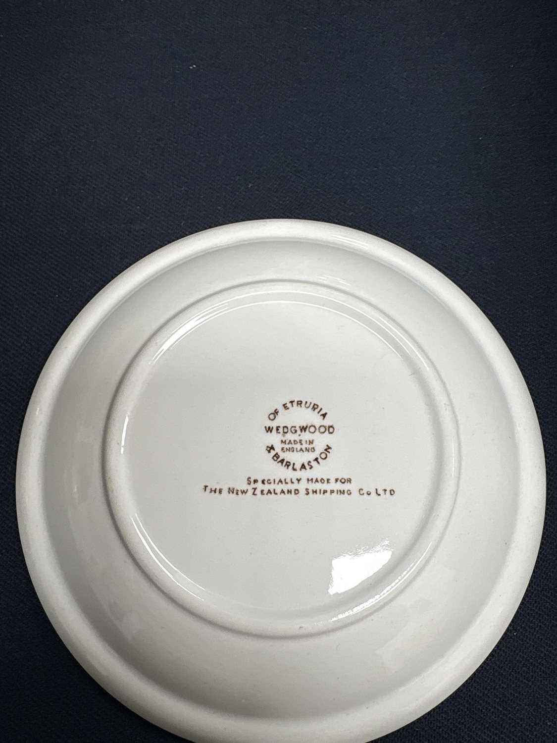 Wedgwood Edward Bawden tea ware specially made for the New Zealand Shipping Co. Comprising nine saucers, six small bowls, and a milk jug, printed marks, the saucers diameter 11cm. Two cups have cracks, and the jug is discoloured