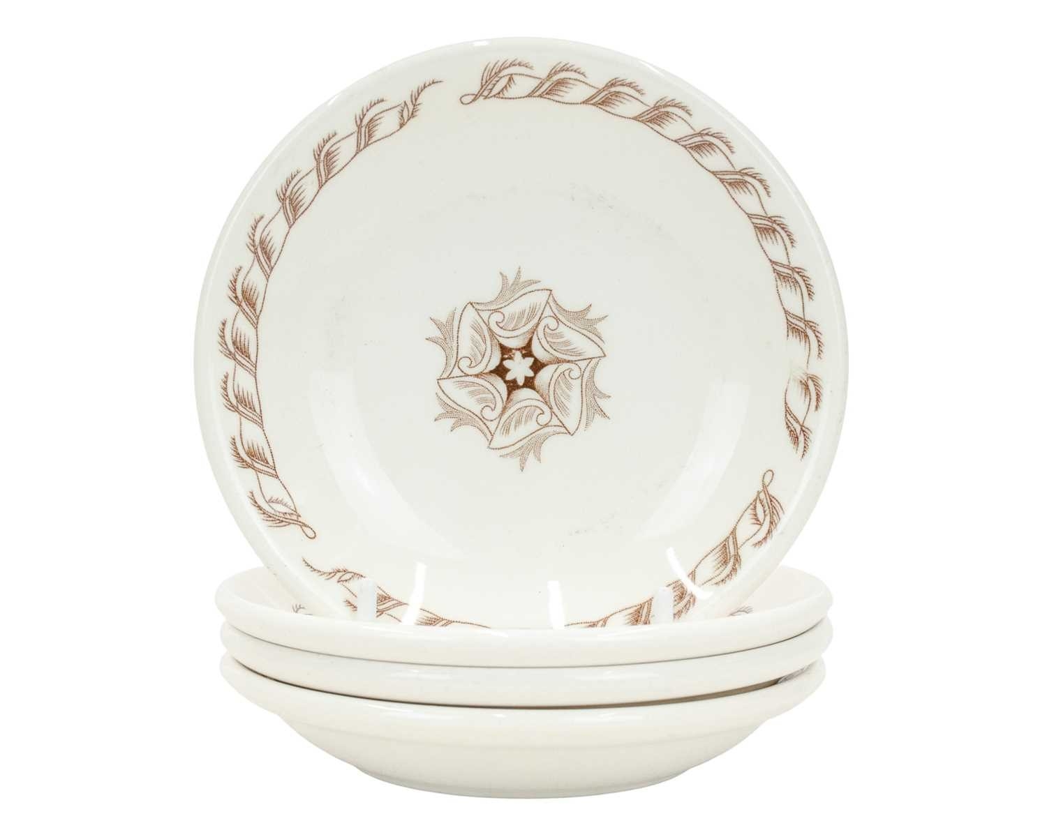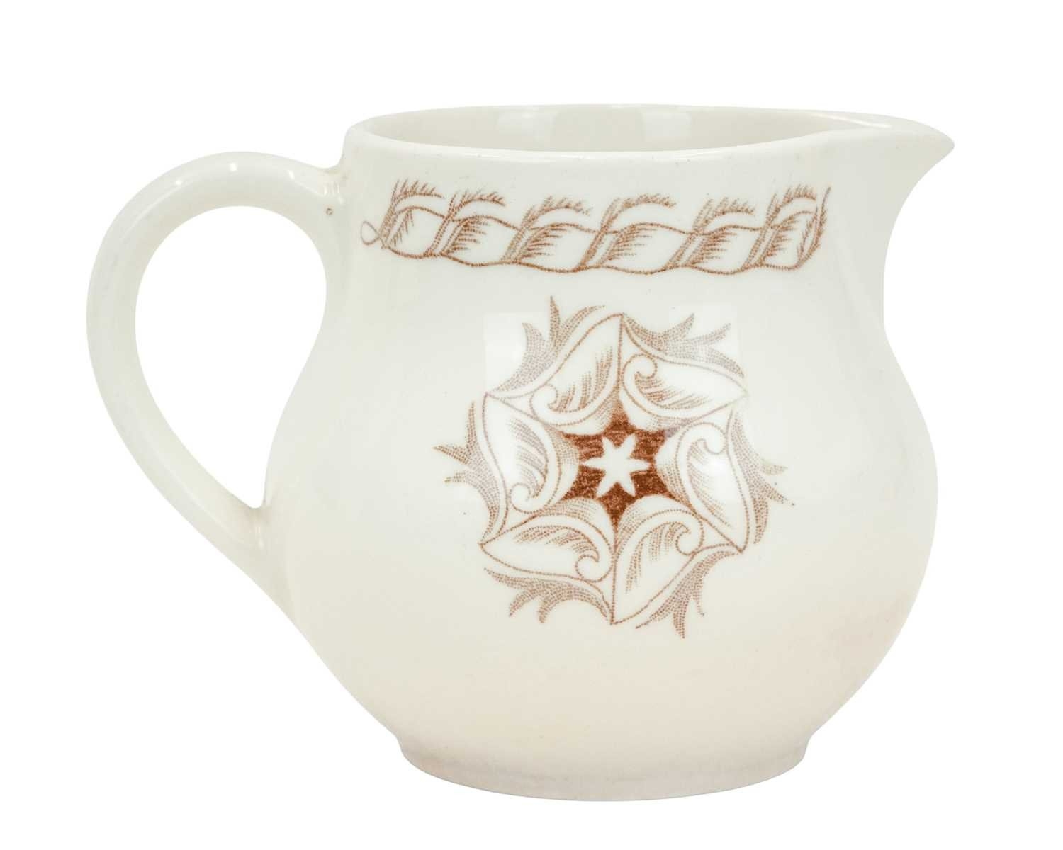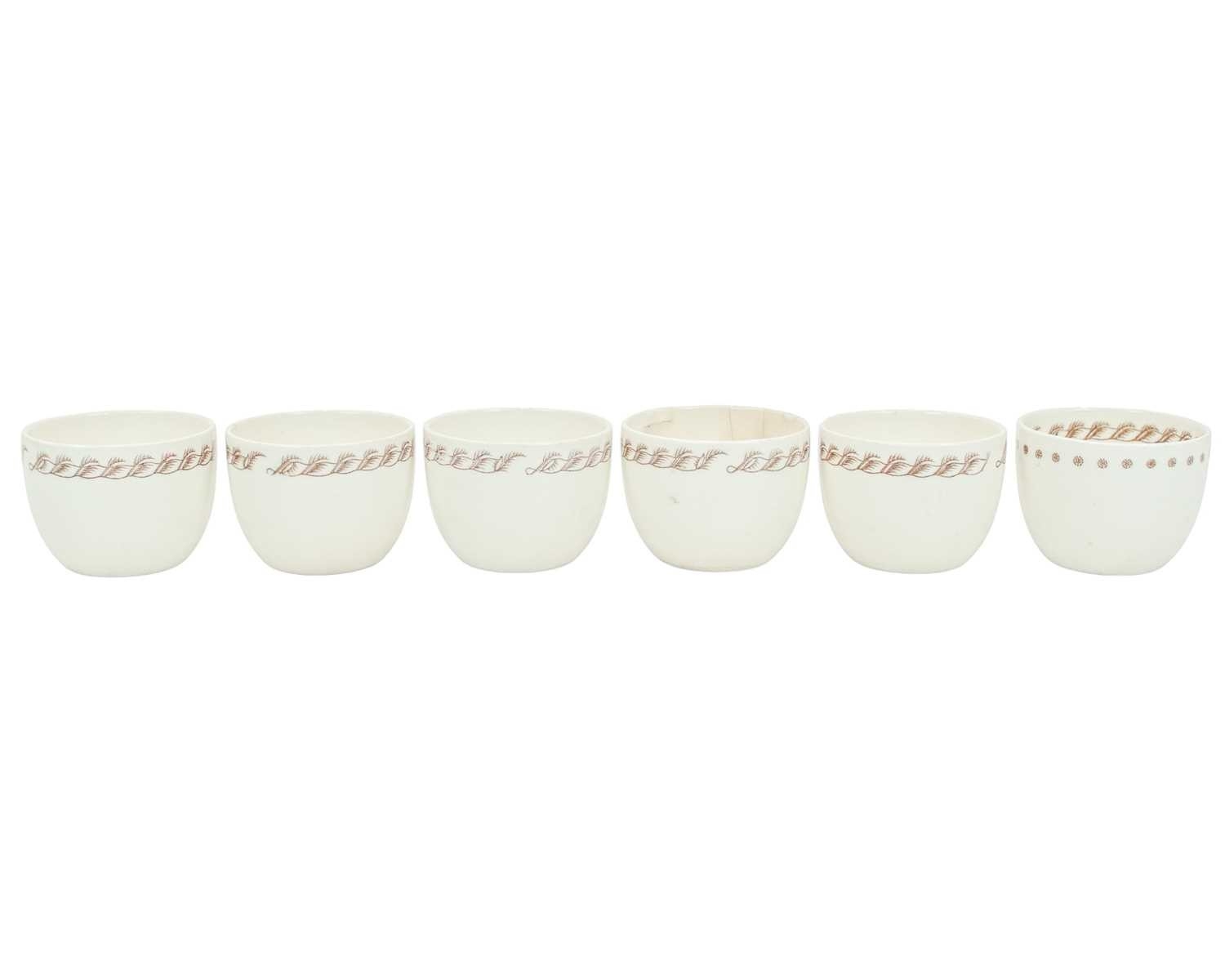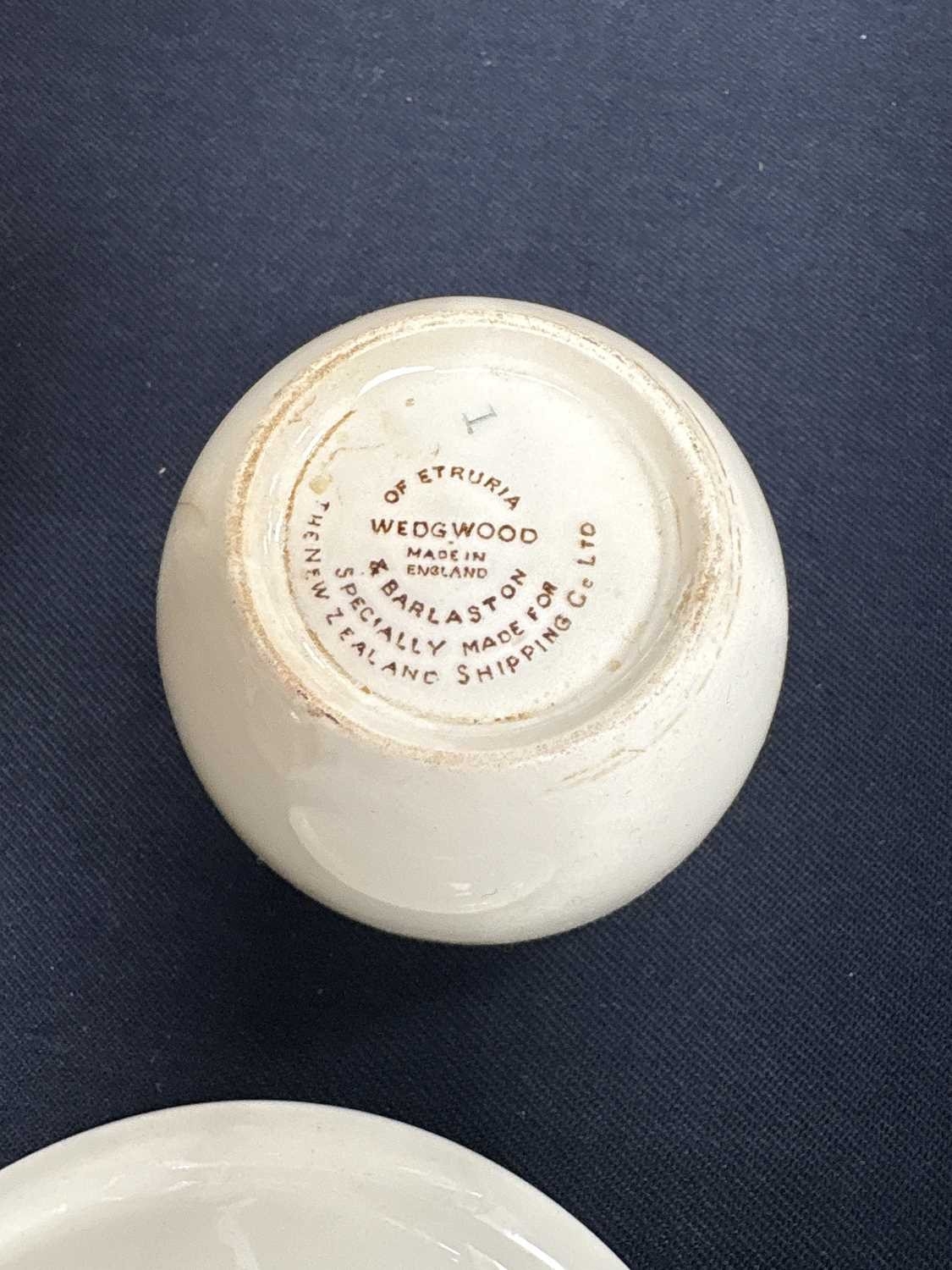 Wedgwood Edward Bawden tea ware specially made for the New Zealand Shipping Co. Comprising nine saucers, six small bowls, and a milk jug, printed marks, the saucers diameter 11cm. Two cups have cracks, and the jug is discoloured