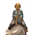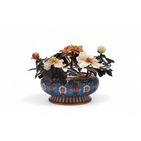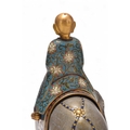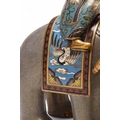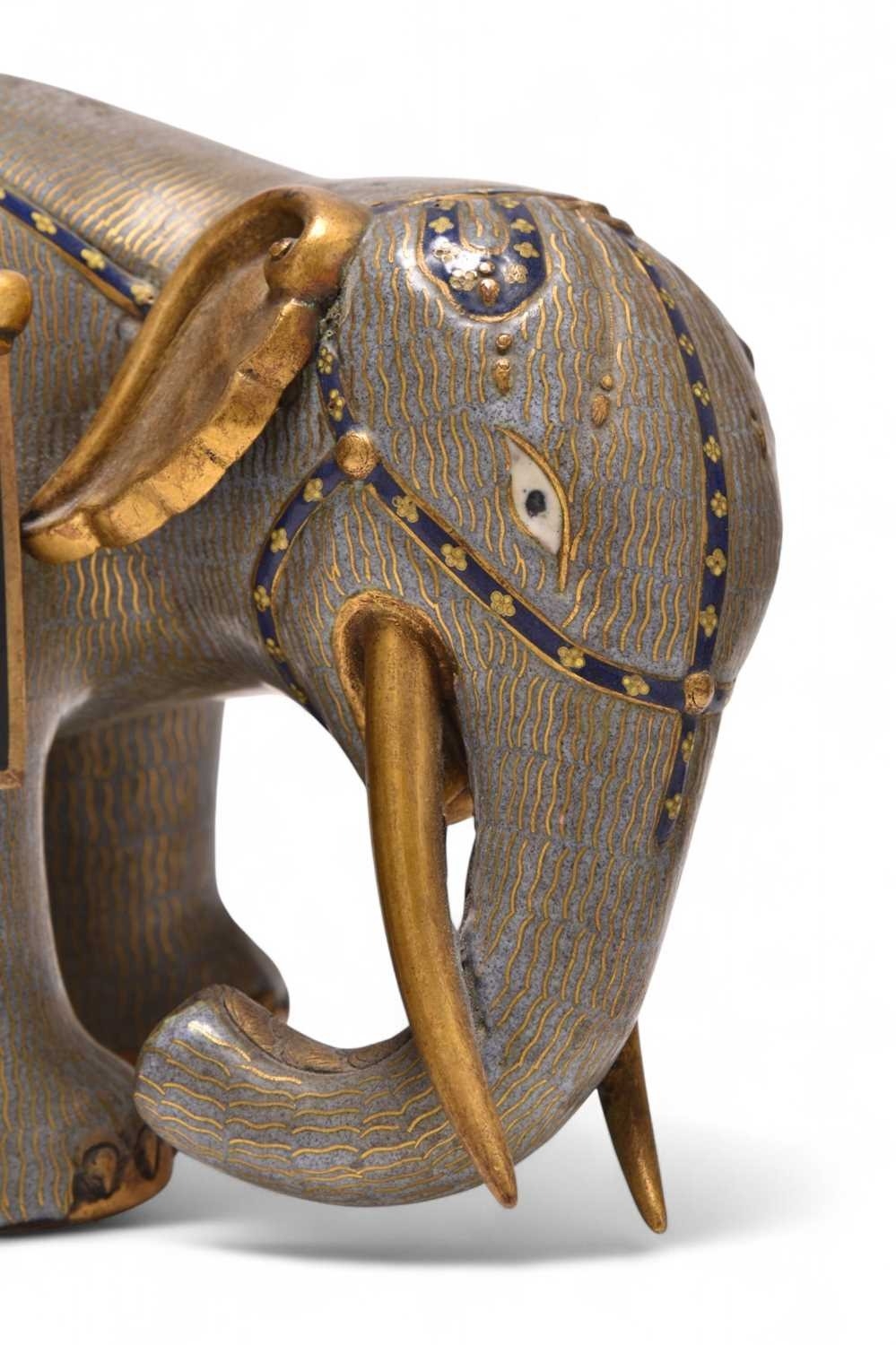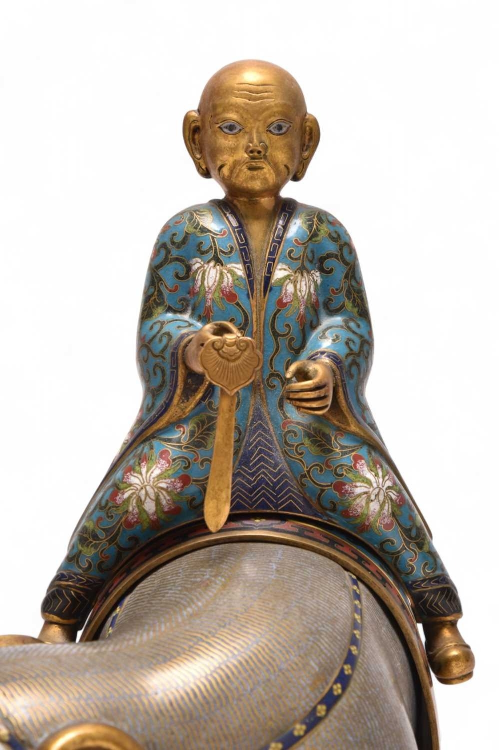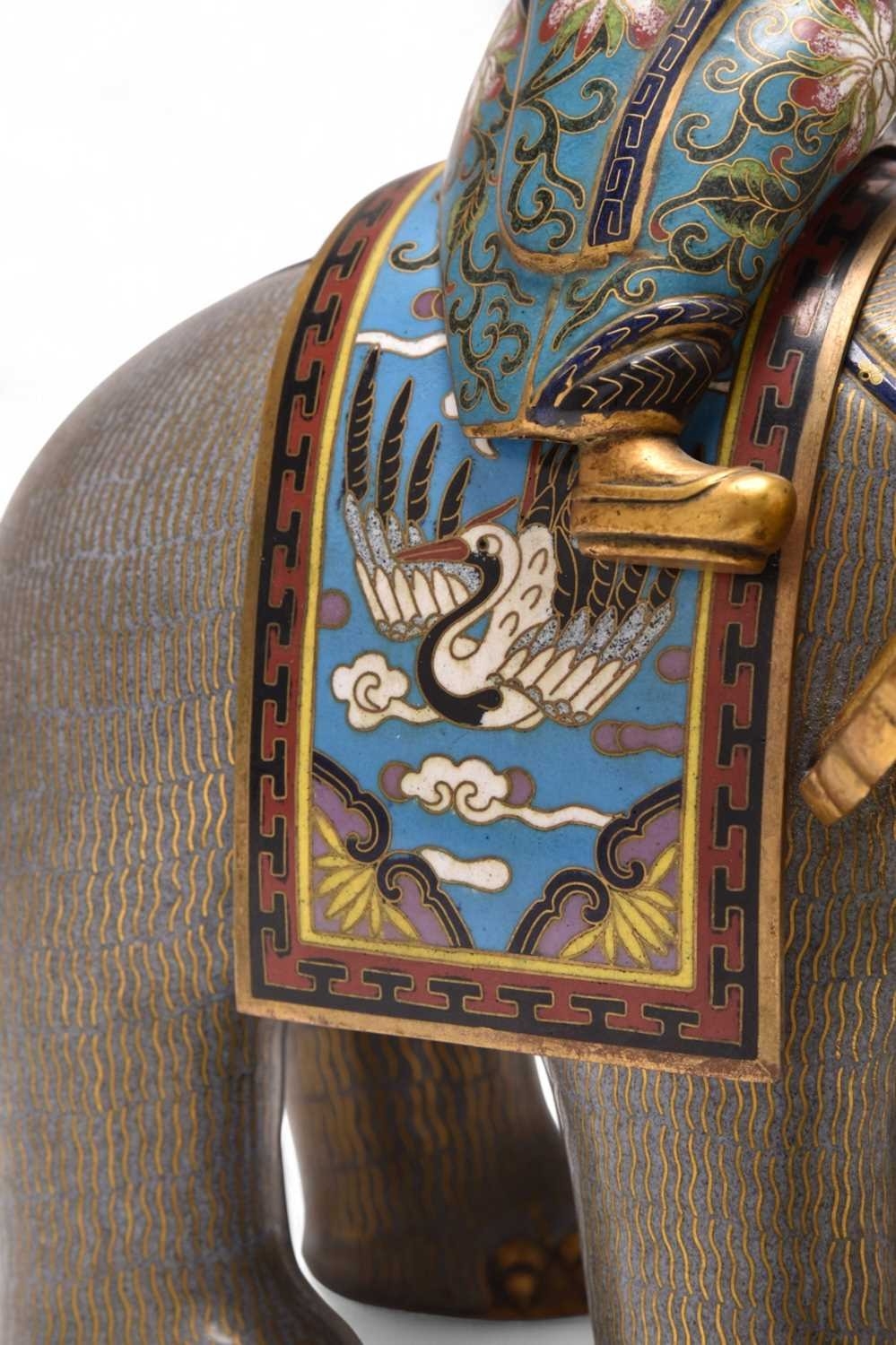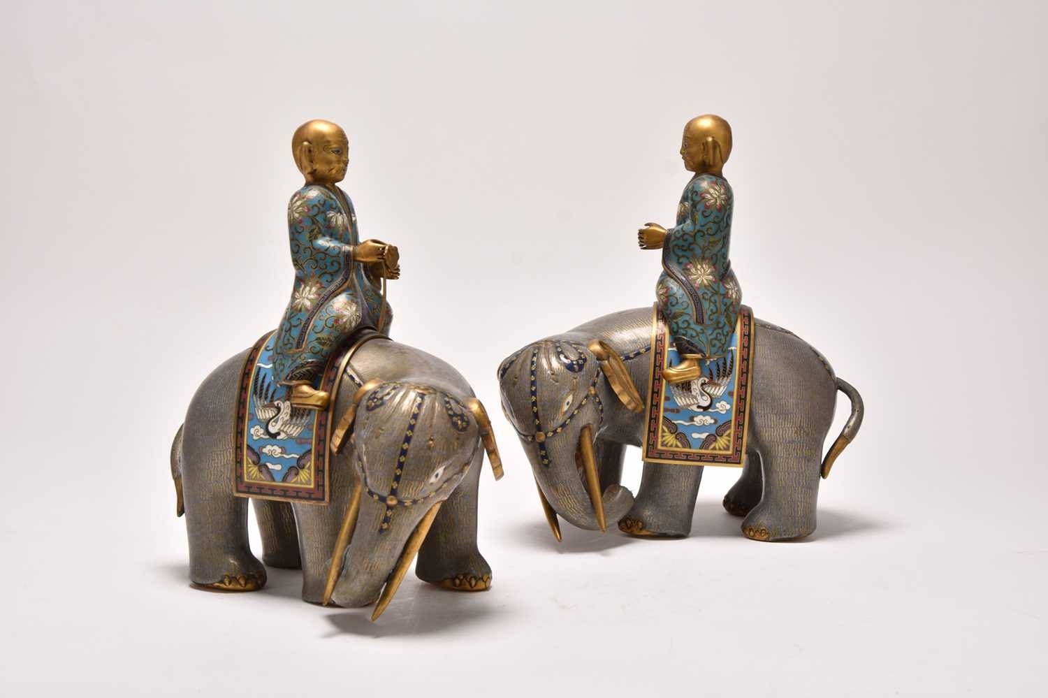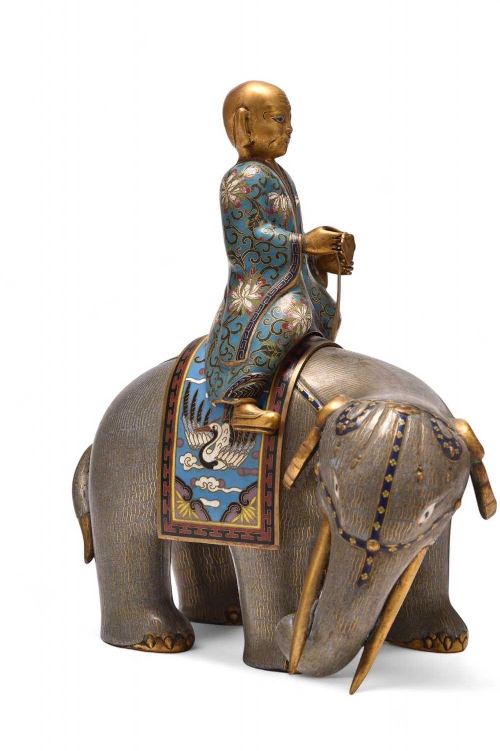A pair of Chinese cloisonne elephants and riders 19th Century The large mottled greyish lilac enamelled animals with gilt tusks and ears, each turning their heads left and right and wearing dark blue foliate harnesses, a saddle cloth over the beasts backs for the seated figures decorated with cranes in flight, the riders wearing long robes decorated with scrolling lotus on a turquoise ground and ogee brimmed gilt hats, one holding a ruyi-septre in his hand, all detachable. 30cm high (2) Provenance:Private Cheshire collection. Footnote:A near identical pair were sold at Christie's South Kensington rooms, 8 November 2001, lot 130. See also a similar pair sold in the same rooms, 30 November 2008, lot 174.