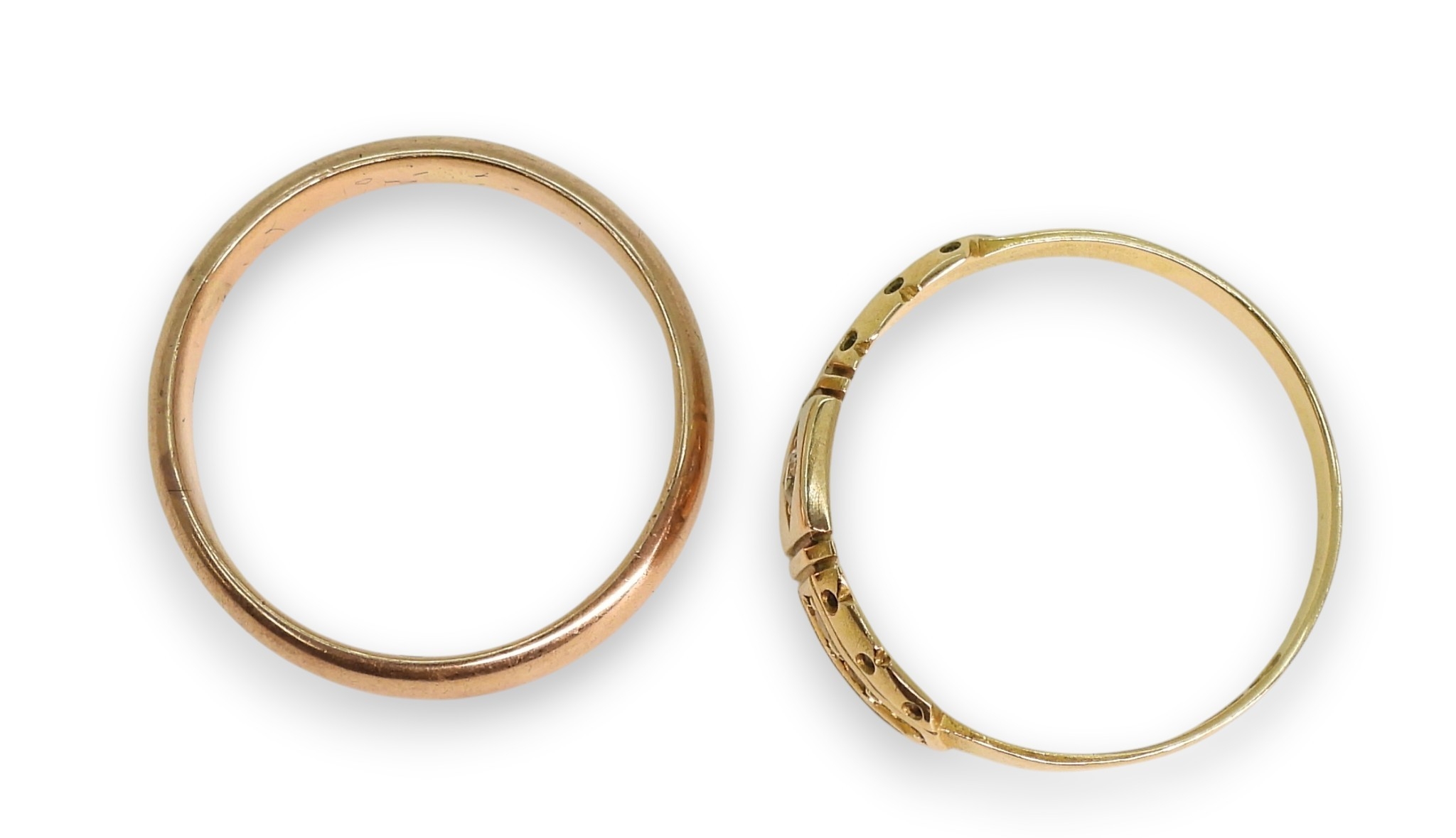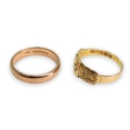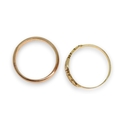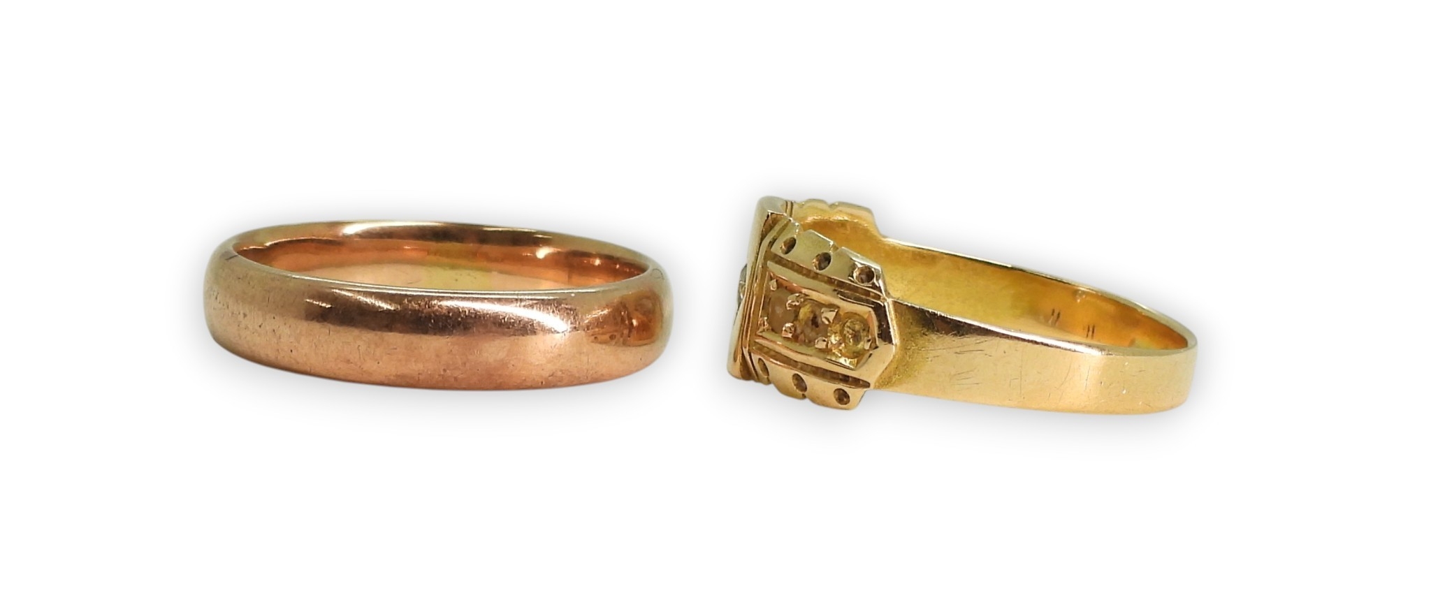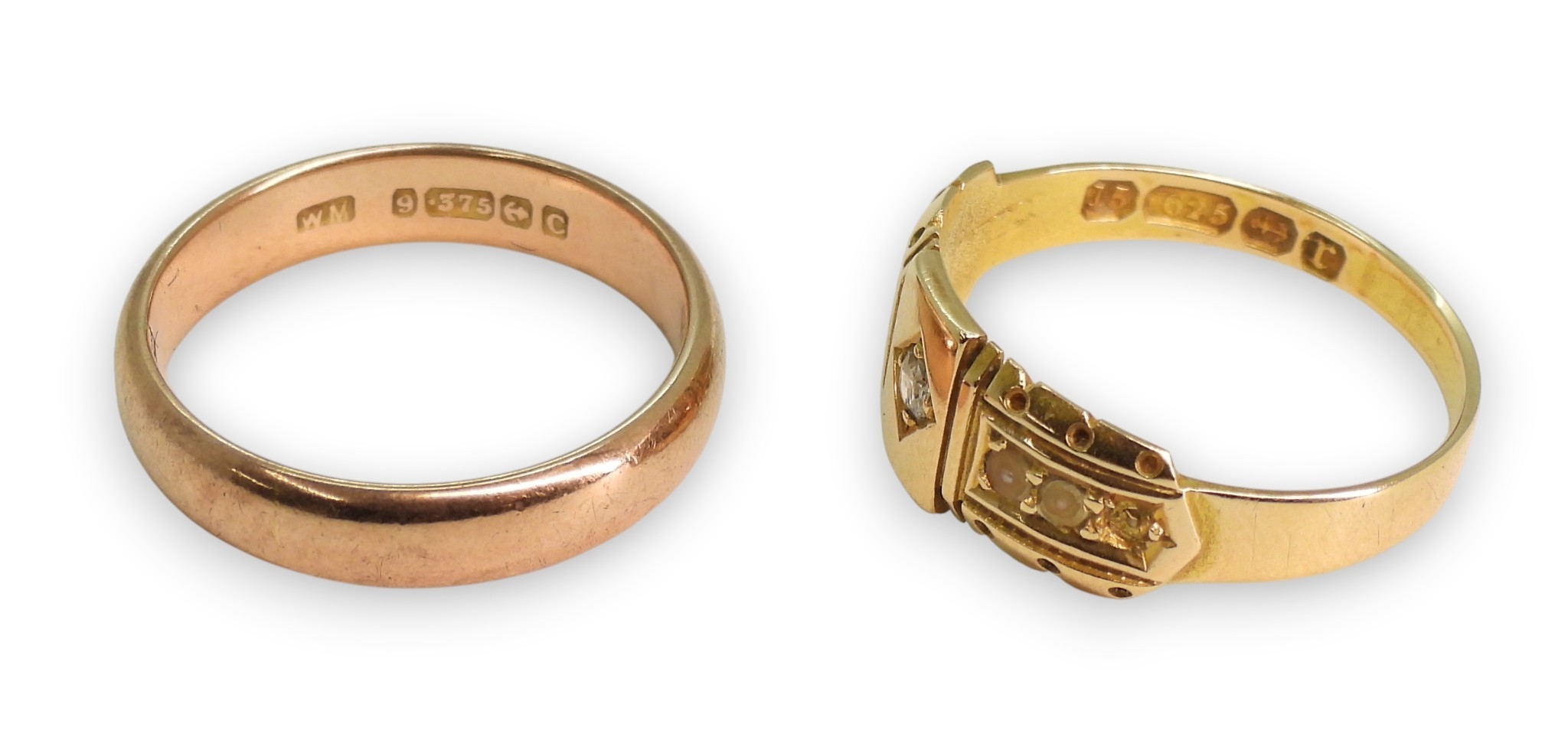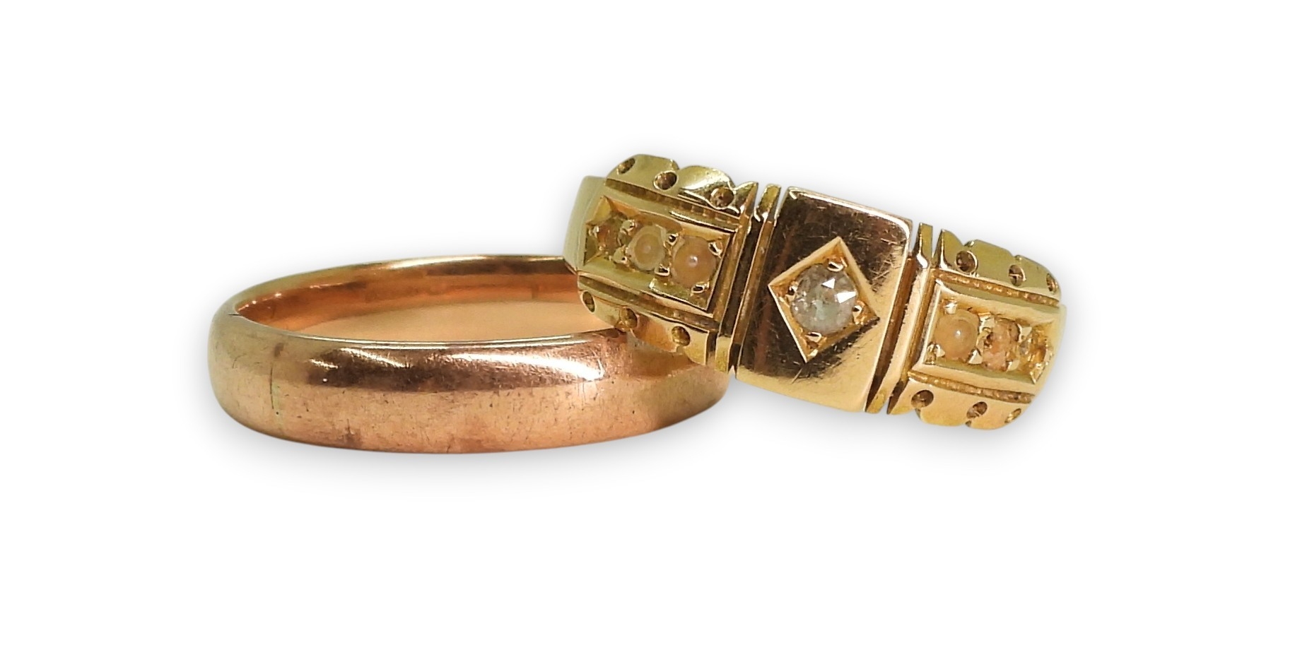 A 15ct gold pearl & diamond ring, size P1/2, hallmarked Birmingham 1891, weight 2.4gms, a 9ct rose gold wedding ring size O, hallmarked Birmingham 1902, weight 3.2gms