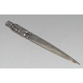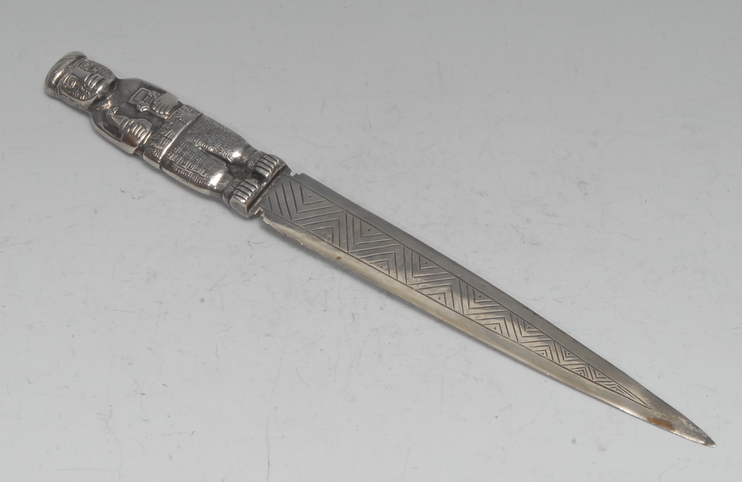 A South American silver novelty letter knife, the haft as a Pre-Columbian Peruvian figure, 28cm long, marked 925