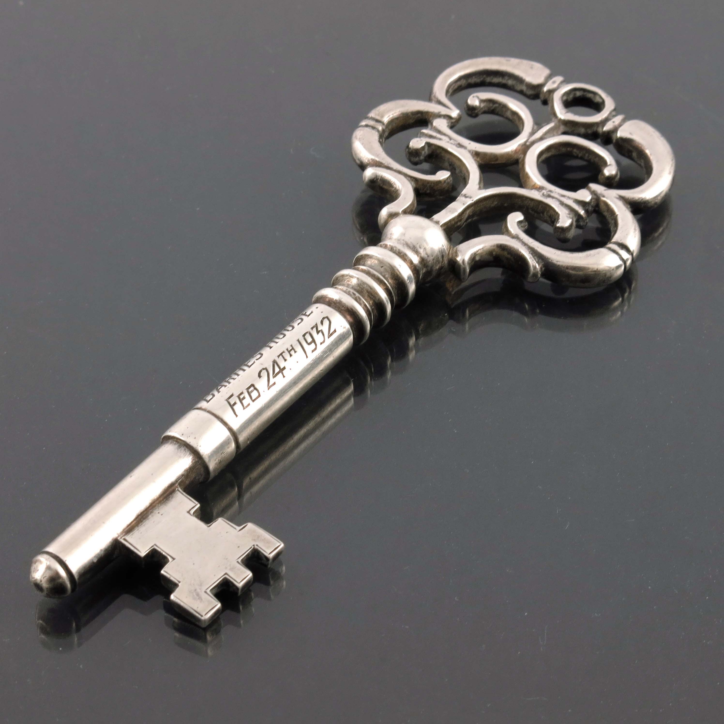 A George V commemorative silver key, Toye and Co., London 1931, with reticulated interlocking C scroll terminal and turned shaft, inscribed Barnes House, Feb 24th 1932, 10cm long, 1.17ozt