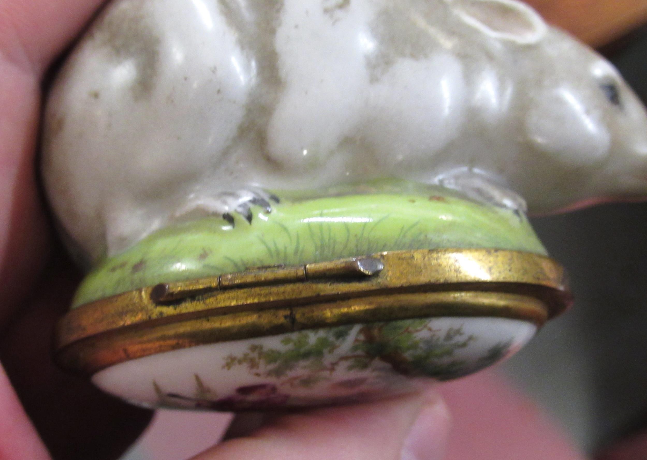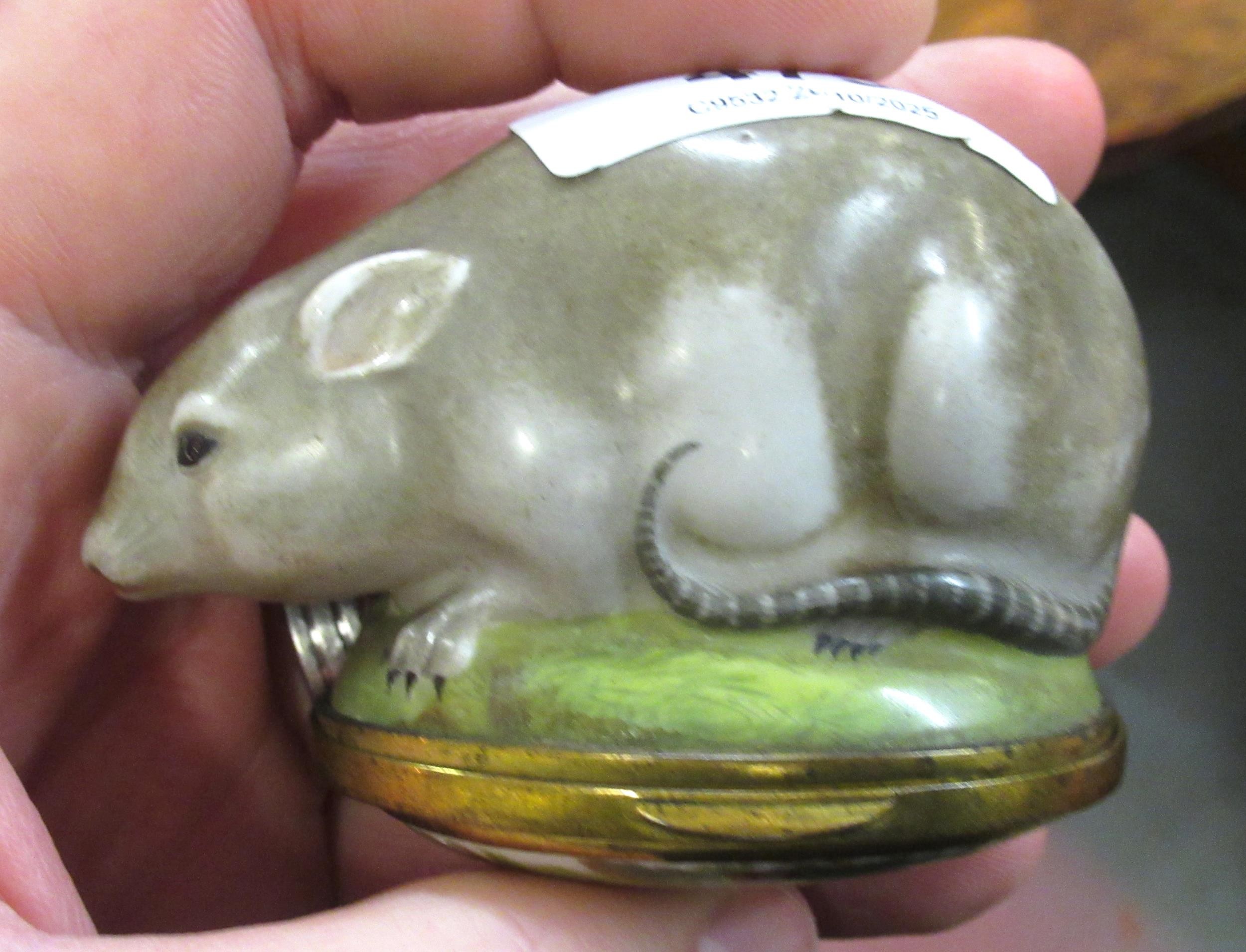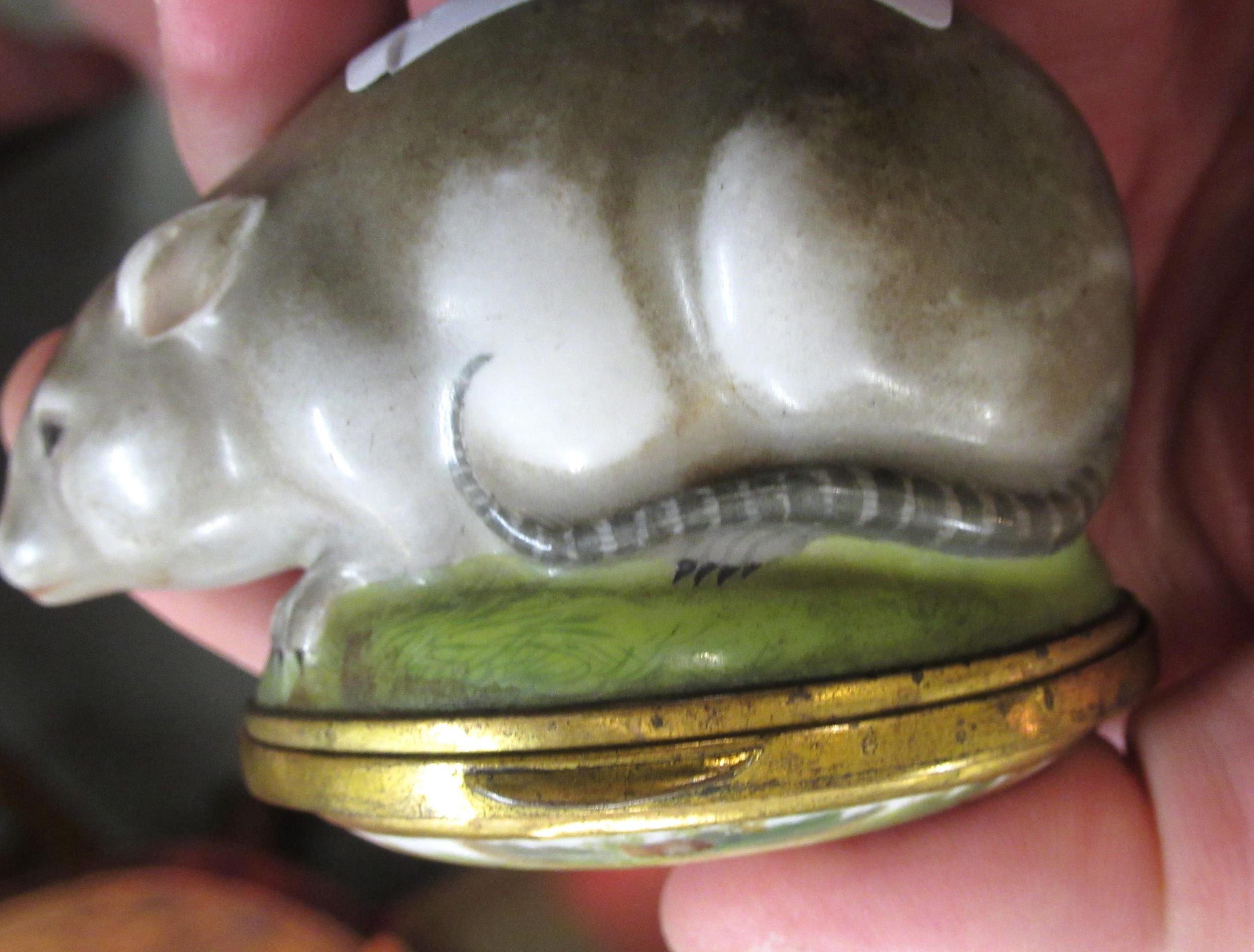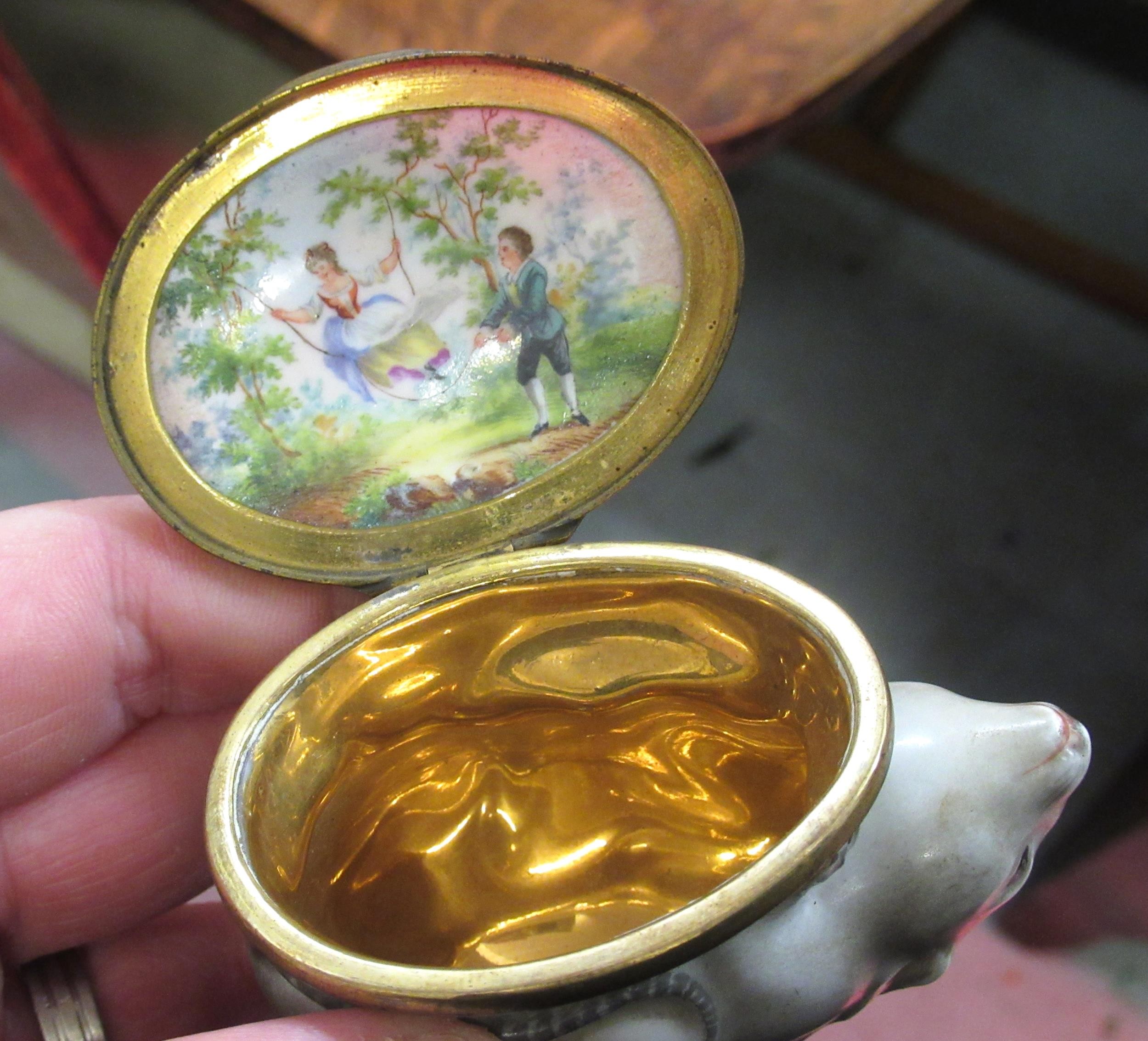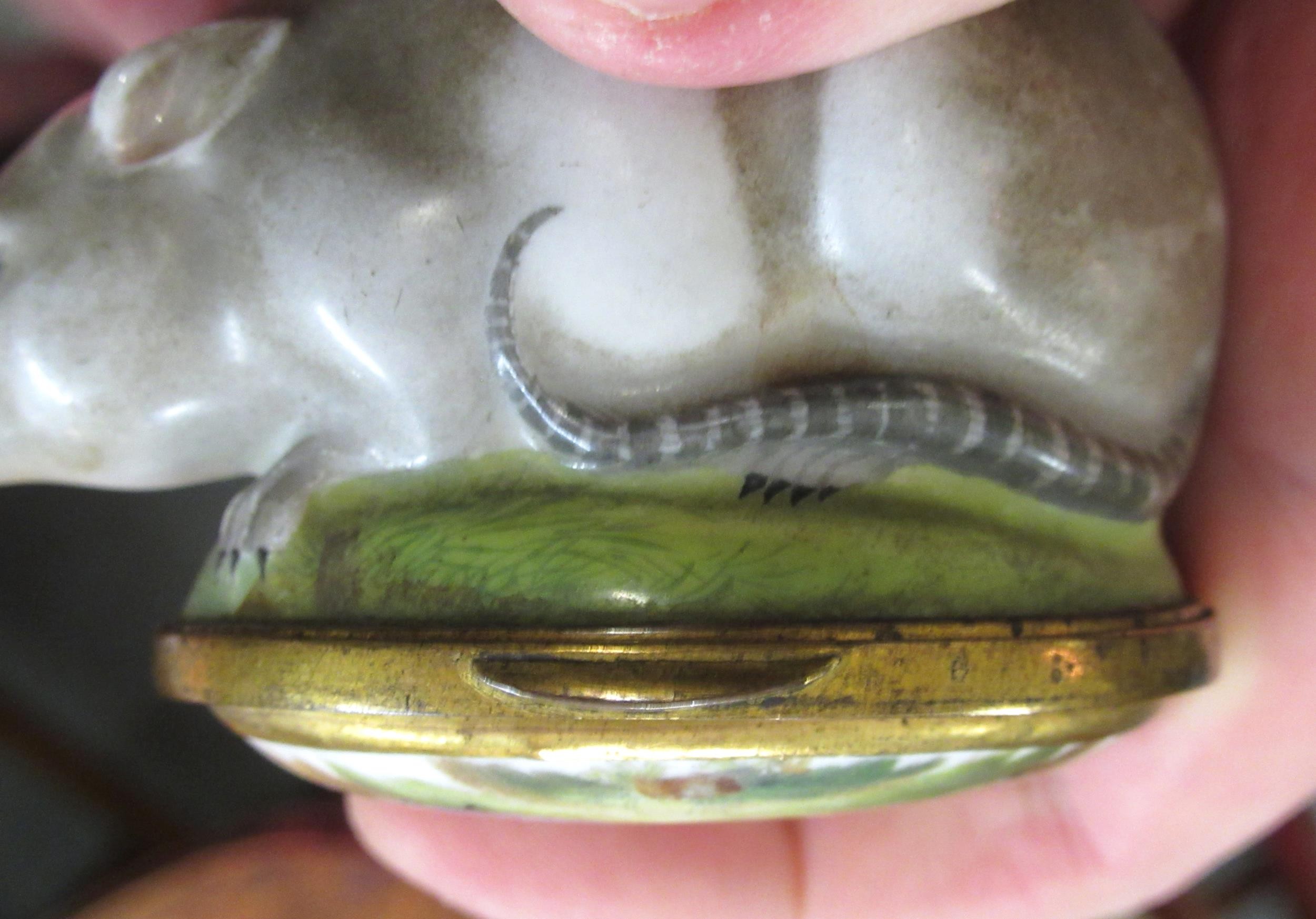 19th Century Continental porcelain and enamel snuff or sweetmeat box in the form of a mouse or rat, the hinged cover painted internally and externally with figures in garden scenes, 7.5cm wide