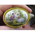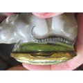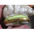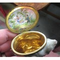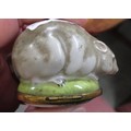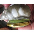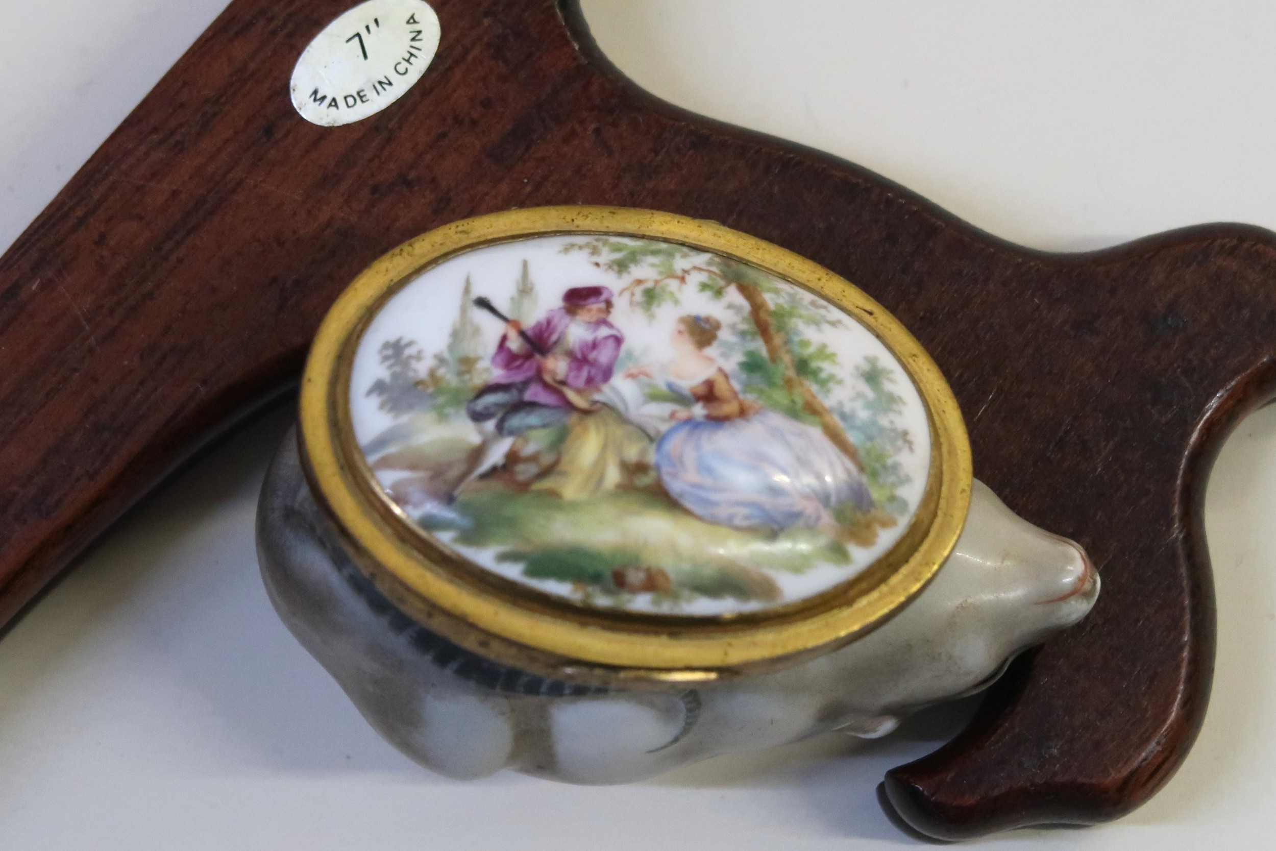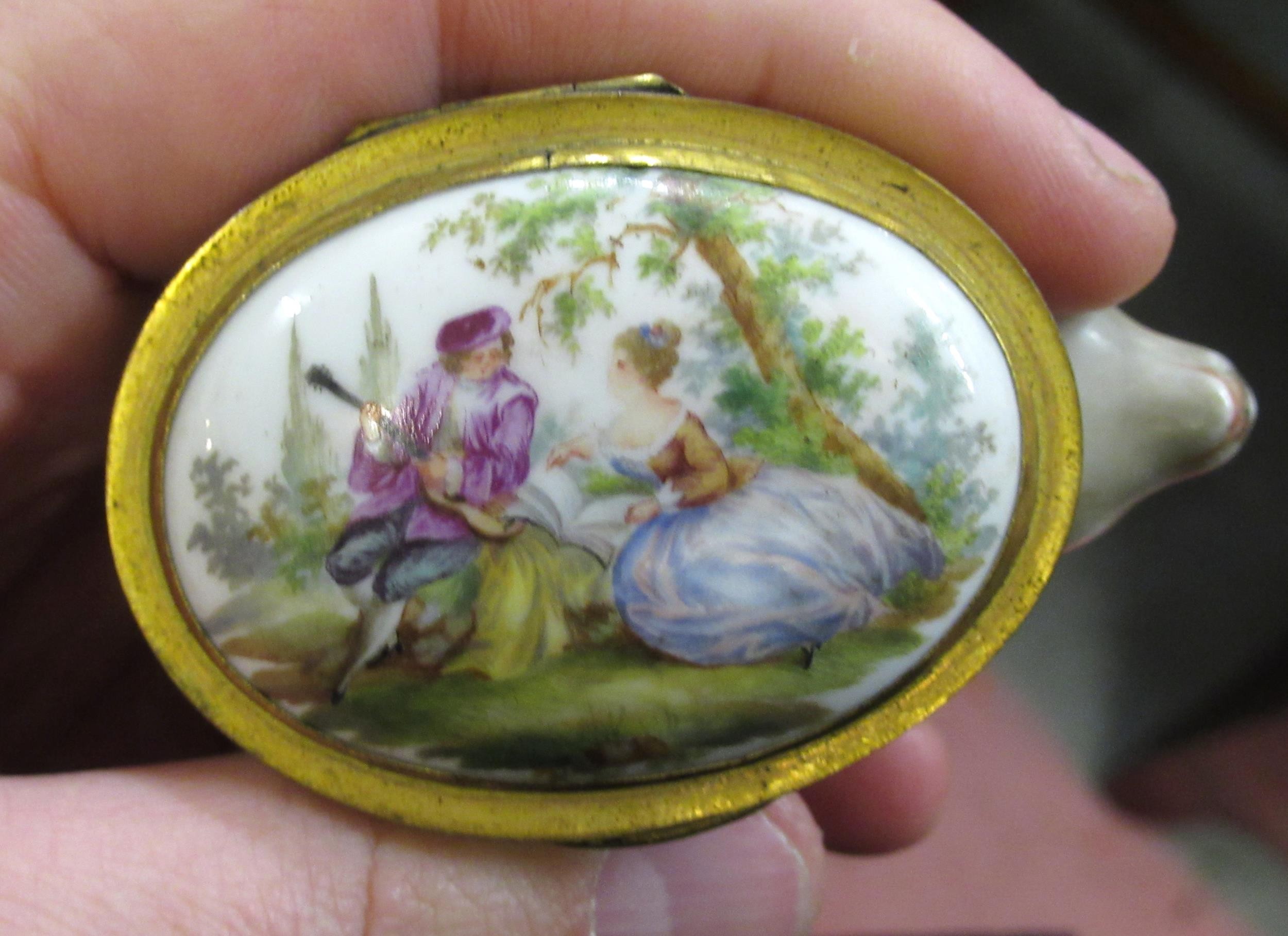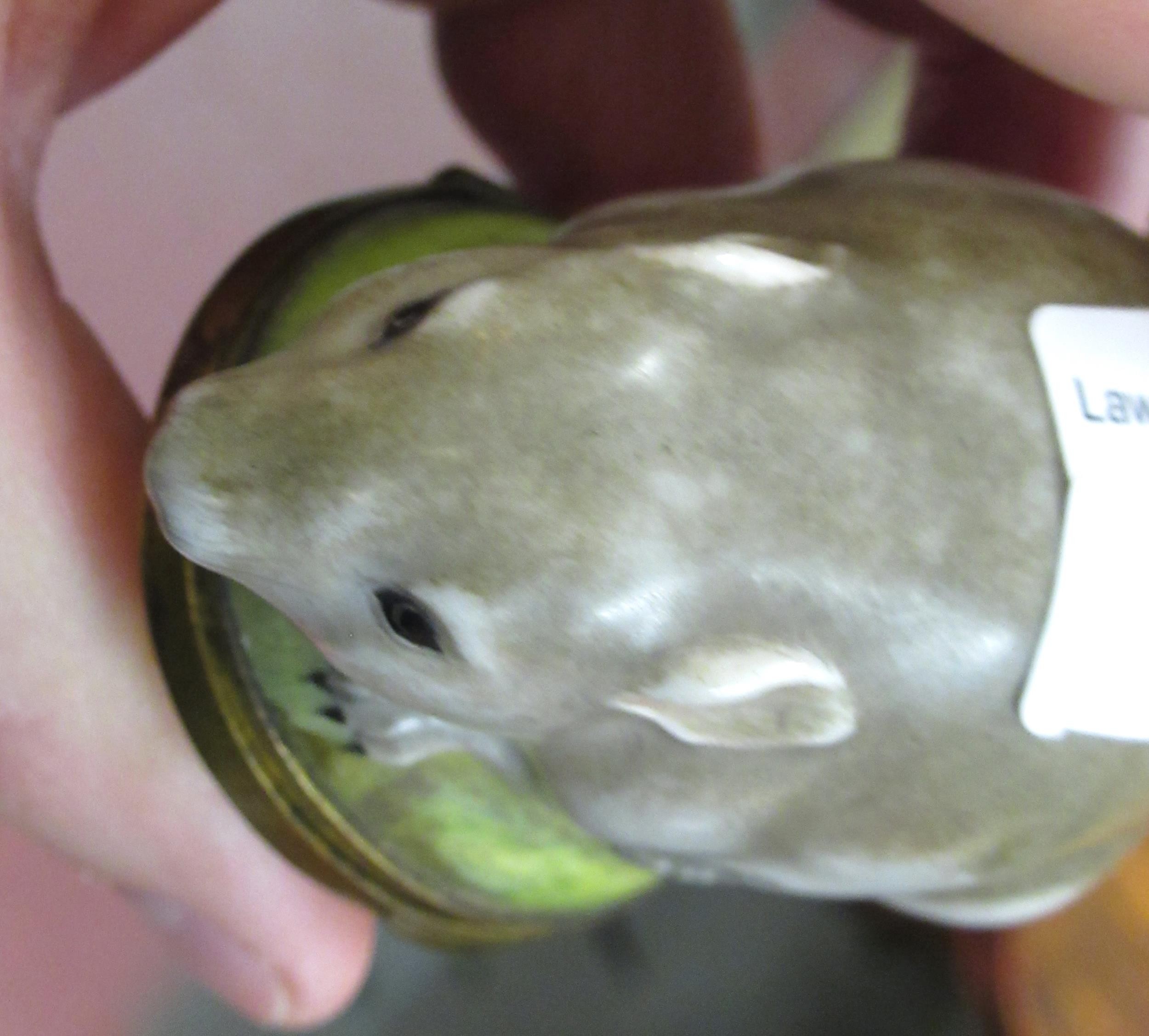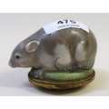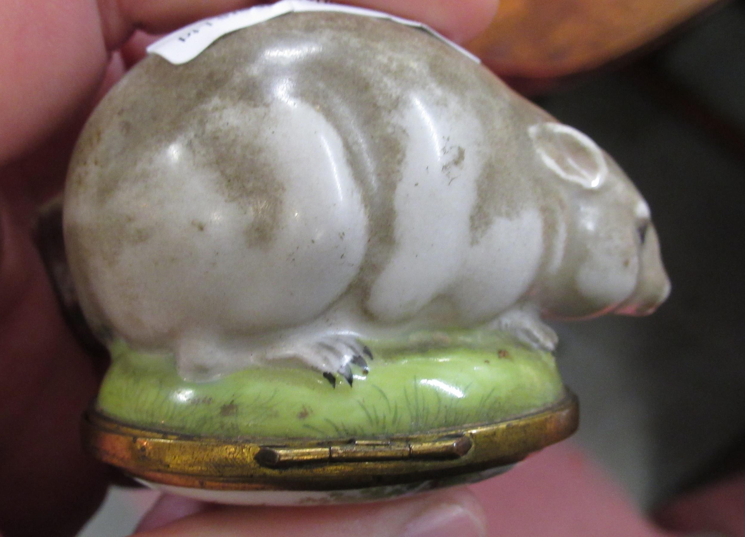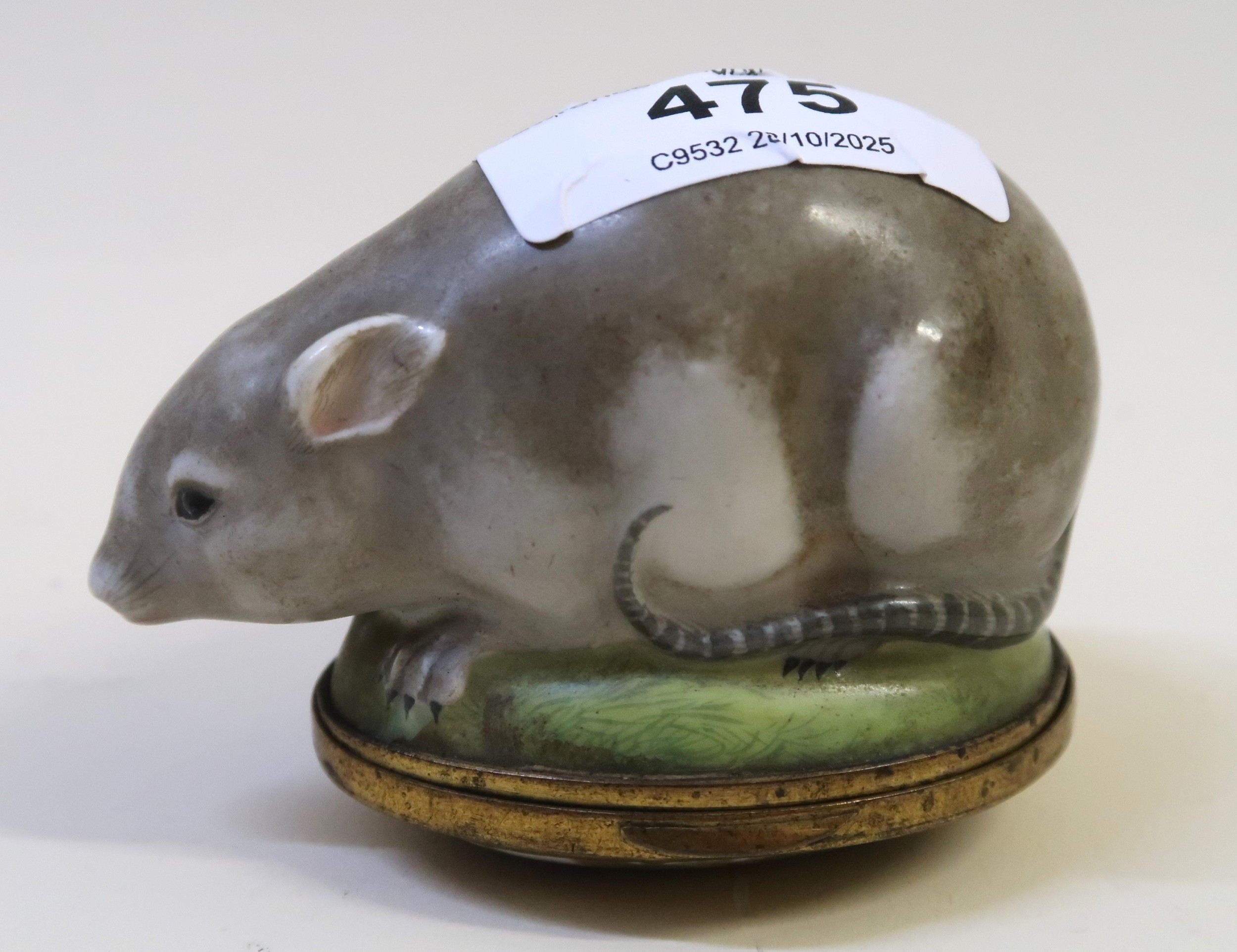 19th Century Continental porcelain and enamel snuff or sweetmeat box in the form of a mouse or rat, the hinged cover painted internally and externally with figures in garden scenes, 7.5cm wide