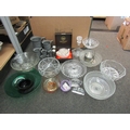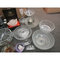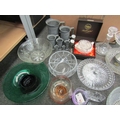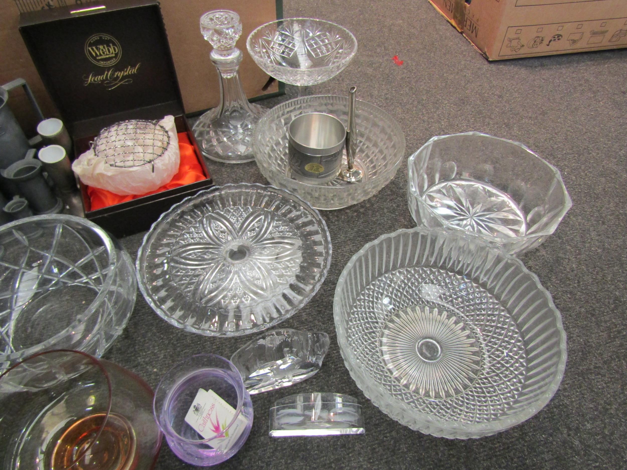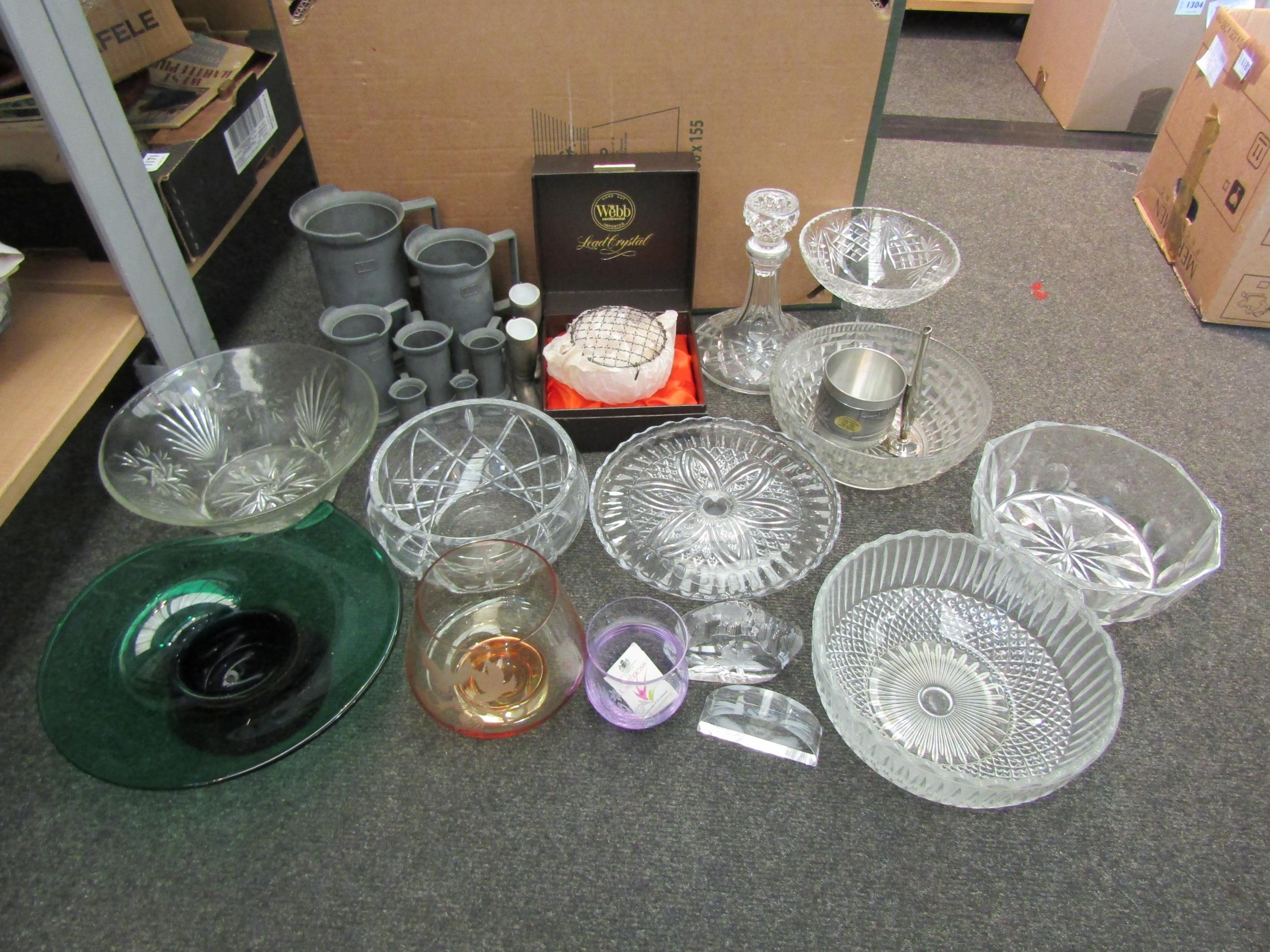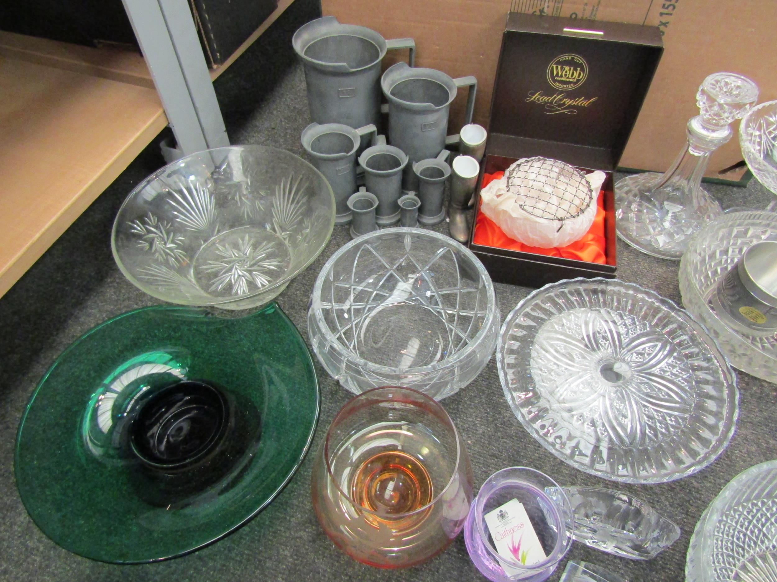A collection of glassware including bowls, Caithness, decanter, etc., and pewter measuring jugs